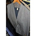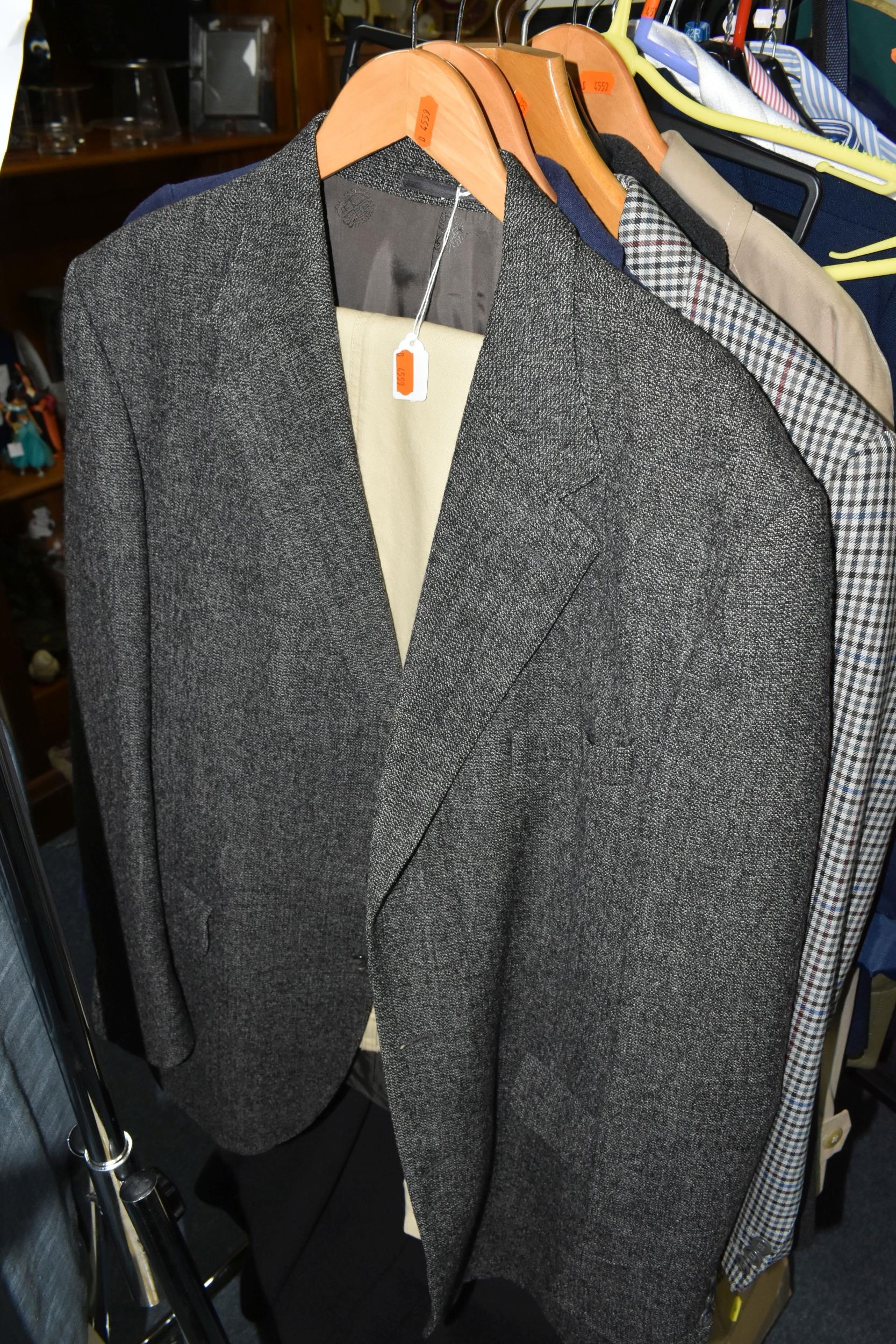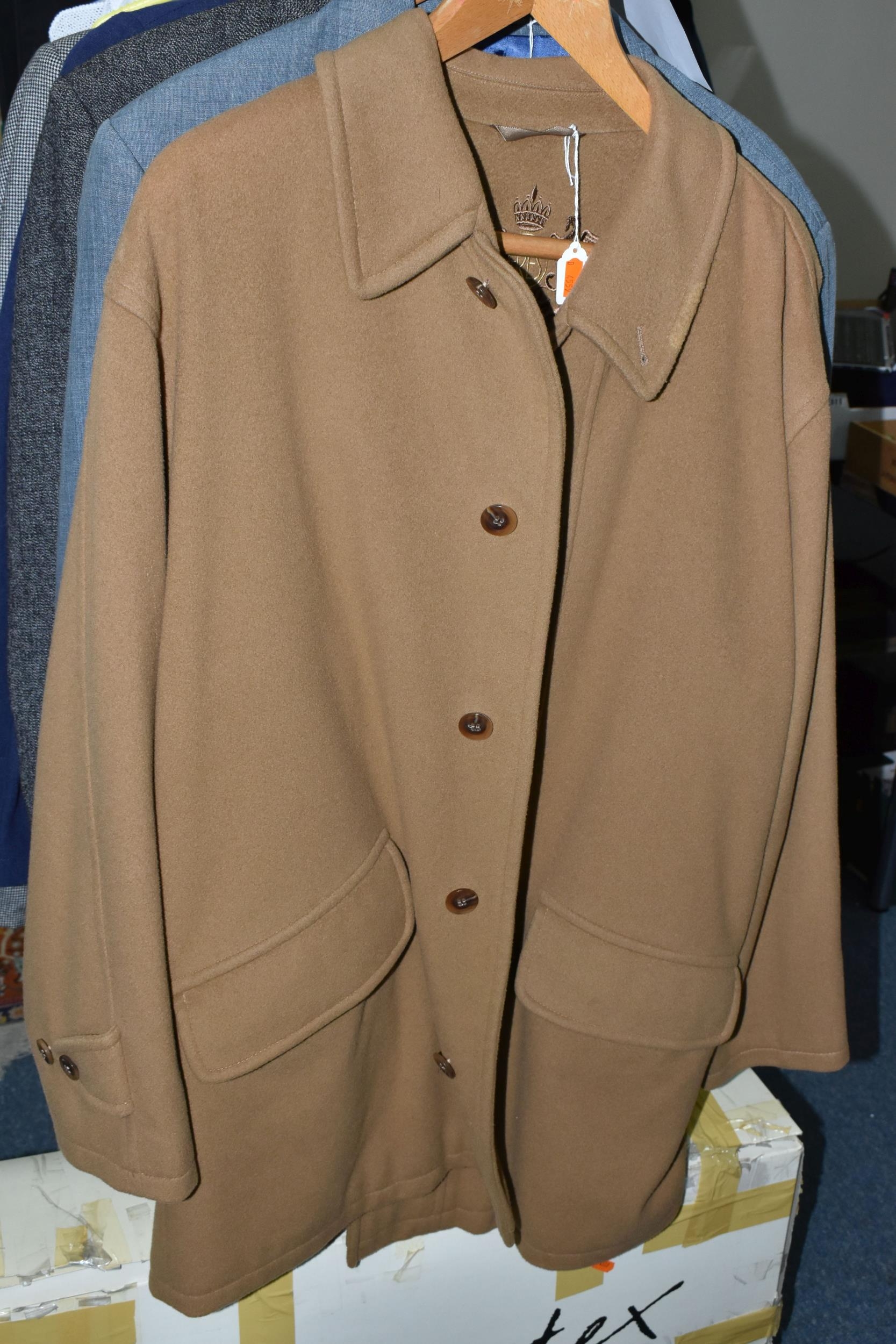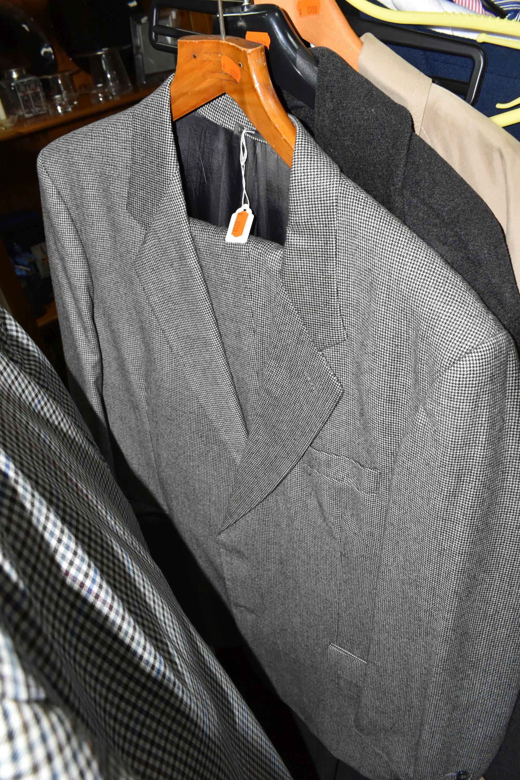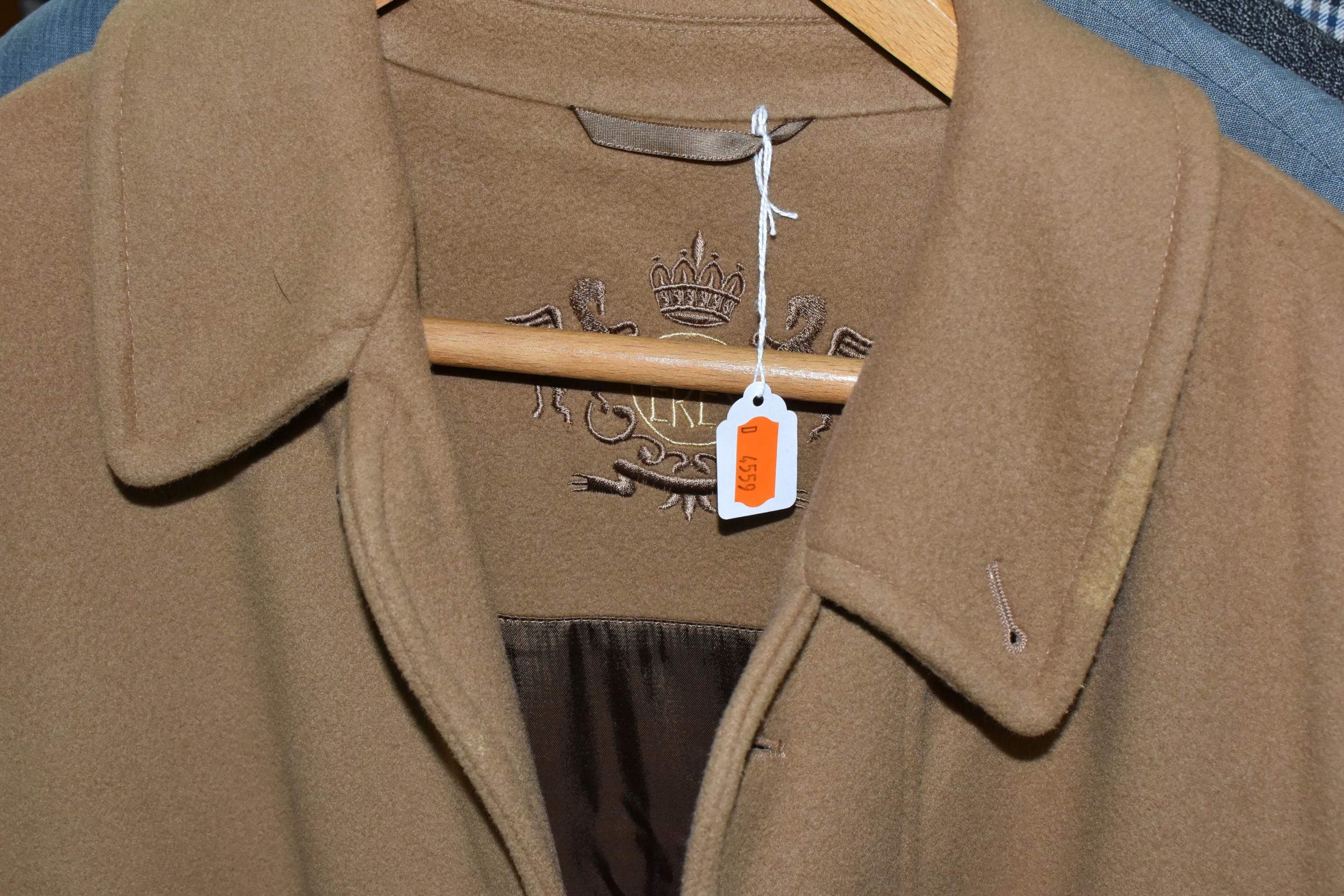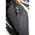 A SMALL QUANTITY OF LADIES AND GENTS CLOTHING ETC, comprising a Berketex size 10 wedding dress, Eres cashmere blend ladies coat approximate size 14/16, men's clothing includes a grey Crombie jacket -42, Rohan blue linen jacket - 44, Jaeger checked jacket - 54r, Jaeger houndstooth two piece suit - jacket 54r trousers 54r, Bugatti 95% wool coat - 40r, Rainman overcoat - 42r and four pairs of trouser, waist size 38, clothes appear to be in good condition
