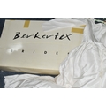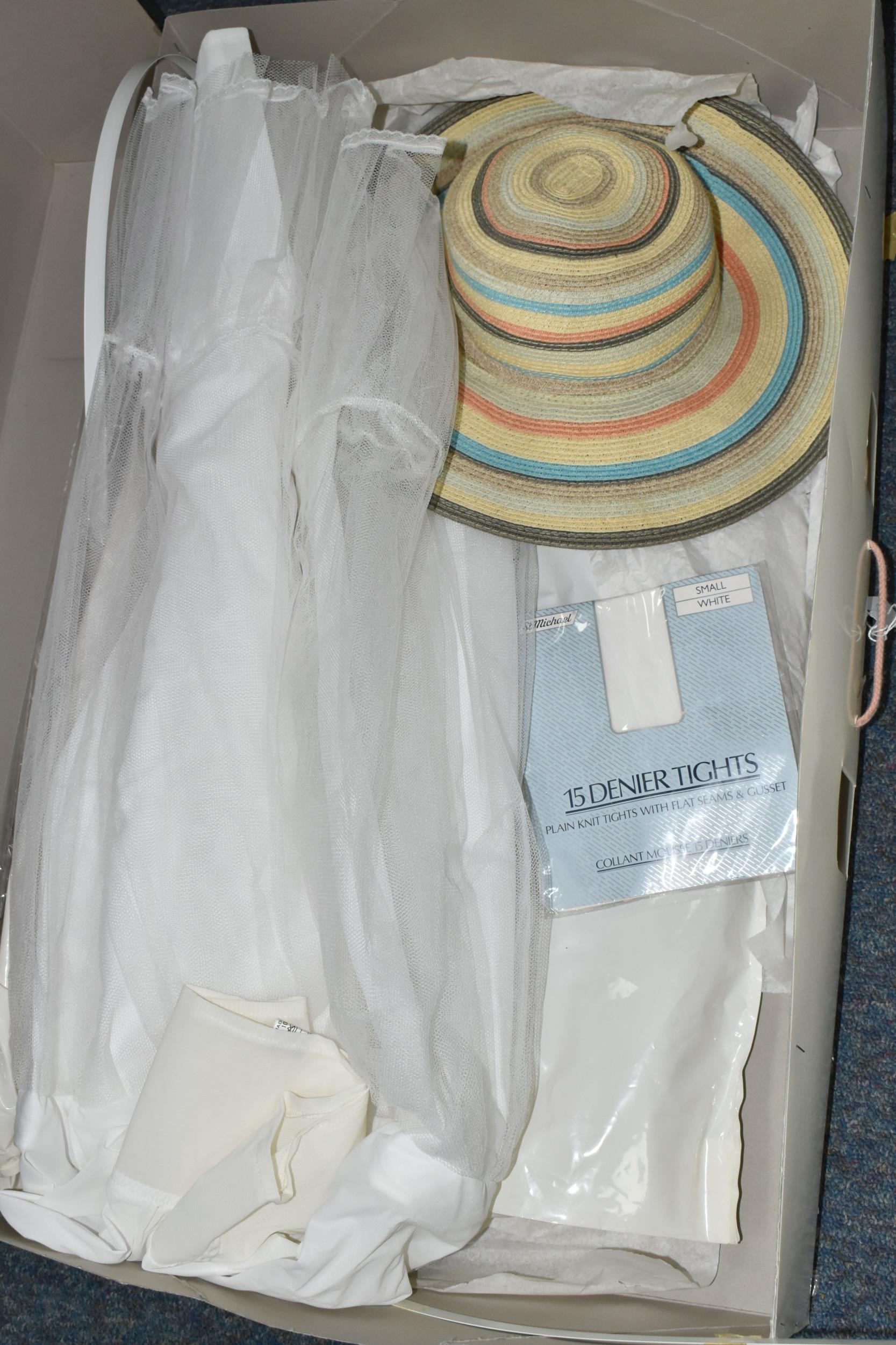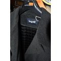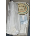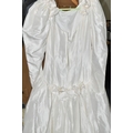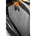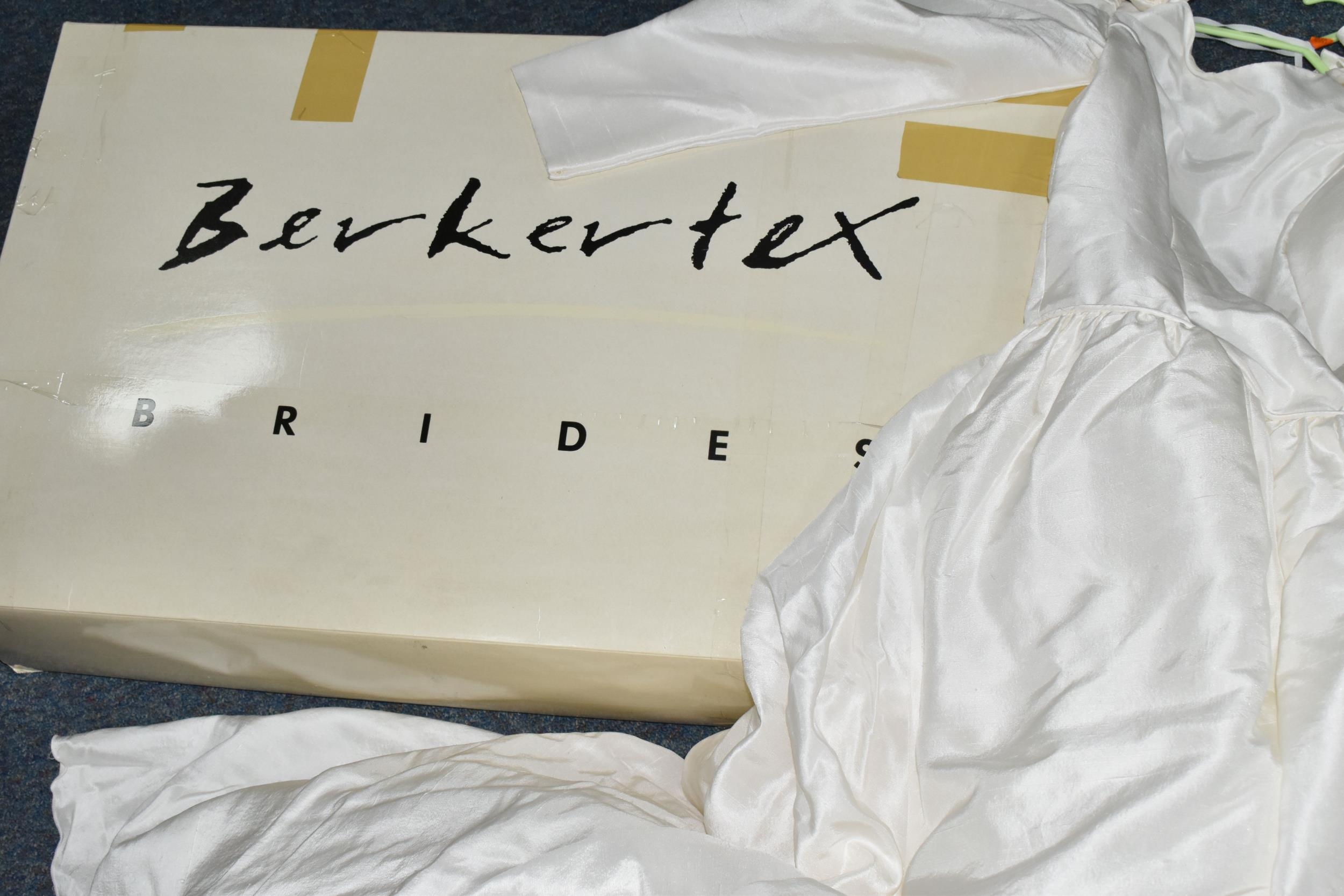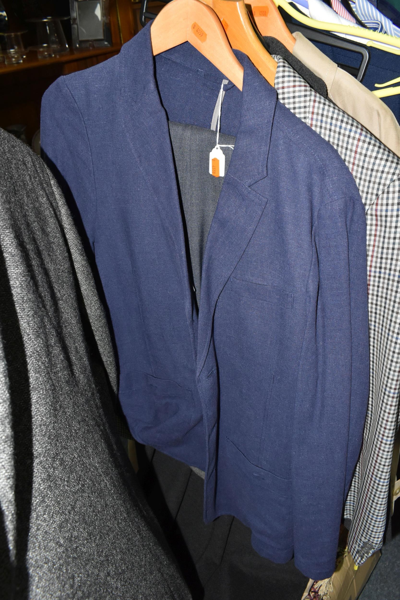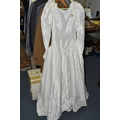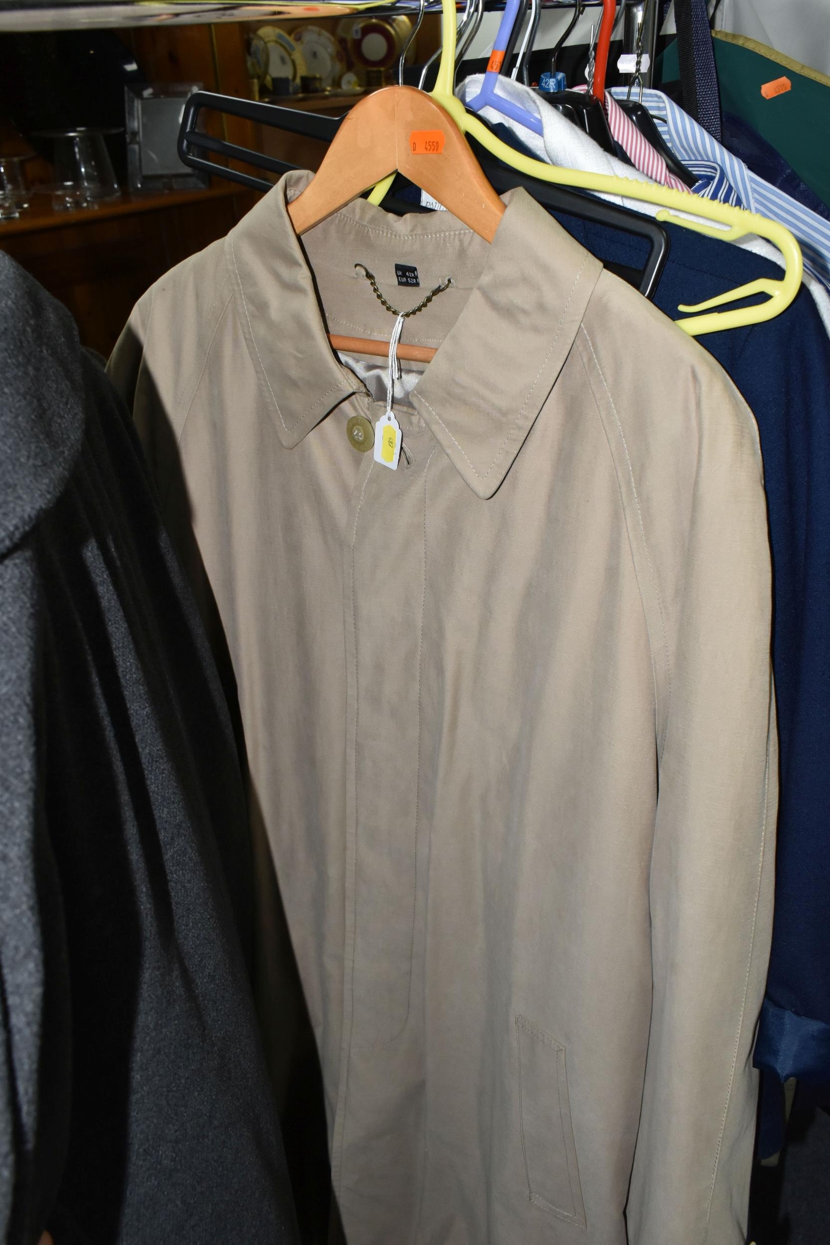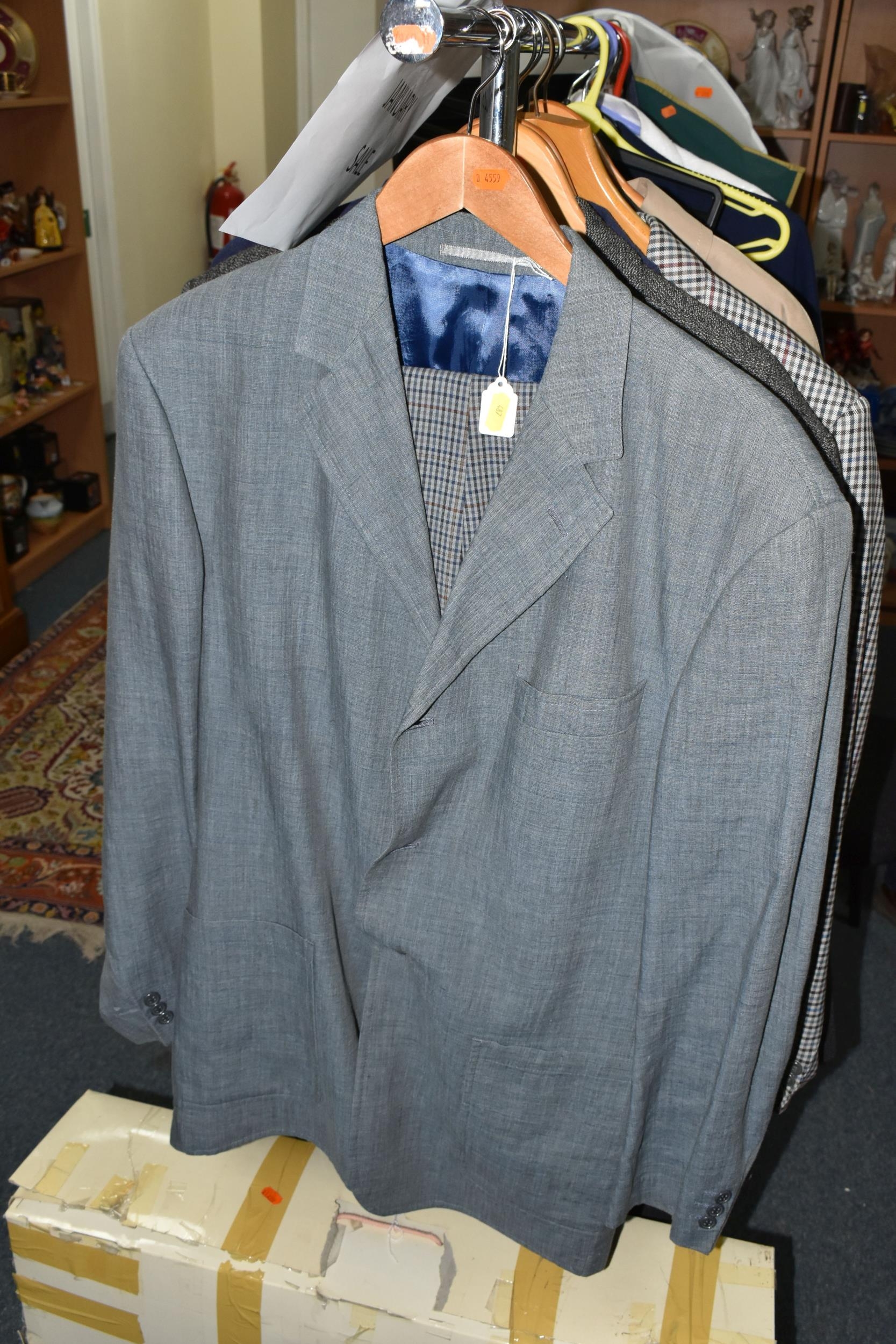 A SMALL QUANTITY OF LADIES AND GENTS CLOTHING ETC, comprising a Berketex size 10 wedding dress, Eres cashmere blend ladies coat approximate size 14/16, men's clothing includes a grey Crombie jacket -42, Rohan blue linen jacket - 44, Jaeger checked jacket - 54r, Jaeger houndstooth two piece suit - jacket 54r trousers 54r, Bugatti 95% wool coat - 40r, Rainman overcoat - 42r and four pairs of trouser, waist size 38, clothes appear to be in good condition