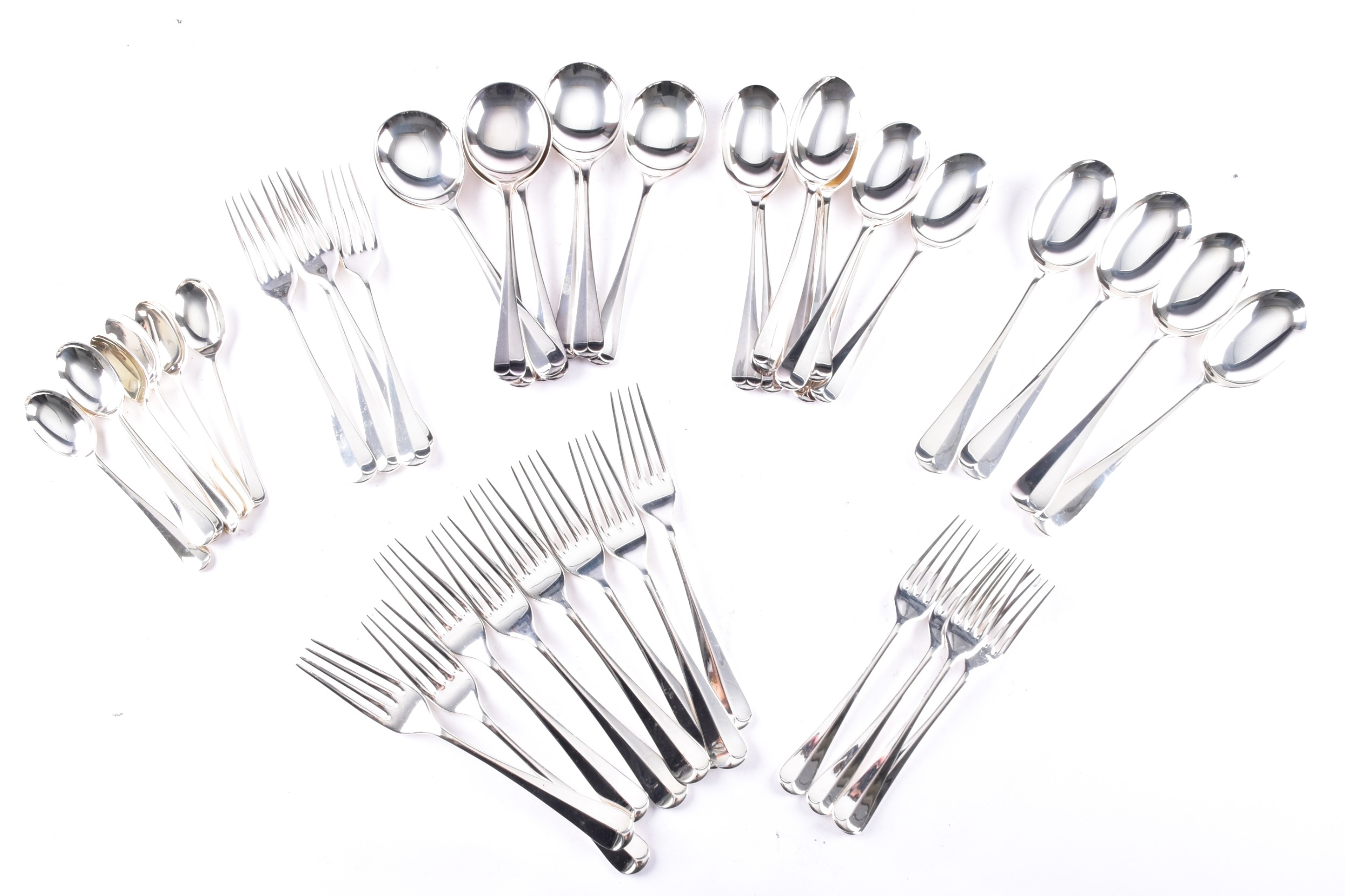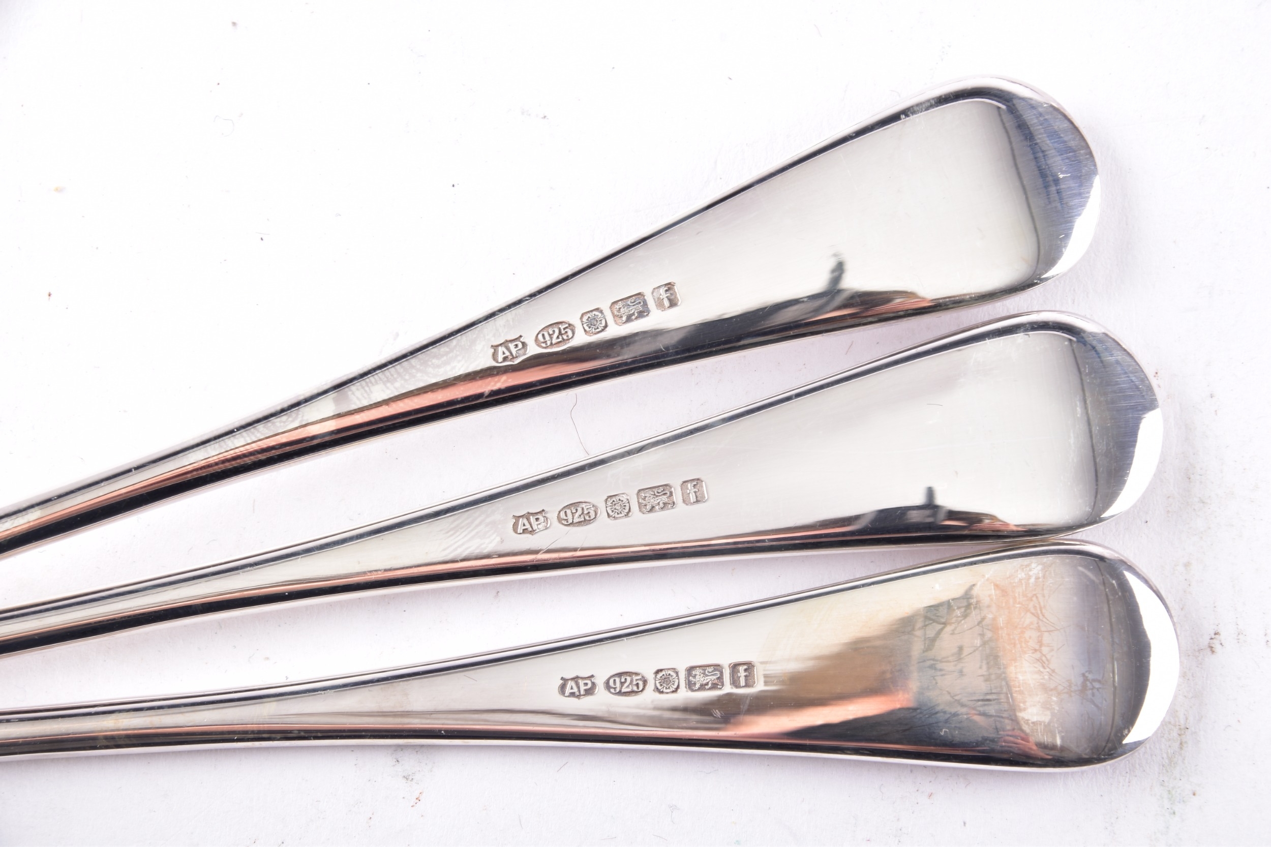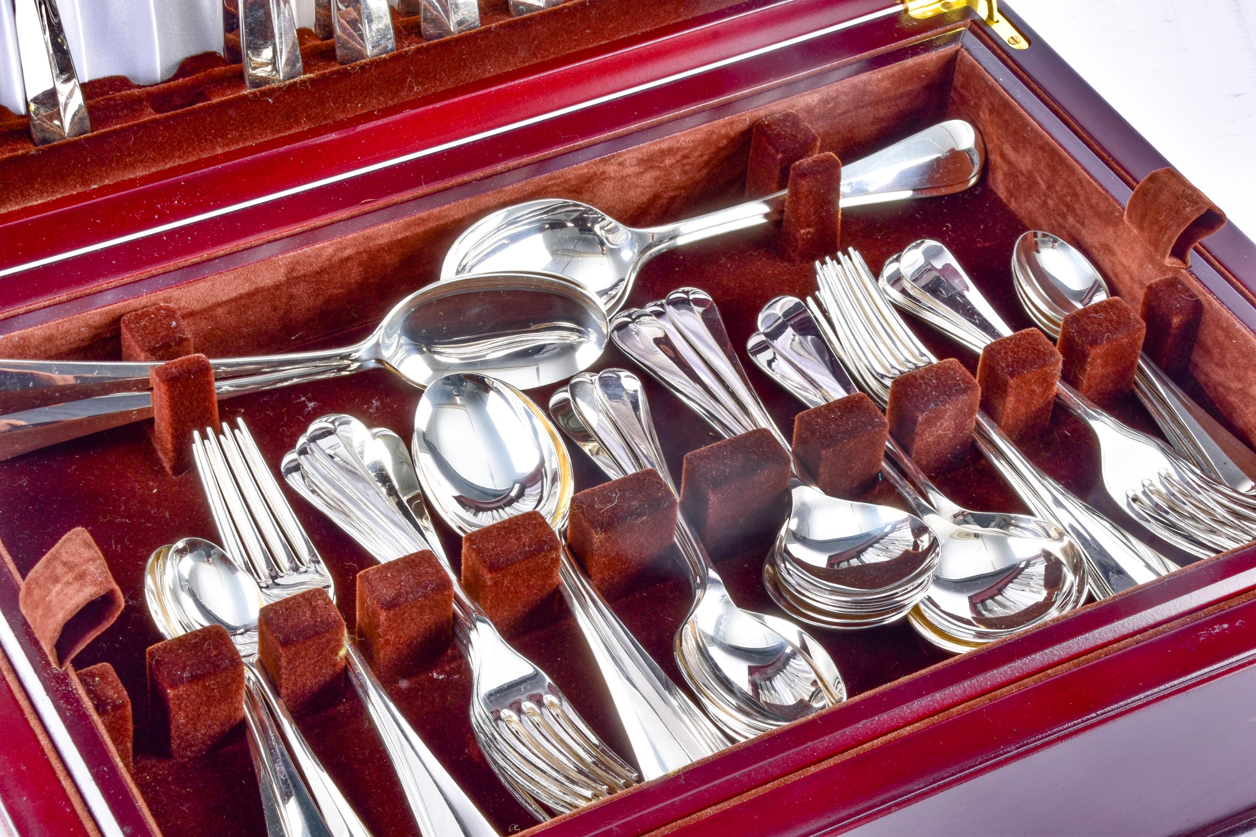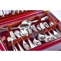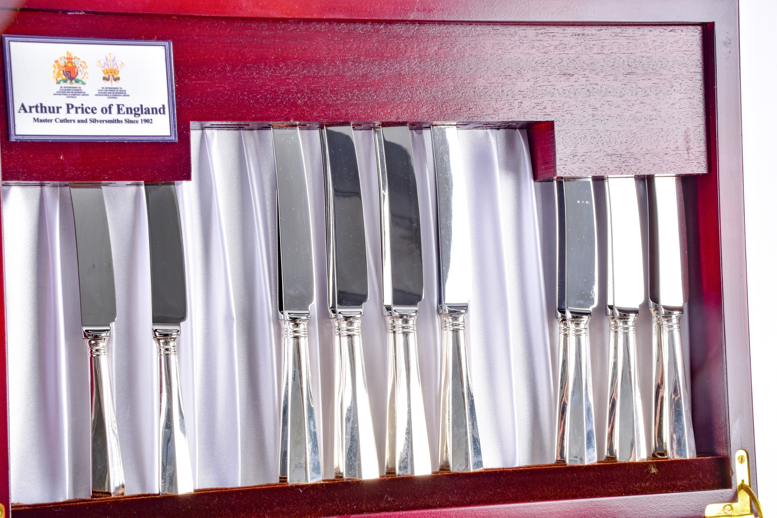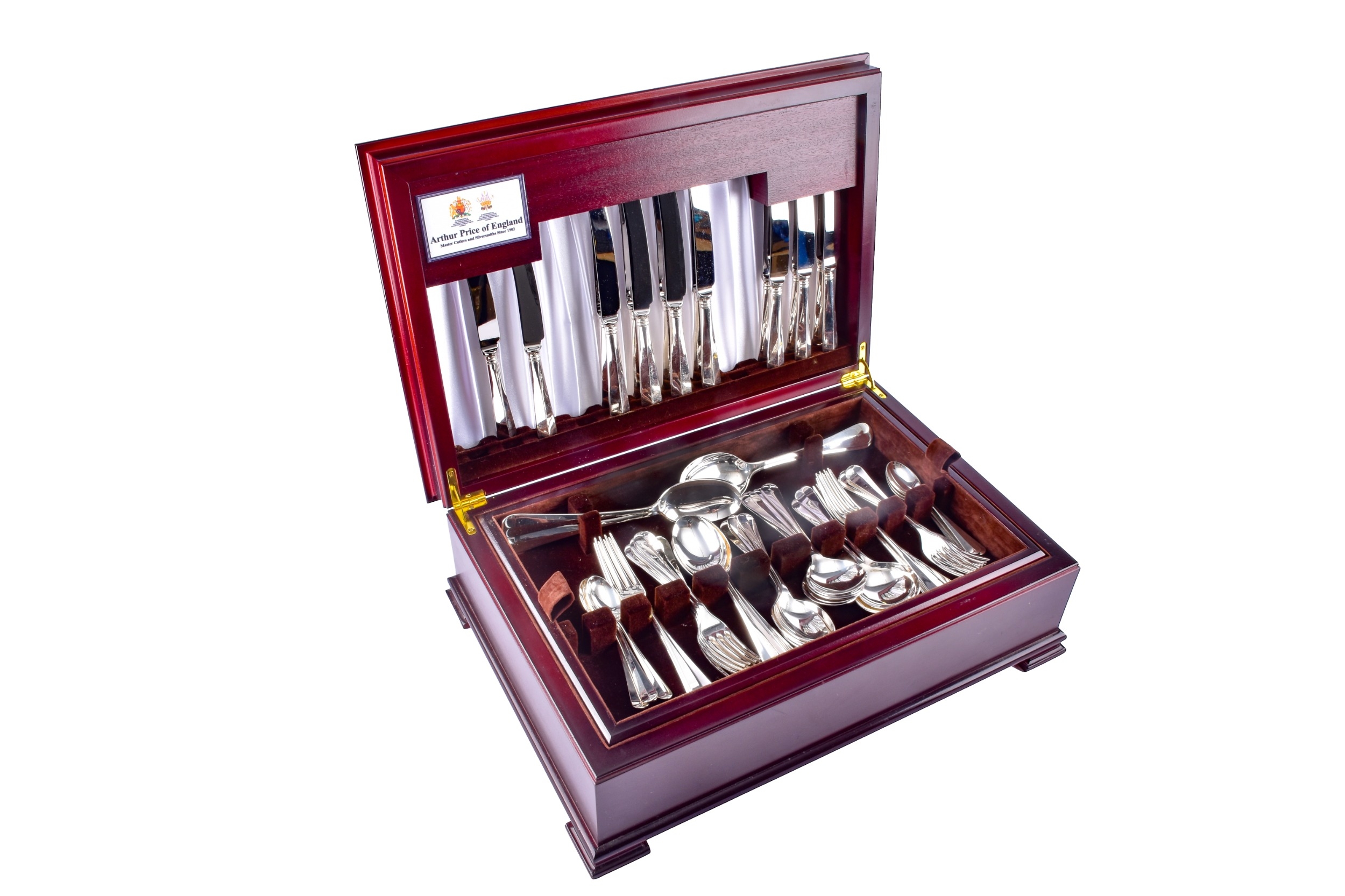 An Arthur Price silver canteen of cutlery, comprising of eight place settings and four serving spoons, all hallmarked for Sheffield 2005, housed in a fitted wooden box.