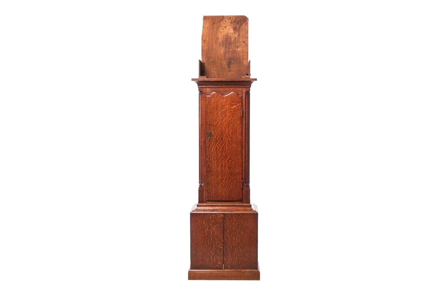 A George III oak 30-hour longcase clock, John Verow of Barton in the Beans, Leics., the moulded cornice over turned columns enclosing a 13" circular painted dial, (restored), signed 'John Verow, Barton', with date aperture, the four knopped pillar movement with anchor escapement and countwheel striking on a bell, the trunk with shaped door, quarter pilasters and plinth base, 200 cm high, (pendulum, no weight). John Verow, was apprenticed to Samuel Deacon also of Barton in the Beans in 1780/5 and when released working in his own right in the 1790s before moving to nearby Hinkley. From the estate of the late William John Thornton (1937-2025), of Groby, Leicestershire. Known as 'John' to his friends and family, he became interested in steam engines from an early age, and then traction engines and aircraft, before building an extensive knowledge and collection of clocks, notably early Lantern clocks and longcases. He was a very keen member of the Antiquarian Horological Society, and gave several lectures to their members at Keble College, Oxford. John was also a member of the Furniture Society in Groby village, and the Groby allotment Society, being chairman of the latter for over 30 years.