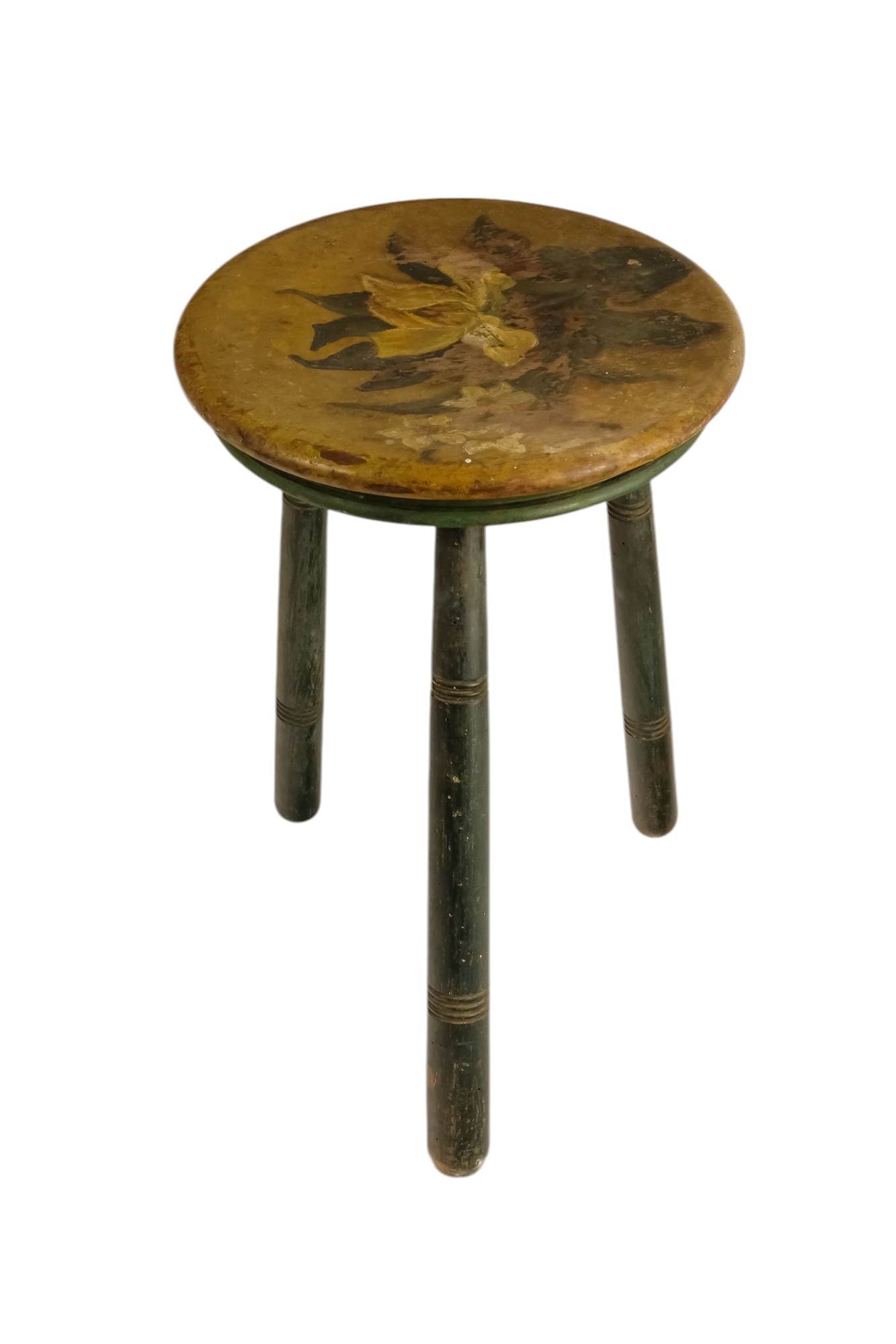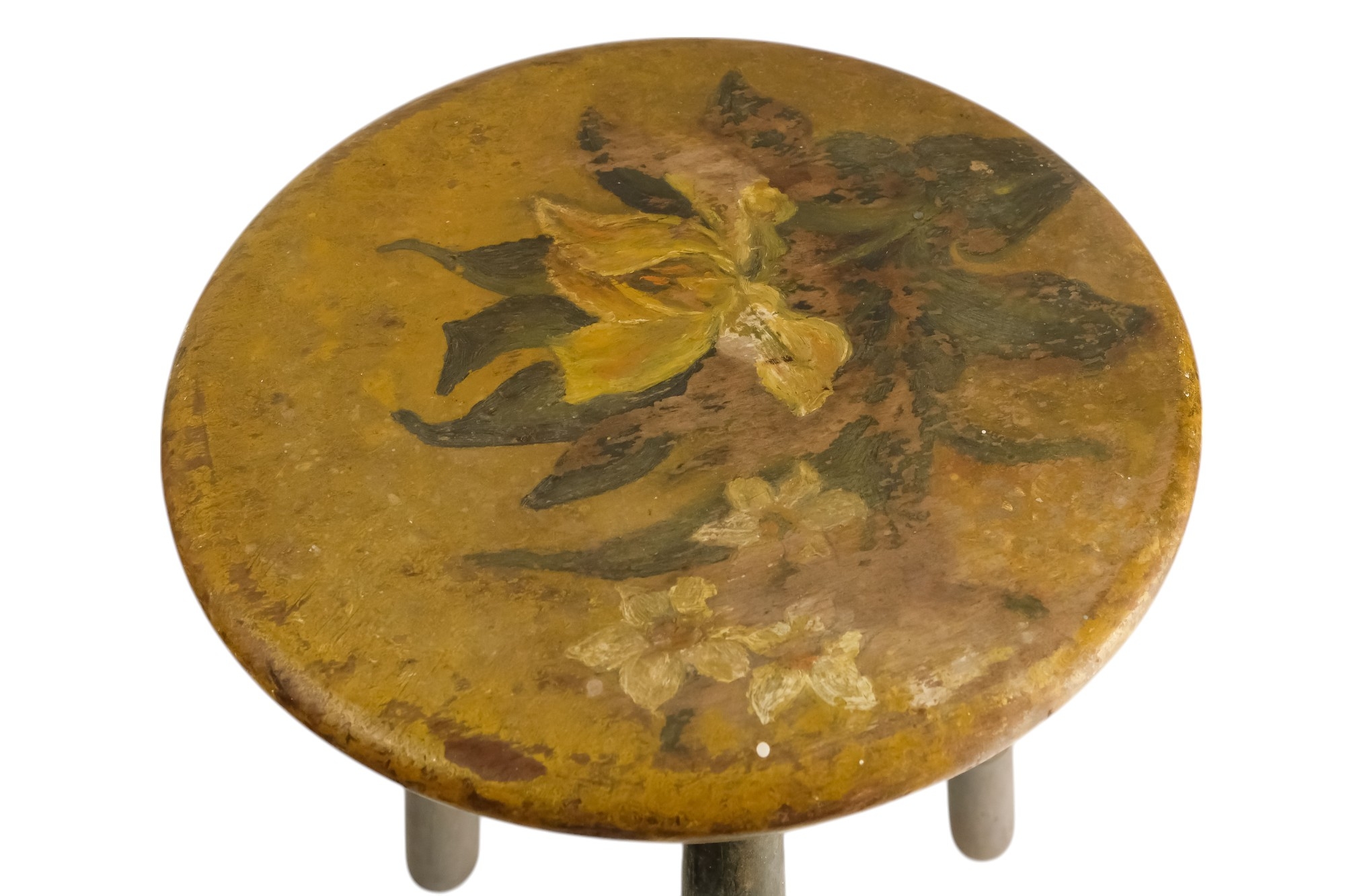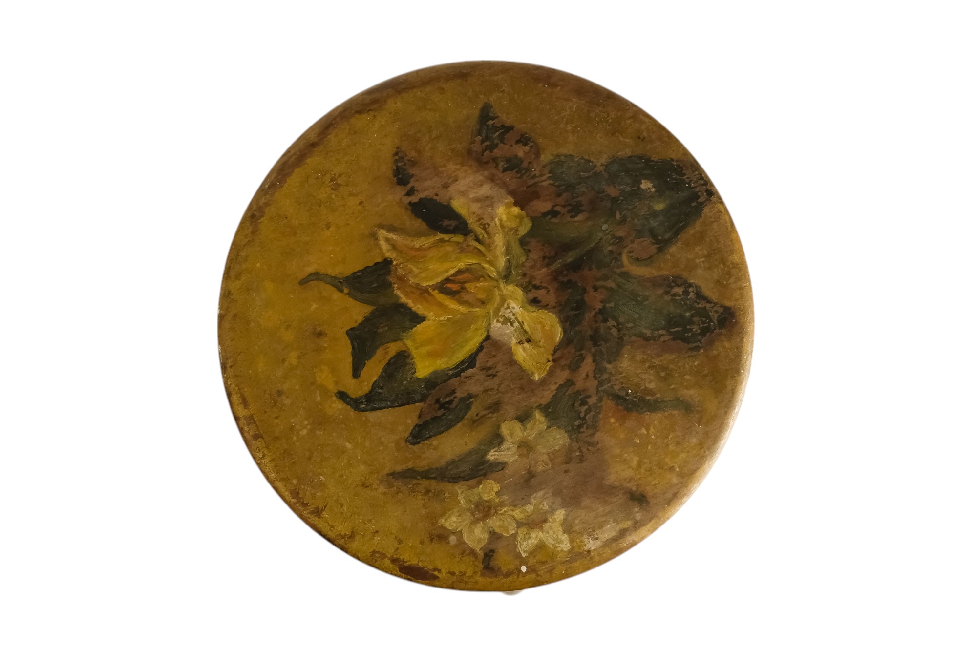 A 19th century cricket stool - the circular seat painted with an iris, raised on three turned legs, 28 x 41cm.