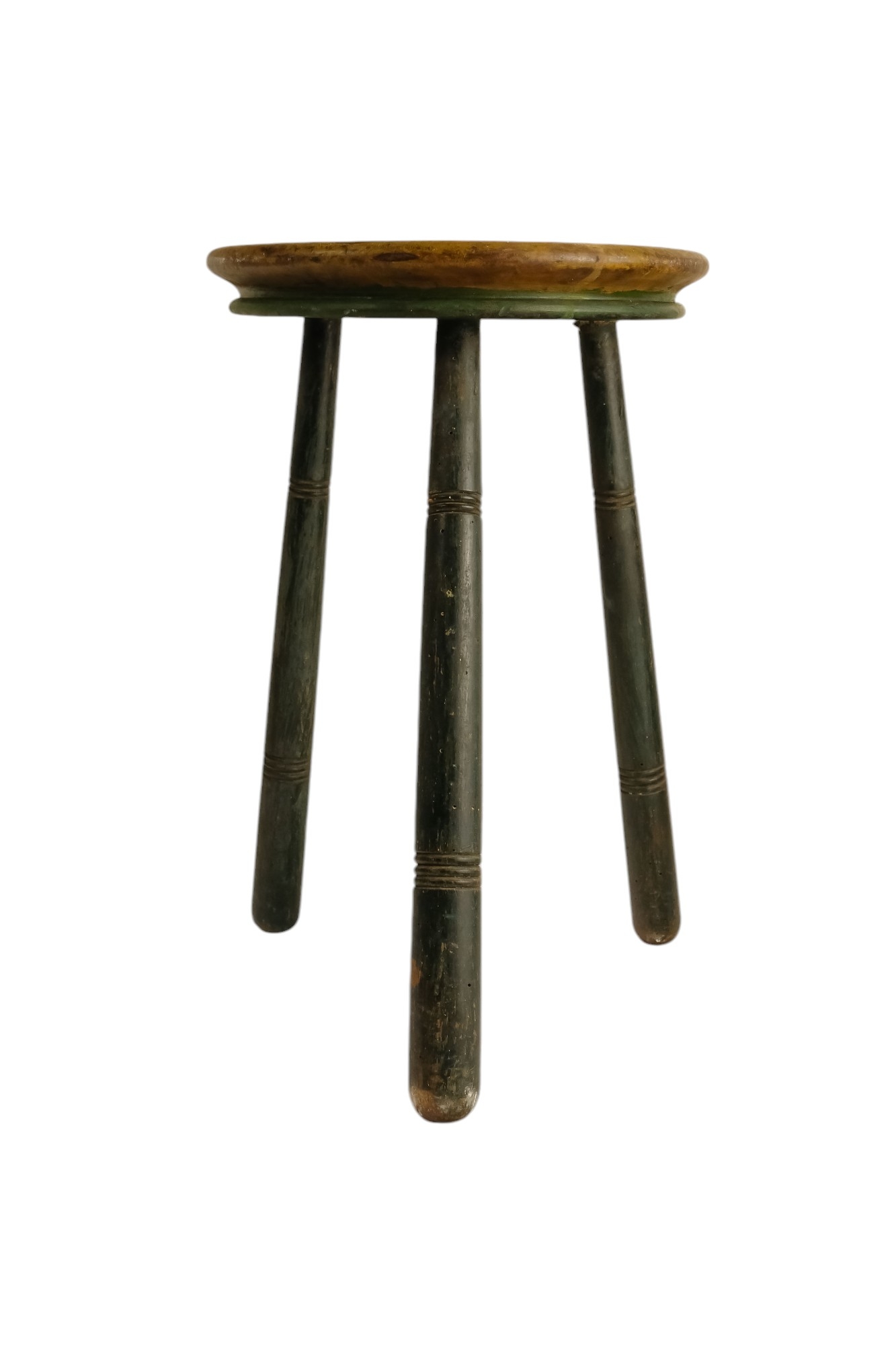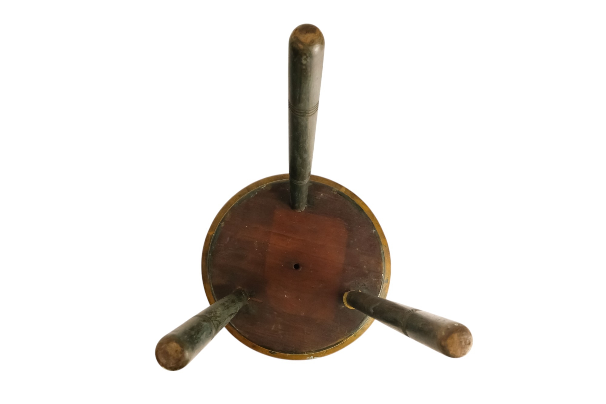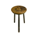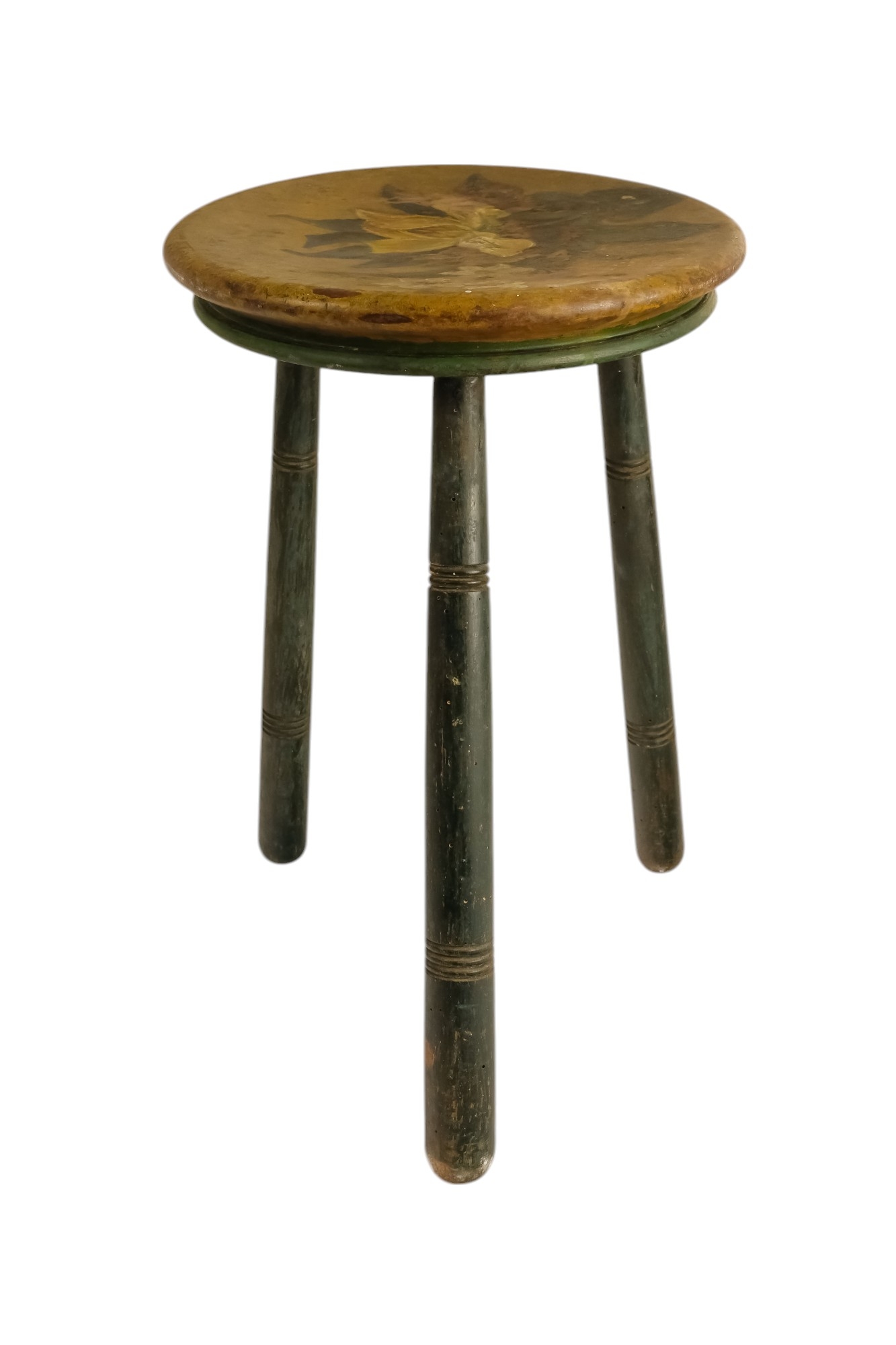 A 19th century cricket stool - the circular seat painted with an iris, raised on three turned legs, 28 x 41cm.