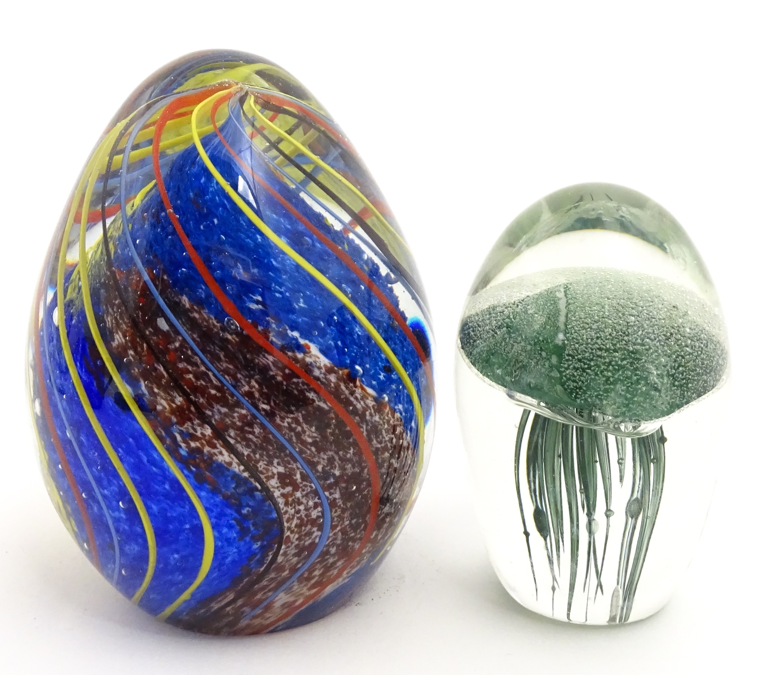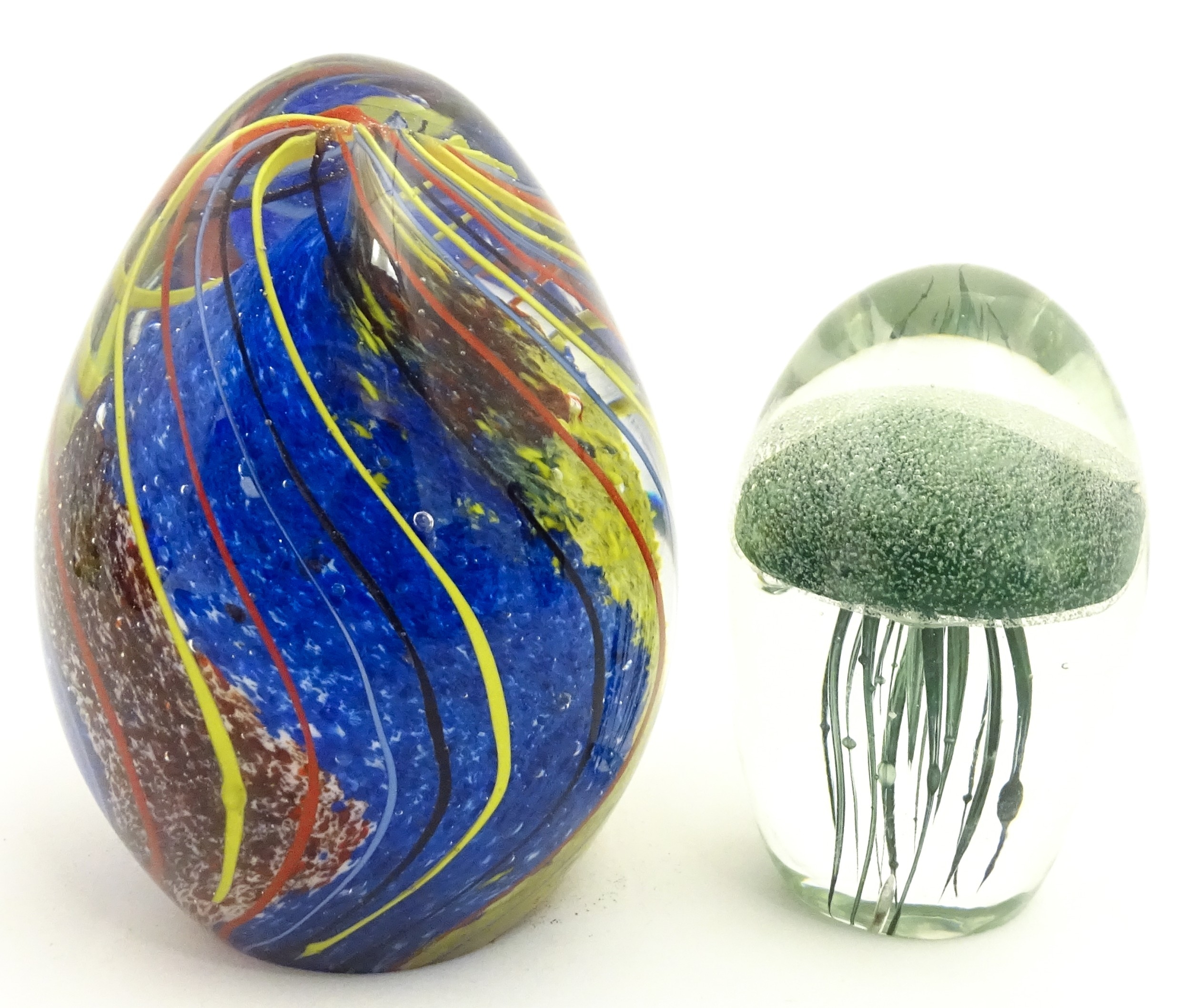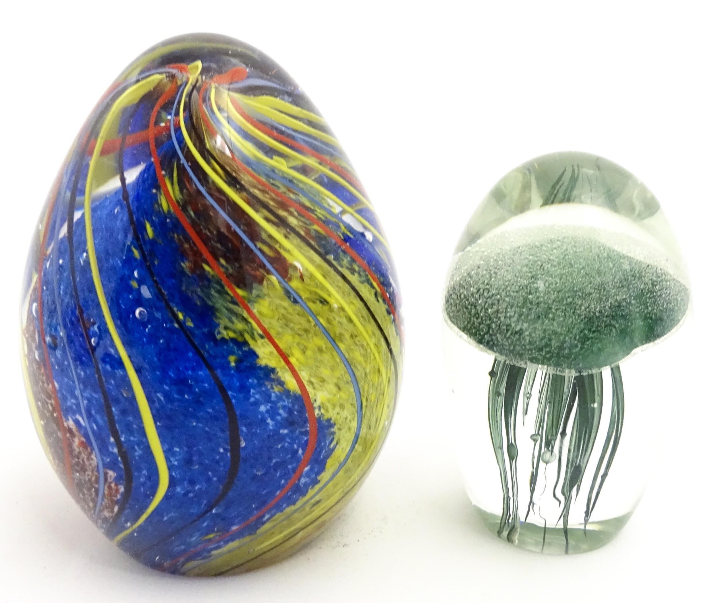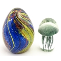 An art glass paperweight of egg form with abstract coloured swirl detail. Together with a smaller glass paperweight with jellyfish detail. The tallest approx. 5 1/2" high (2)