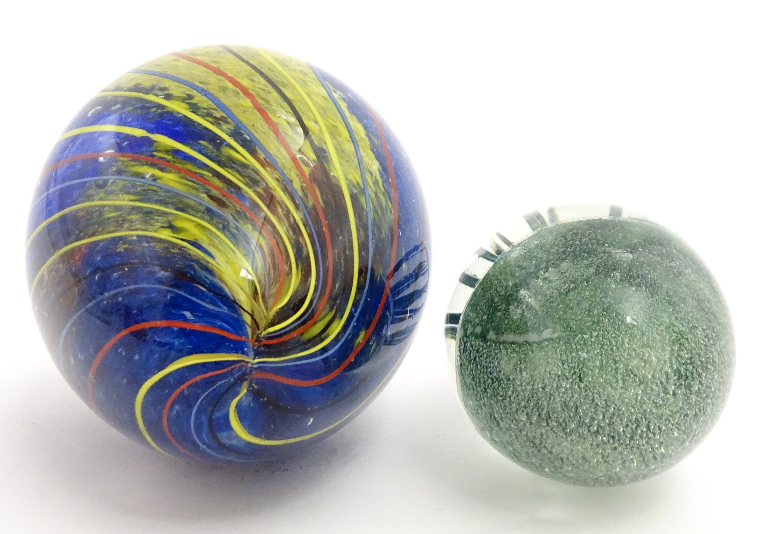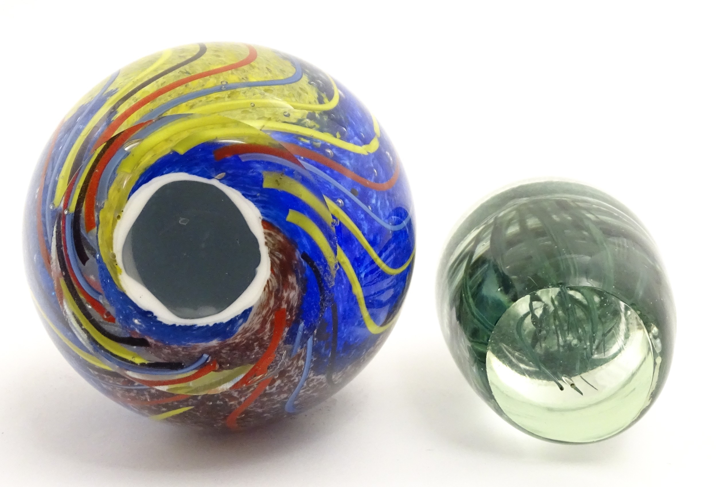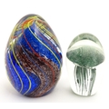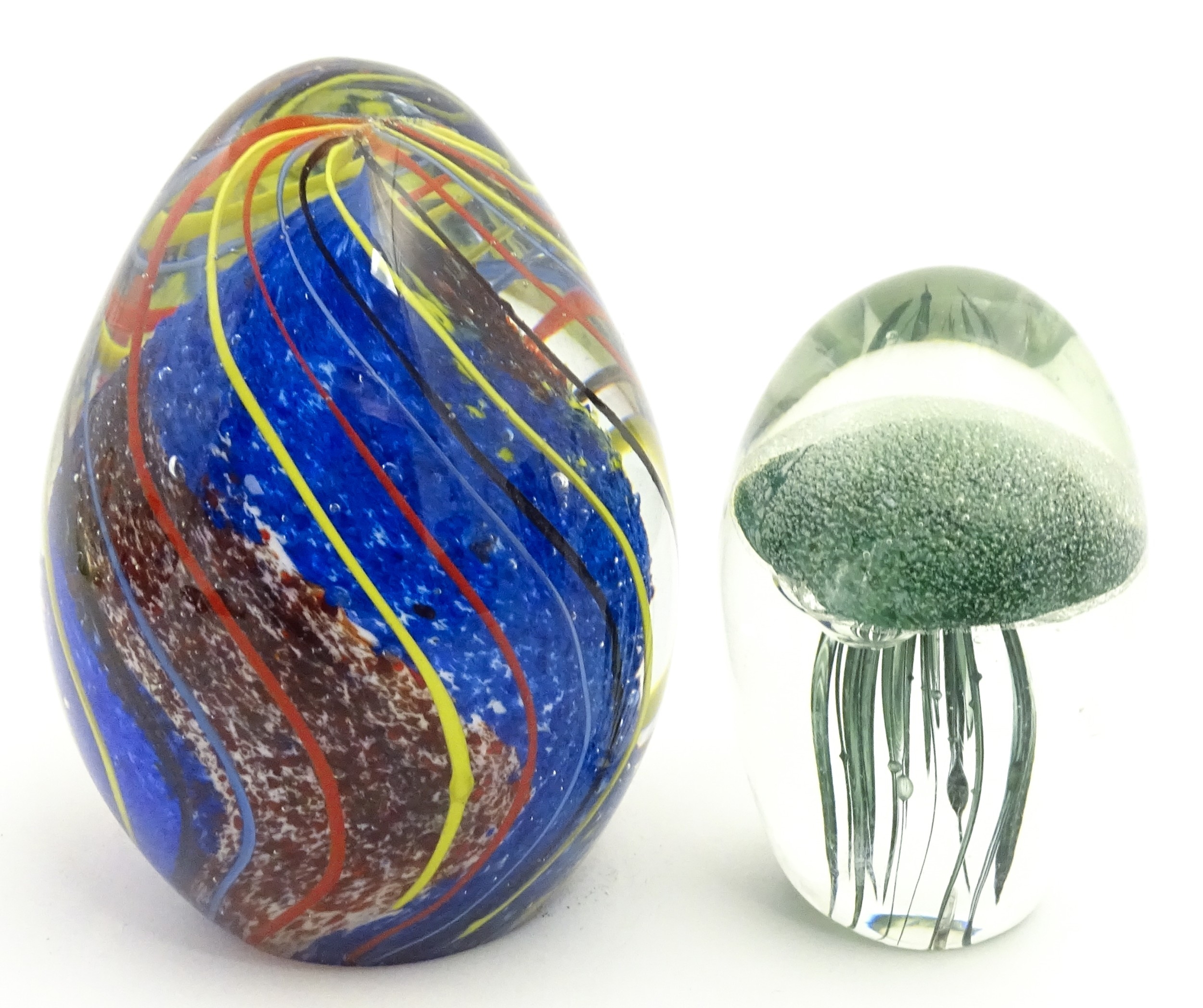 An art glass paperweight of egg form with abstract coloured swirl detail. Together with a smaller glass paperweight with jellyfish detail. The tallest approx. 5 1/2" high (2)