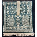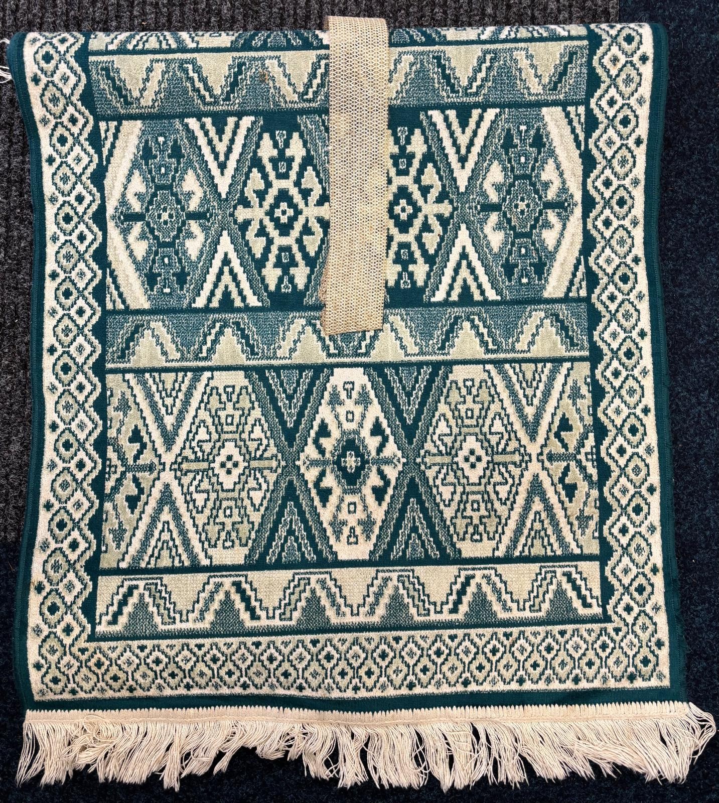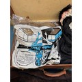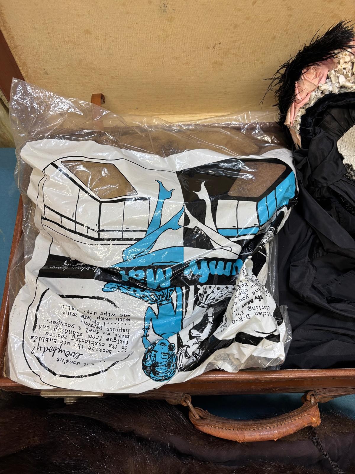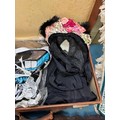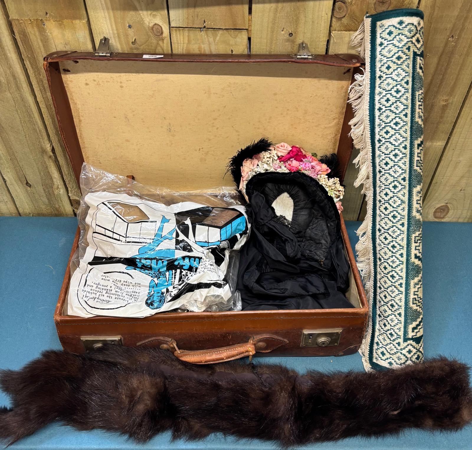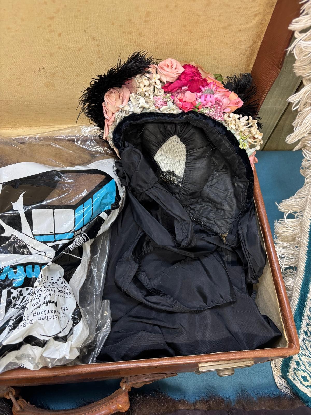 Case containing vintage clothing; Victorian Mourning bonnet, fur stoles, black skirt and small rug.