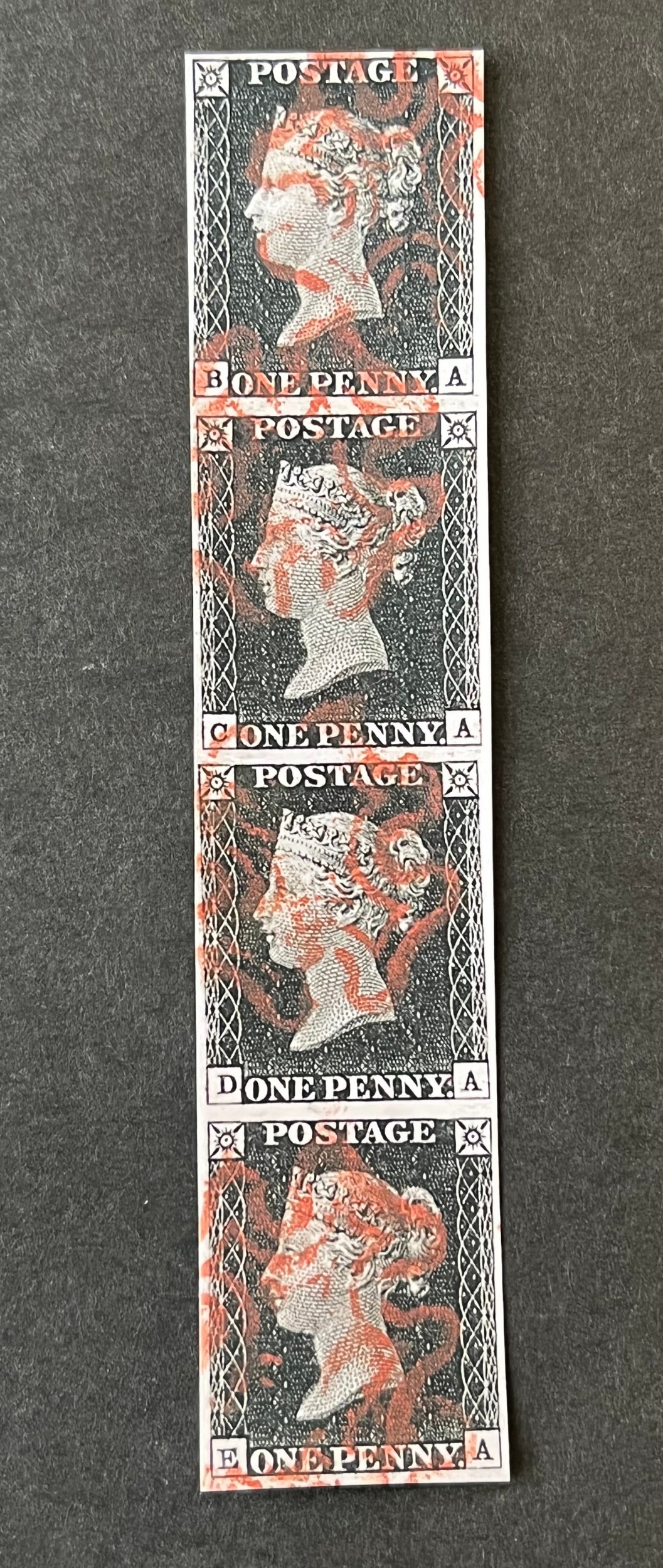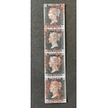 UK GB QV 1840 Penny black stamps vertical strip of 4 with red Maltese Cross cancels FORGERY / REPLICA / COPIES um a/f