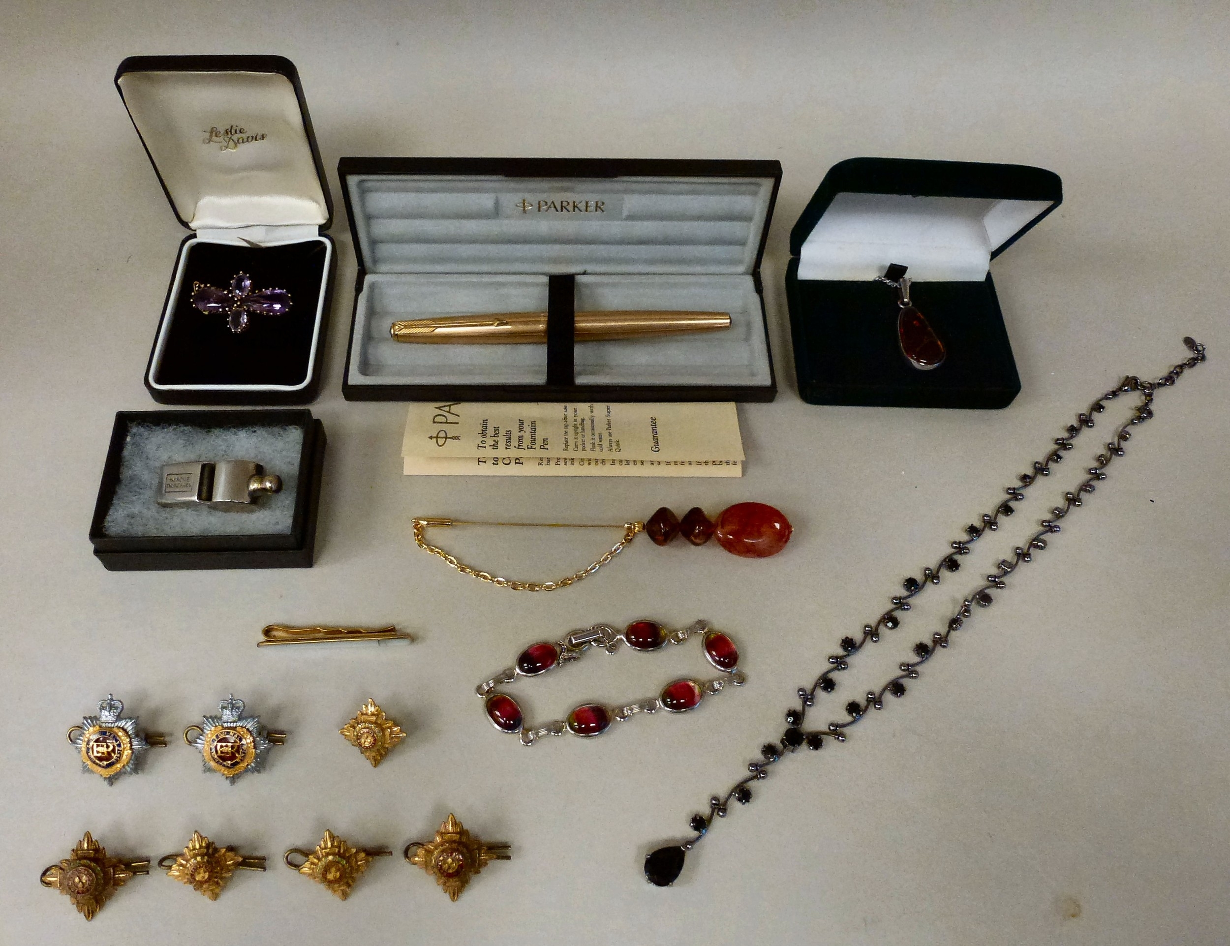 A mixed lot: to include a Parker 61 gold plated fountain pen; items of personal ornament; and an 'Acme Thunderer' whistle