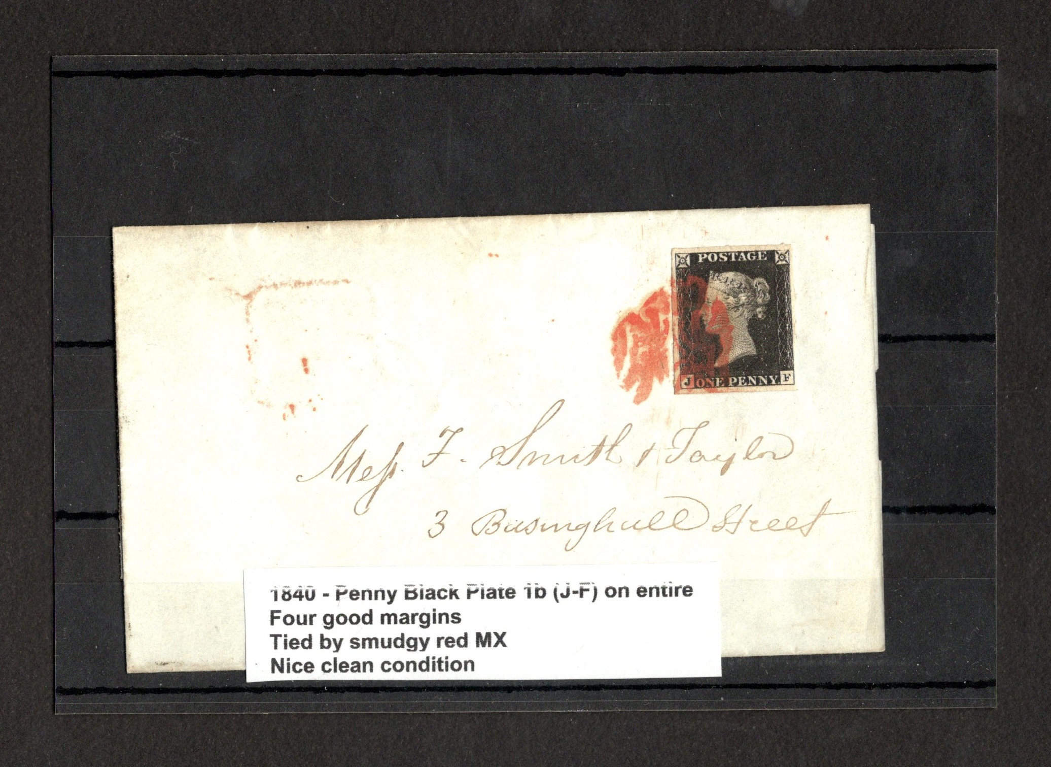 GB - 1840 Penny Black Plate 1b (J-F) on entire, four good margins, tied by smudgy Red MX, nice clean condition, cat on cover £625