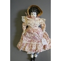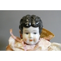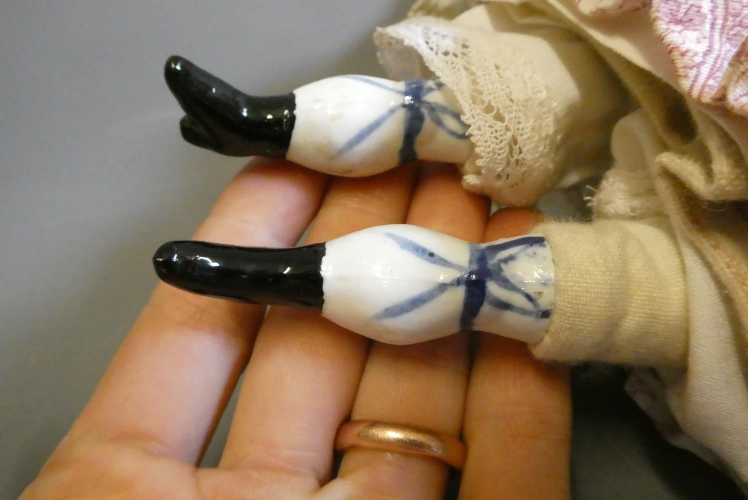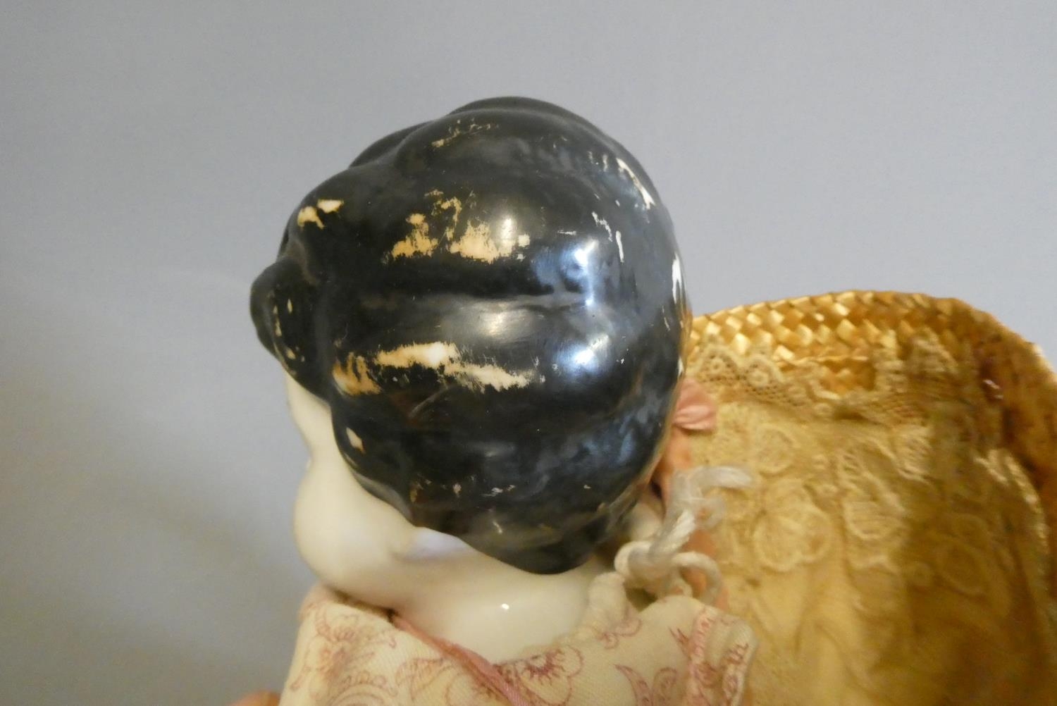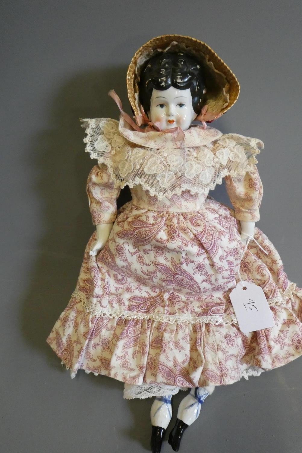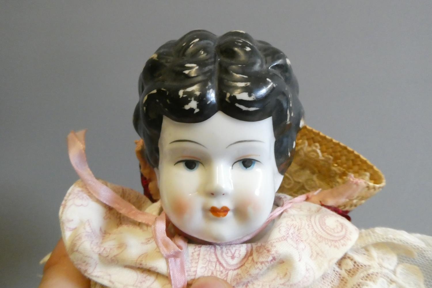 A Victorian china shoulder head doll, with moulded hair, painted features, fabric body, china lower limbs, moulded boots, pink dress and straw bonnet, 14 1/2" long