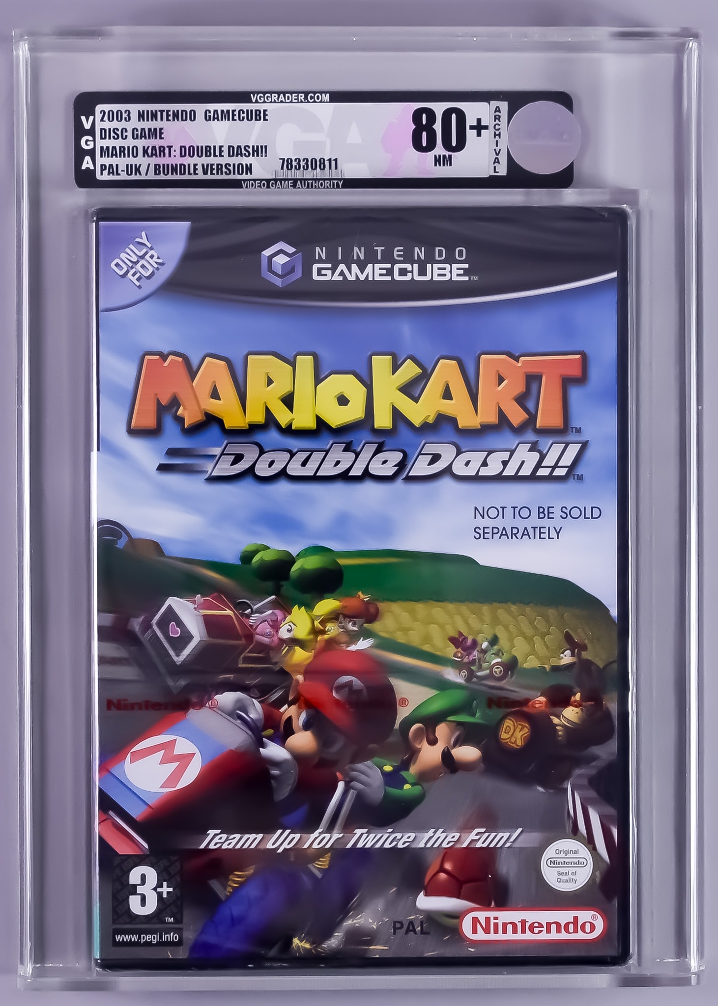 2003 Nintendo GameCube – Mario Kart: Double Dash! – PAL/UK Version VGA 80+/NM, with red Nintendo strip seal and in rigid Perspex case supplied by VGA at the time of grading