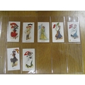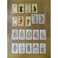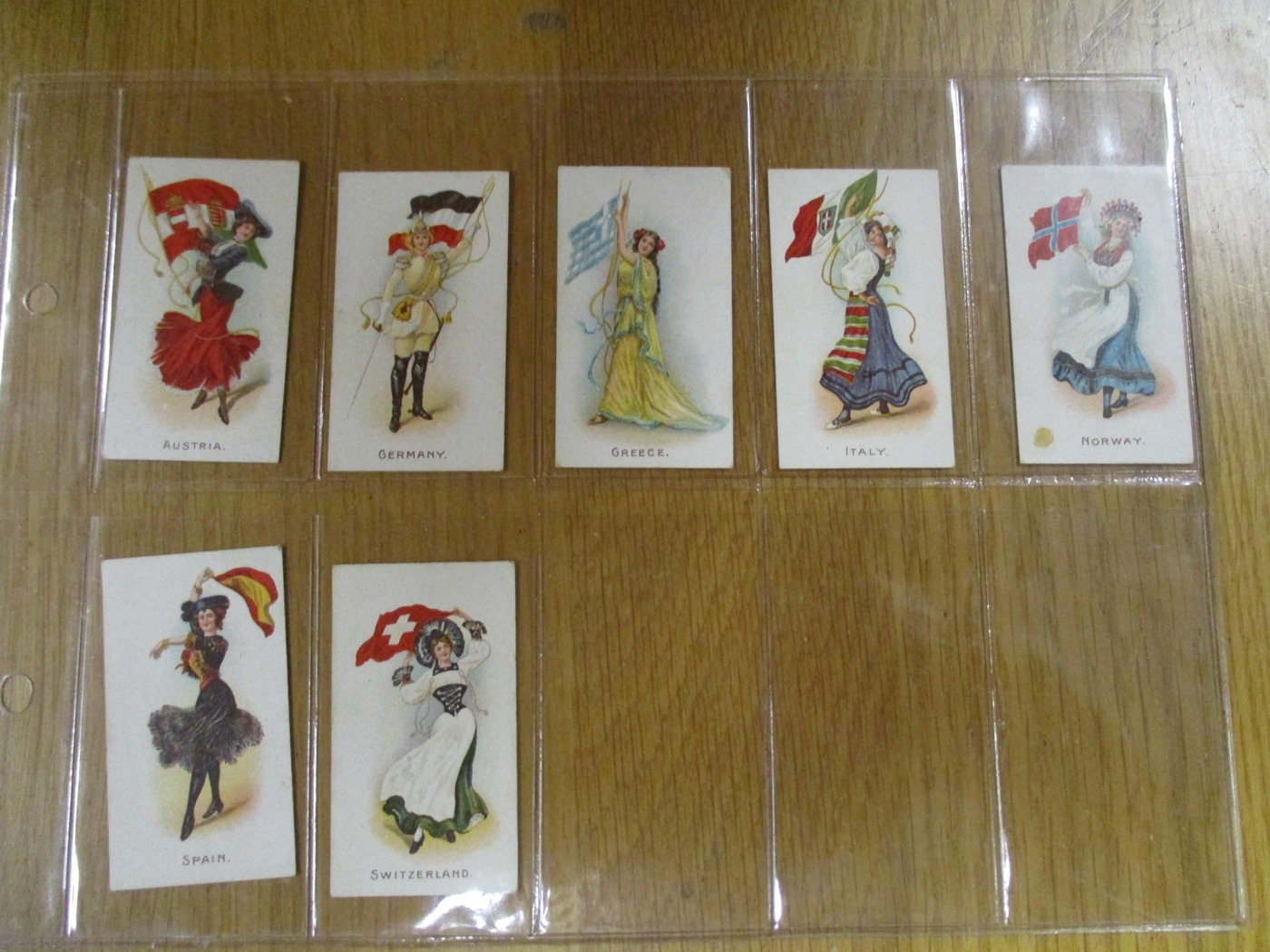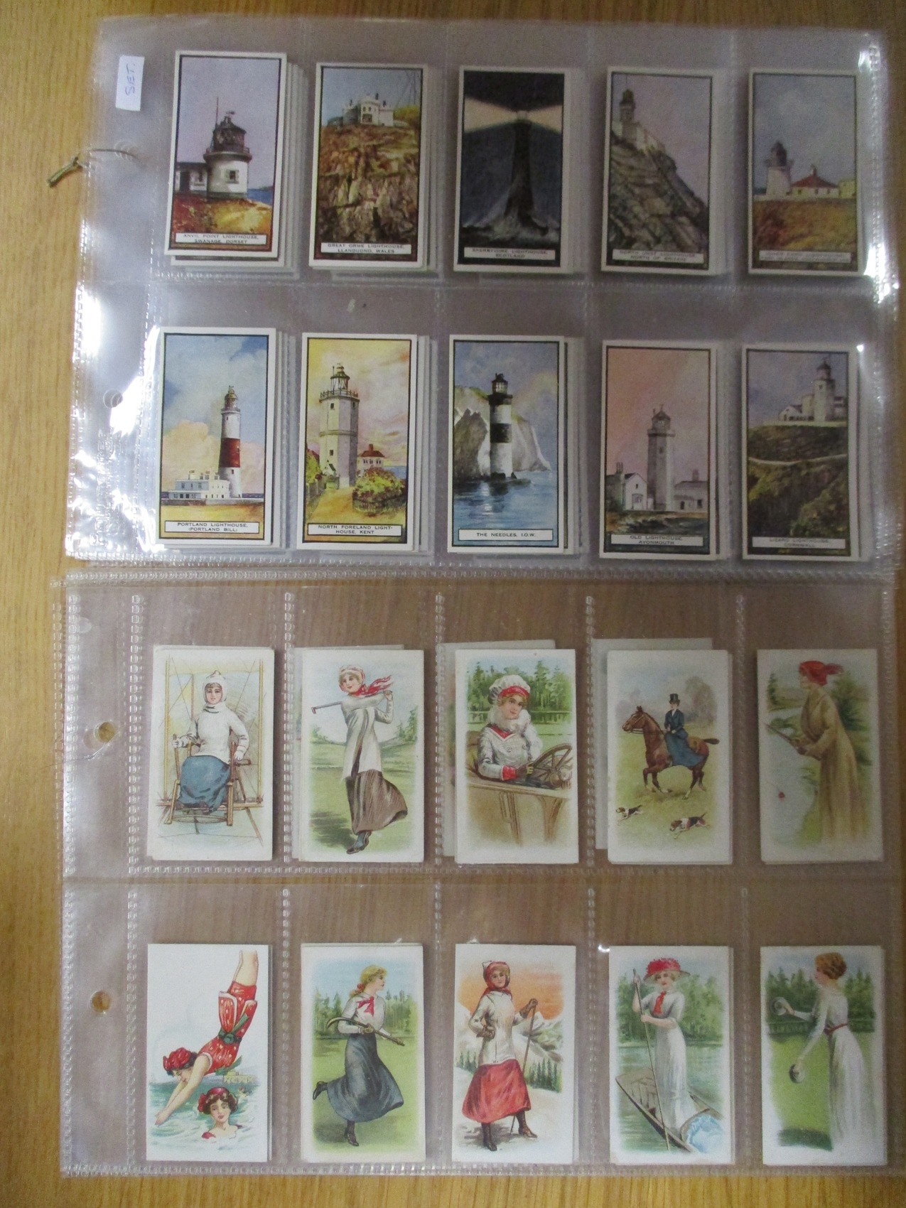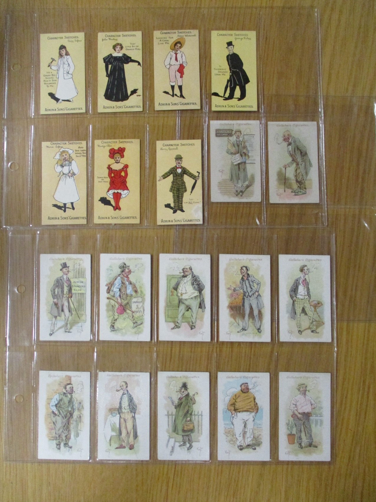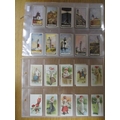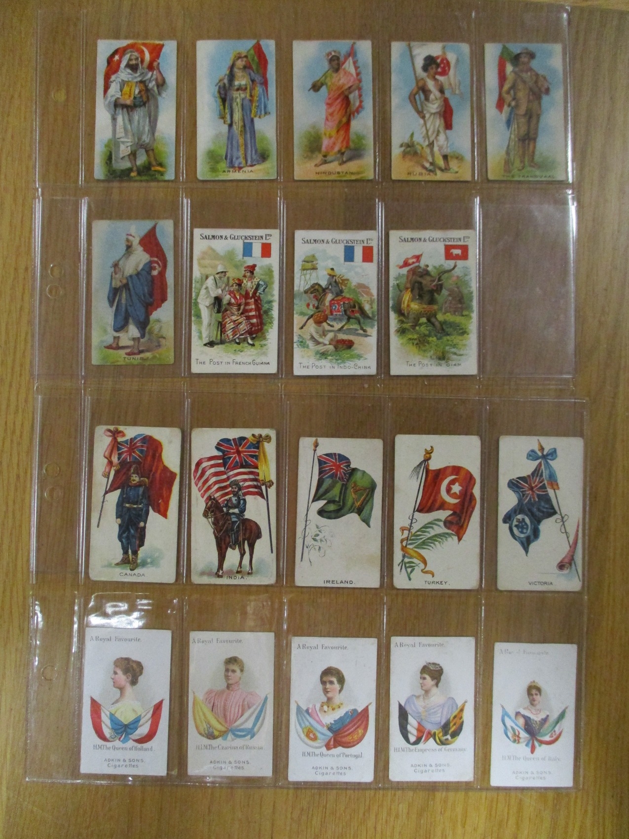 Collection of part sets in plastic sleeves with Adkin Character Sketches (7), A Royal Favourite (5), Gallaher Votaries of the Weed (12), Llyods National Types (6), Pritchard & Burton Flags & Flags with soldiers draped and undraped (5), Salmon & Gluckstein Methods of Conveying the Mails (3), Wills Flag Girls of All Nations (7), Lighthouses set and Scissors Sporting Girls (23) generally excellent. (R)