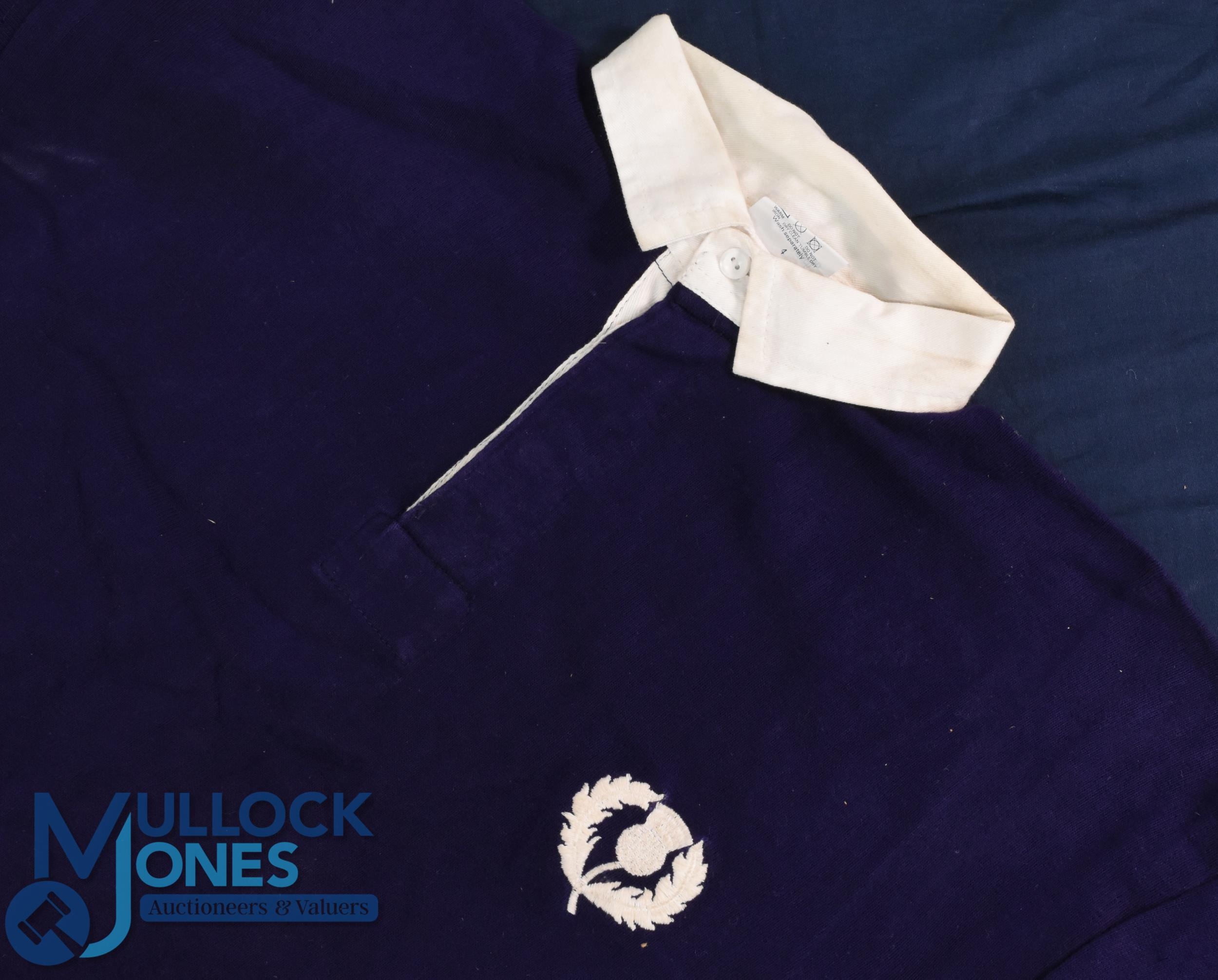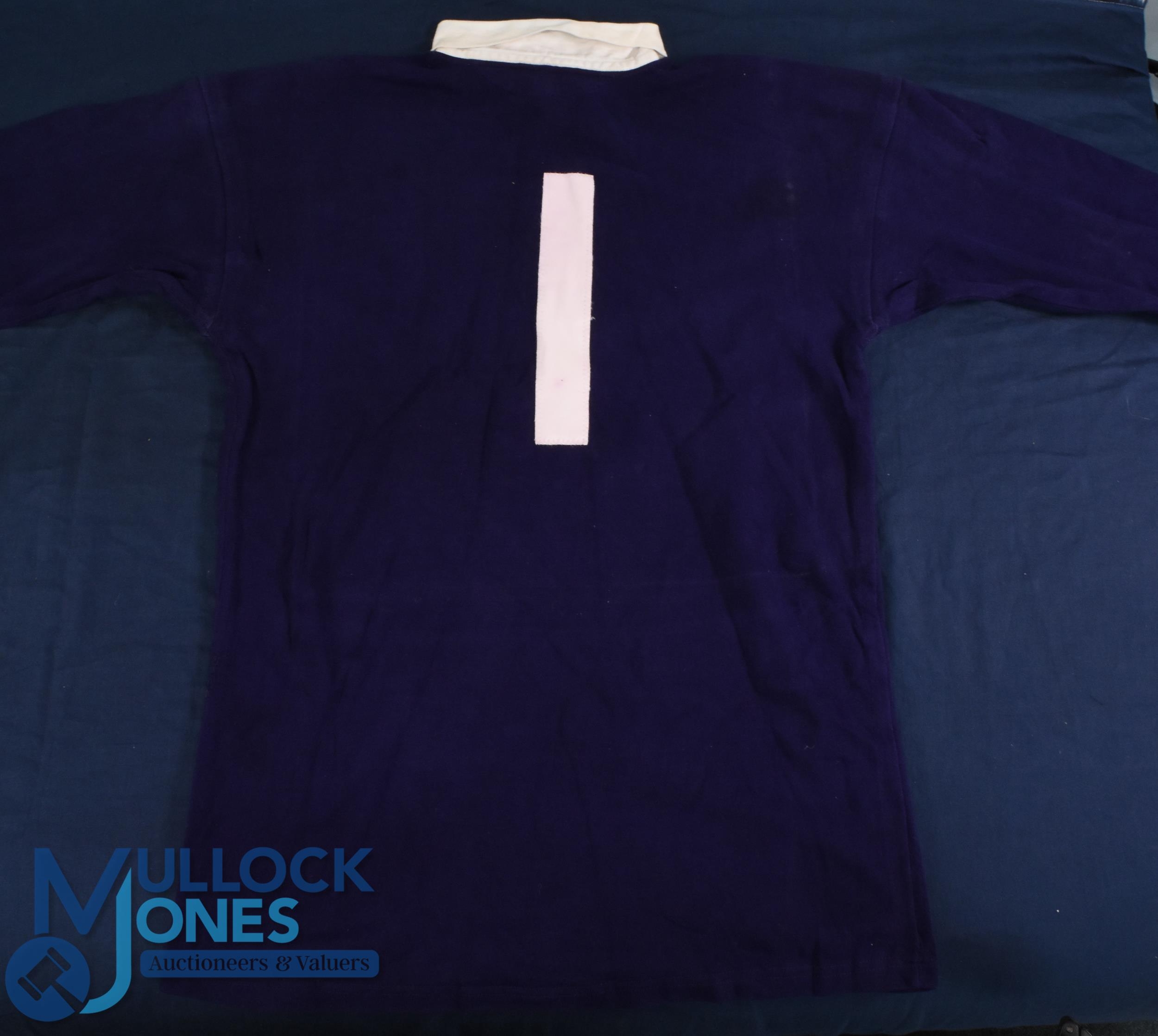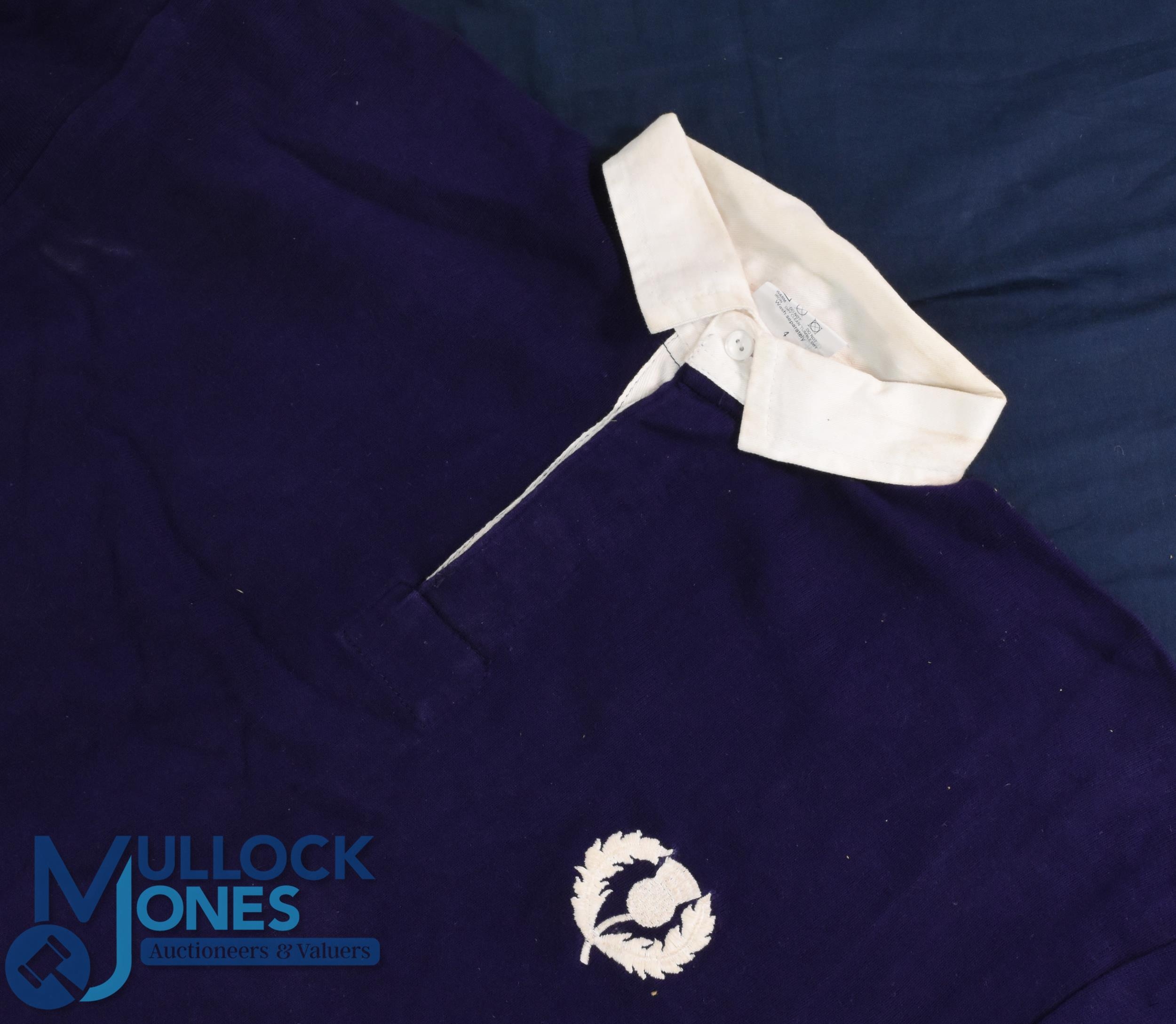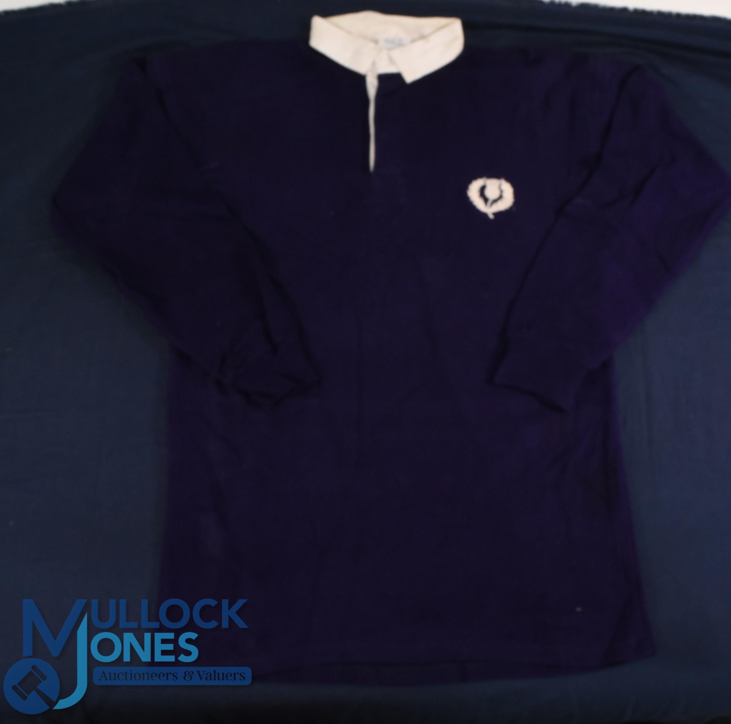 1990 David Sole Matchworn Scottish Rugby Jersey: Grand Slam year for Scotland and here is their skipper's jersey, 44" Umbro make, traditional royal blue with white thistle and no.1. Historic stuff! VG