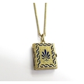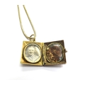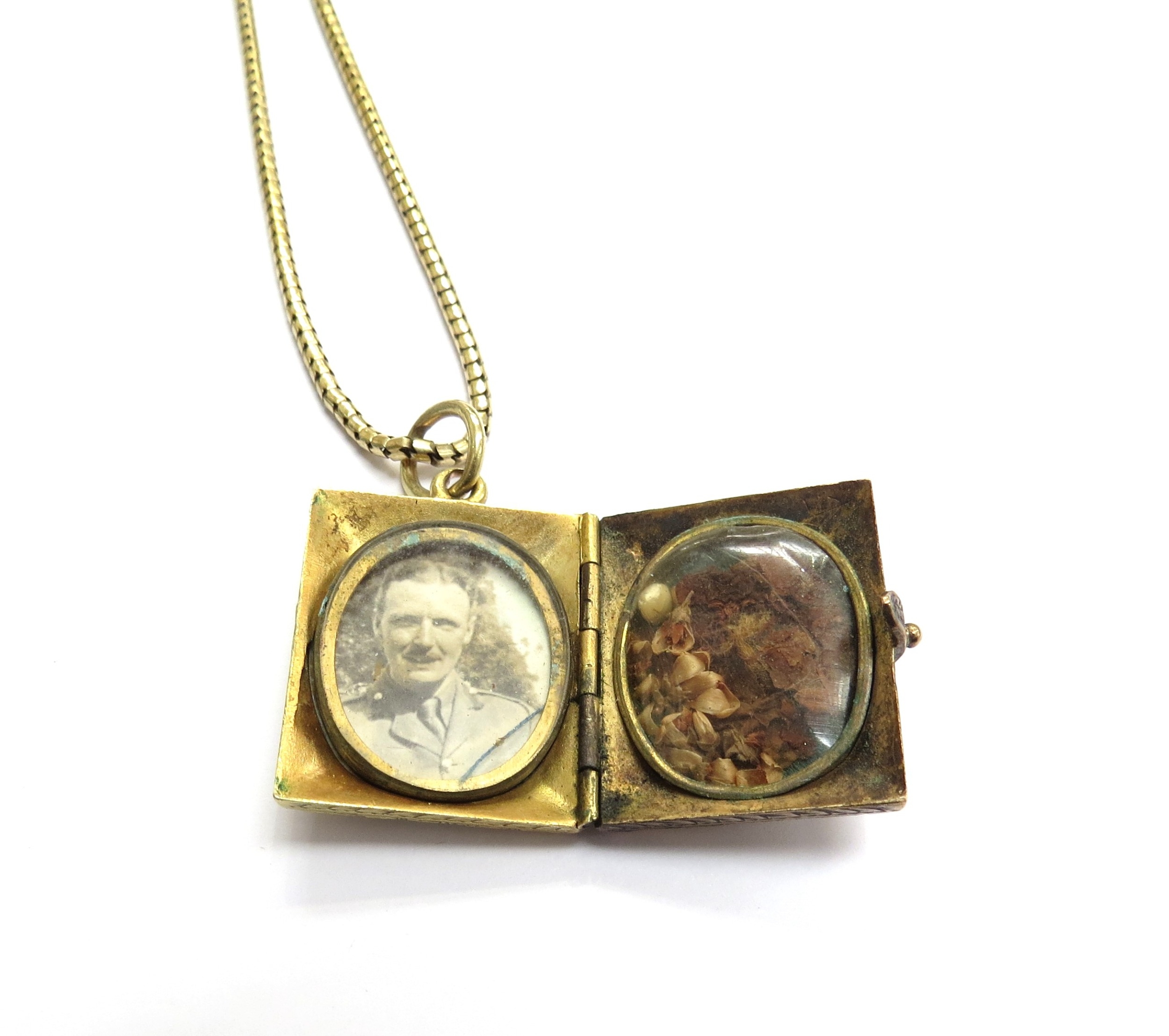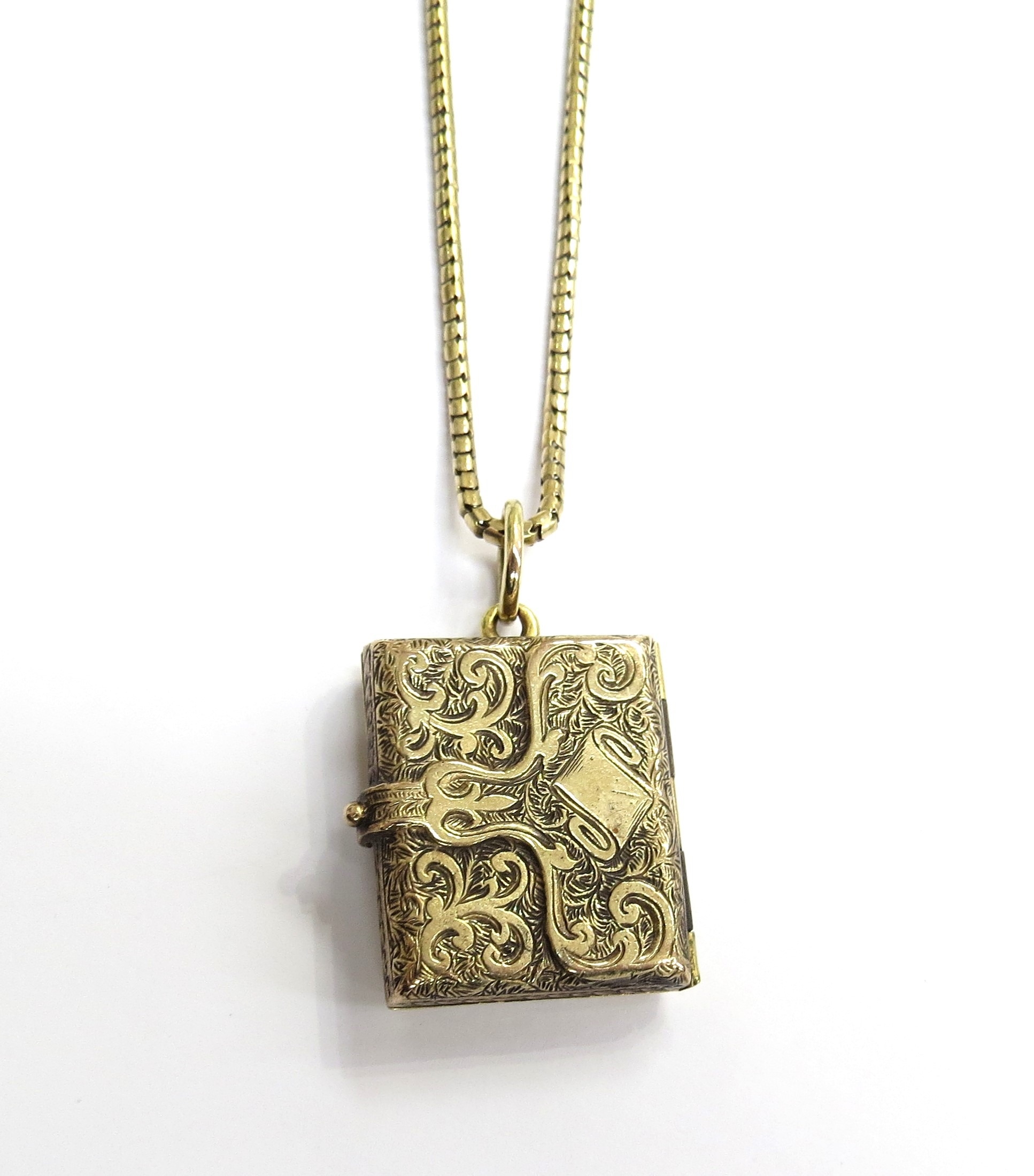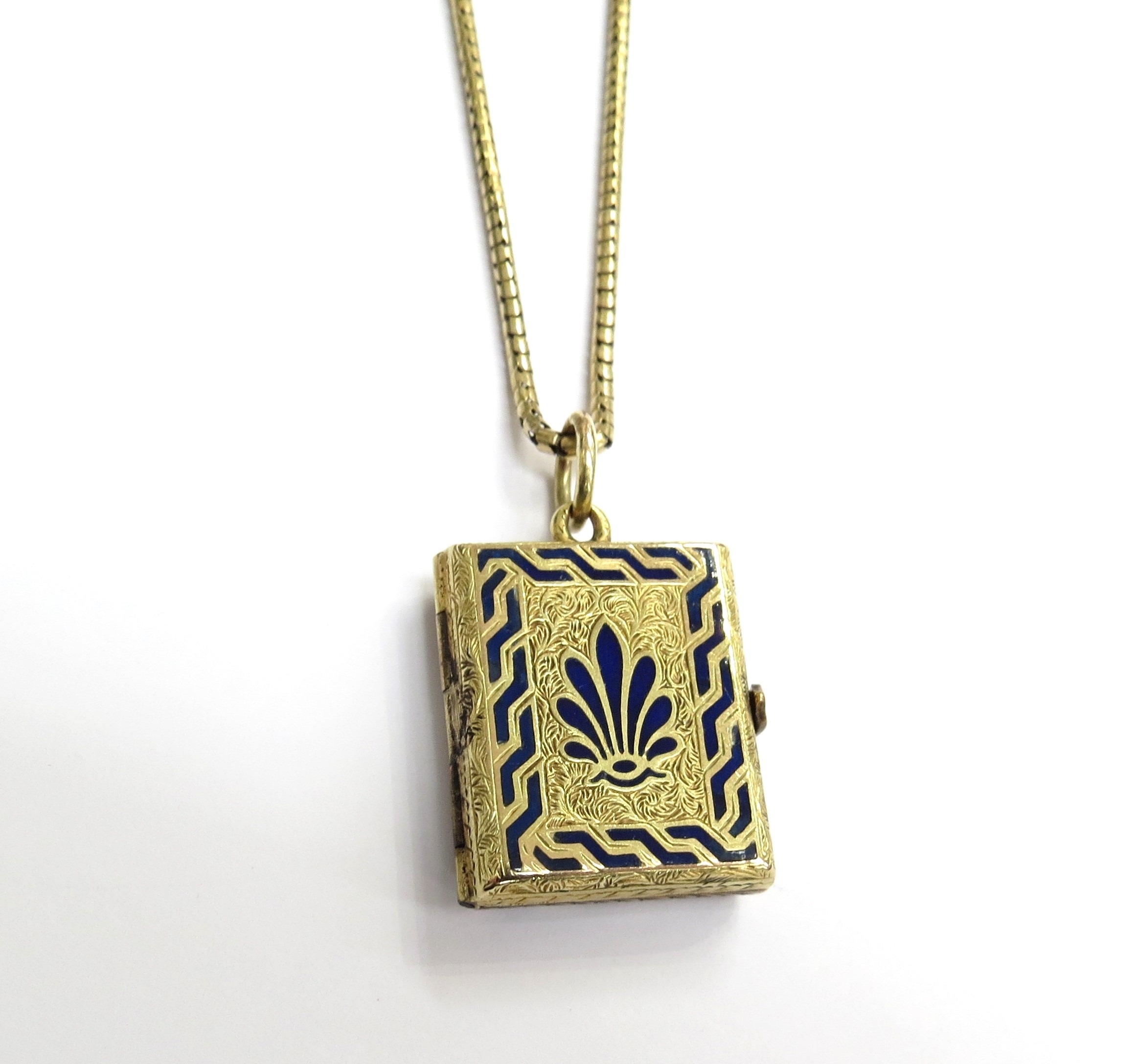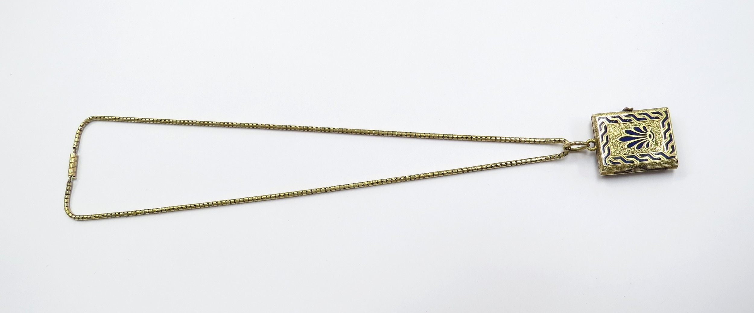 A gold engraved and enamelled double photograph locket as a satchel hung on a gold chain, 38cm long, 12.8g total