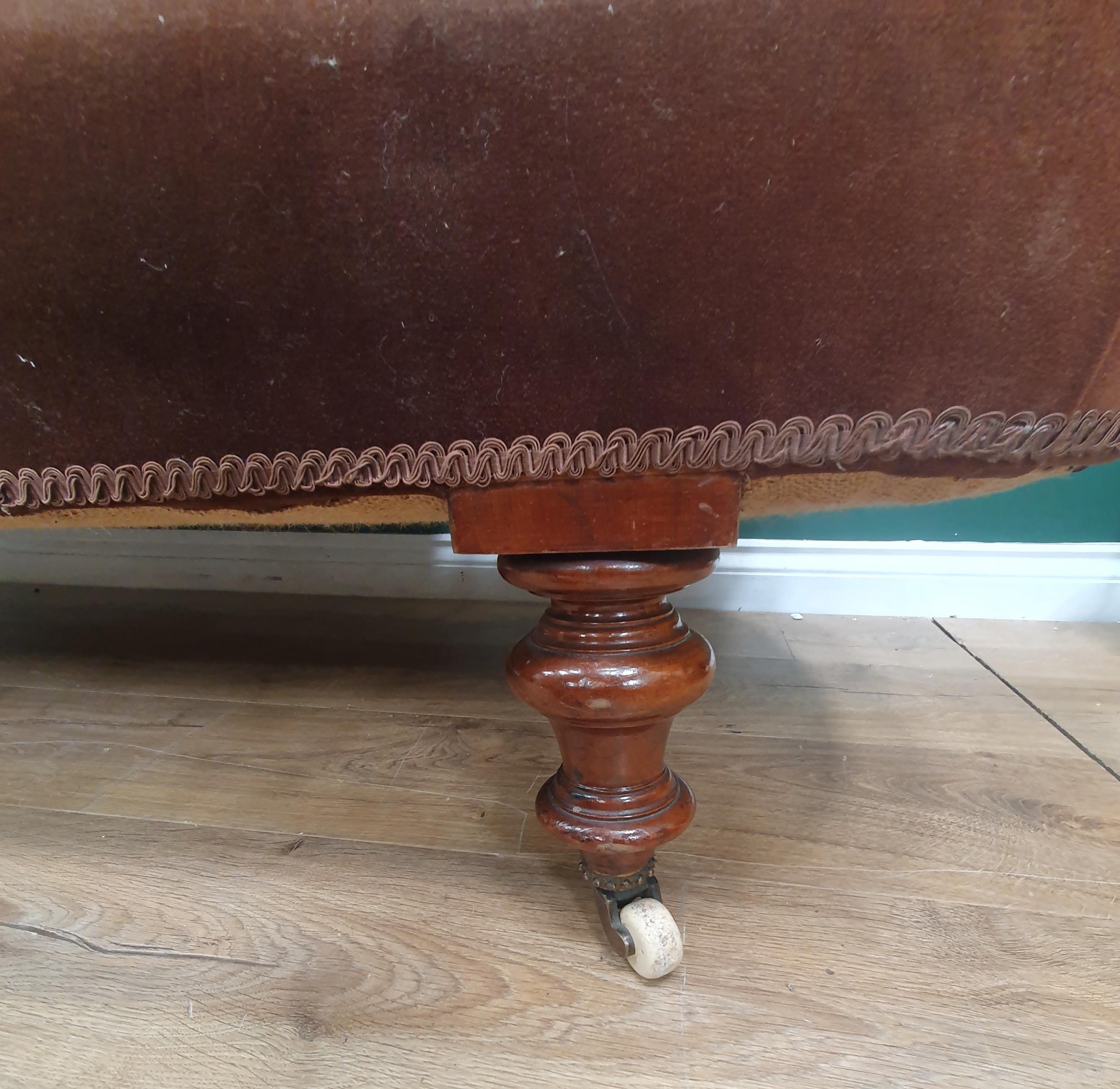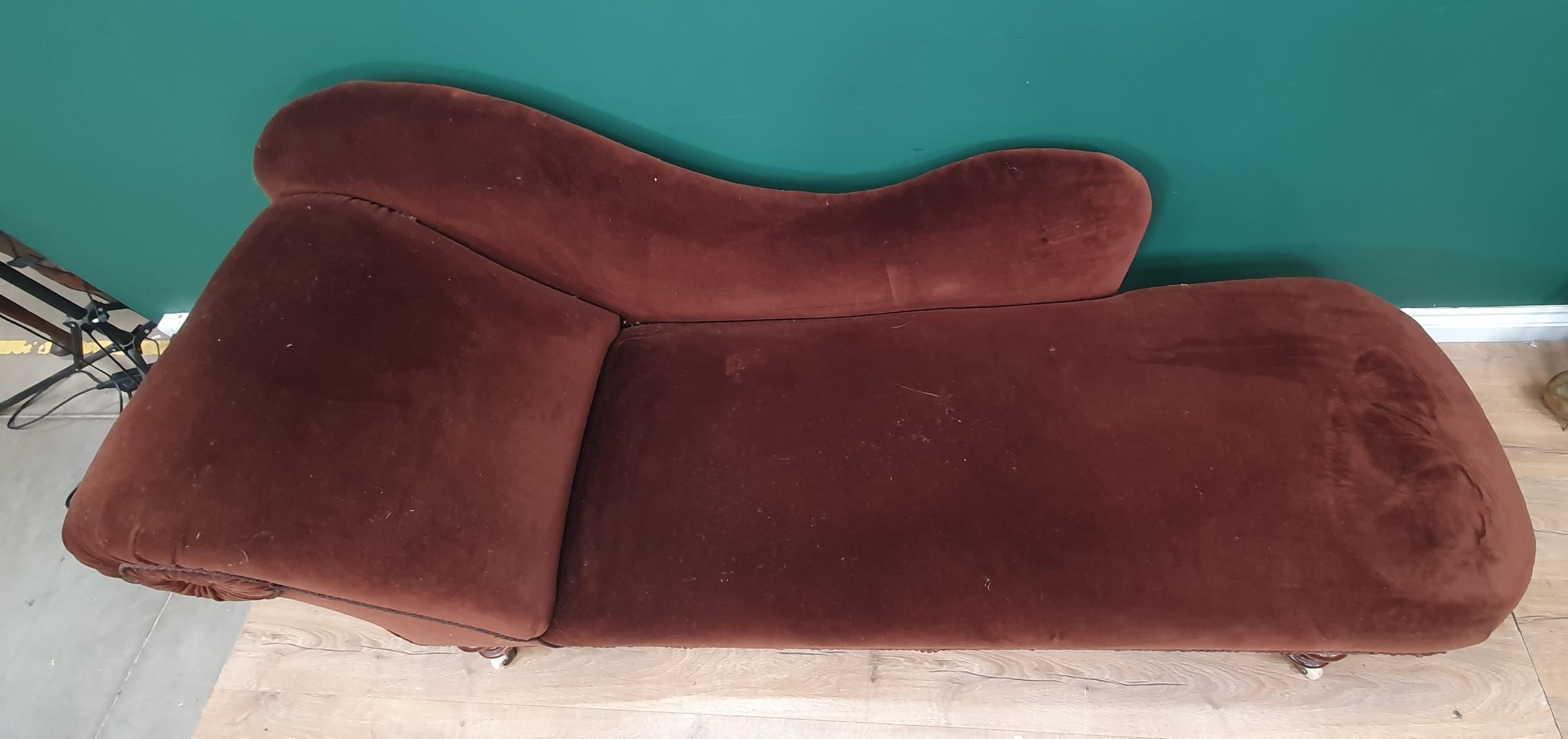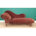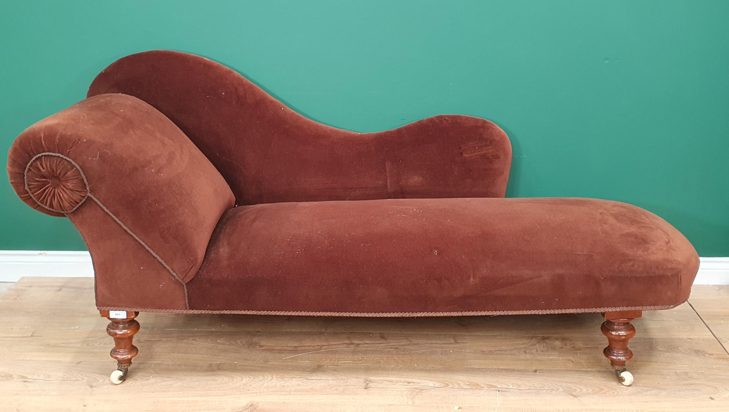 A Victorian Chaise Longue with brown upholstery mounted on turned supports and ceramic casters 6ft 6in L x 2ft 6in H