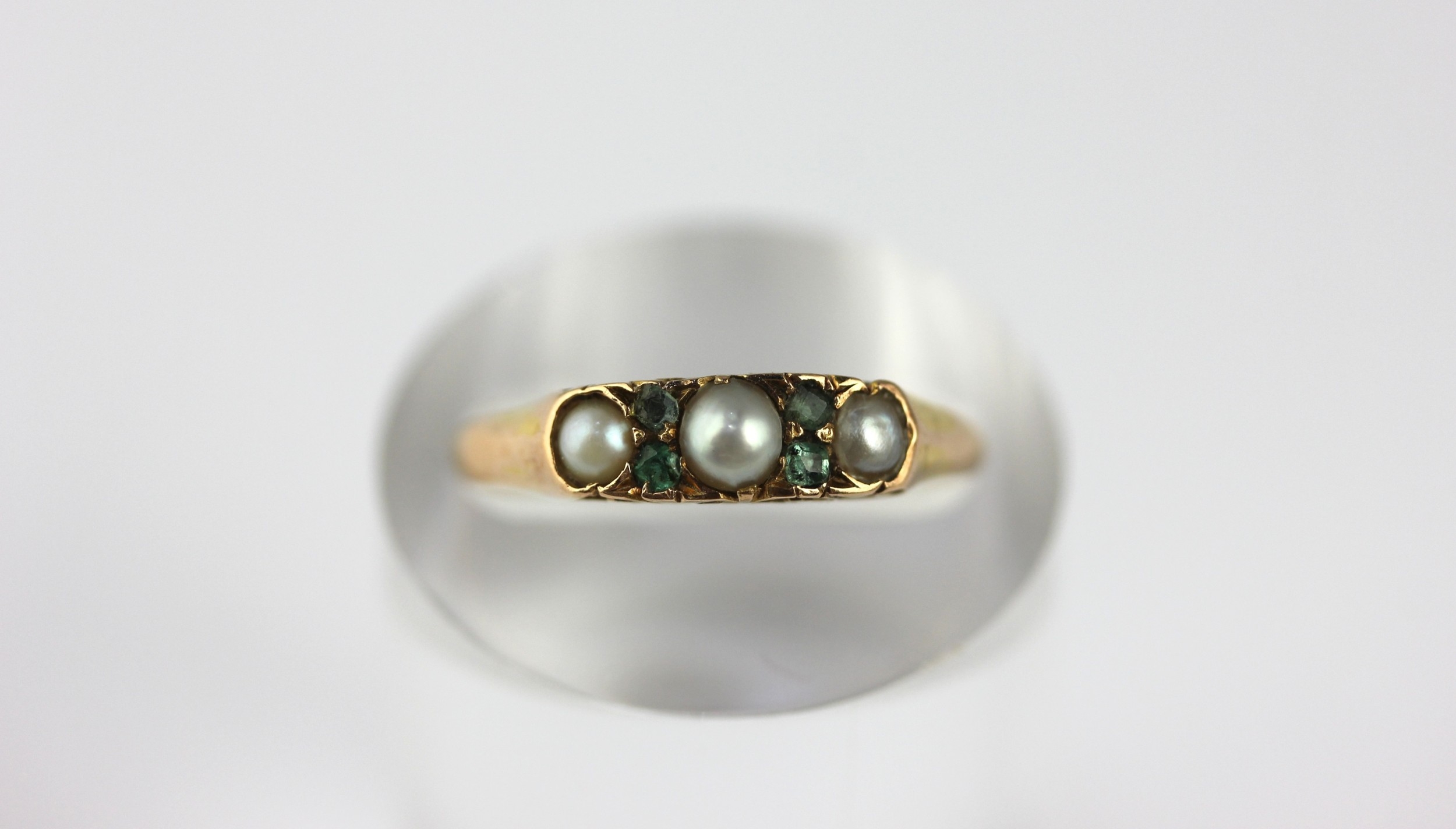 A Victorian 15ct gold ring set with three half pearls, Birmingham 1870, size N, gross weight 2.2g, with a case