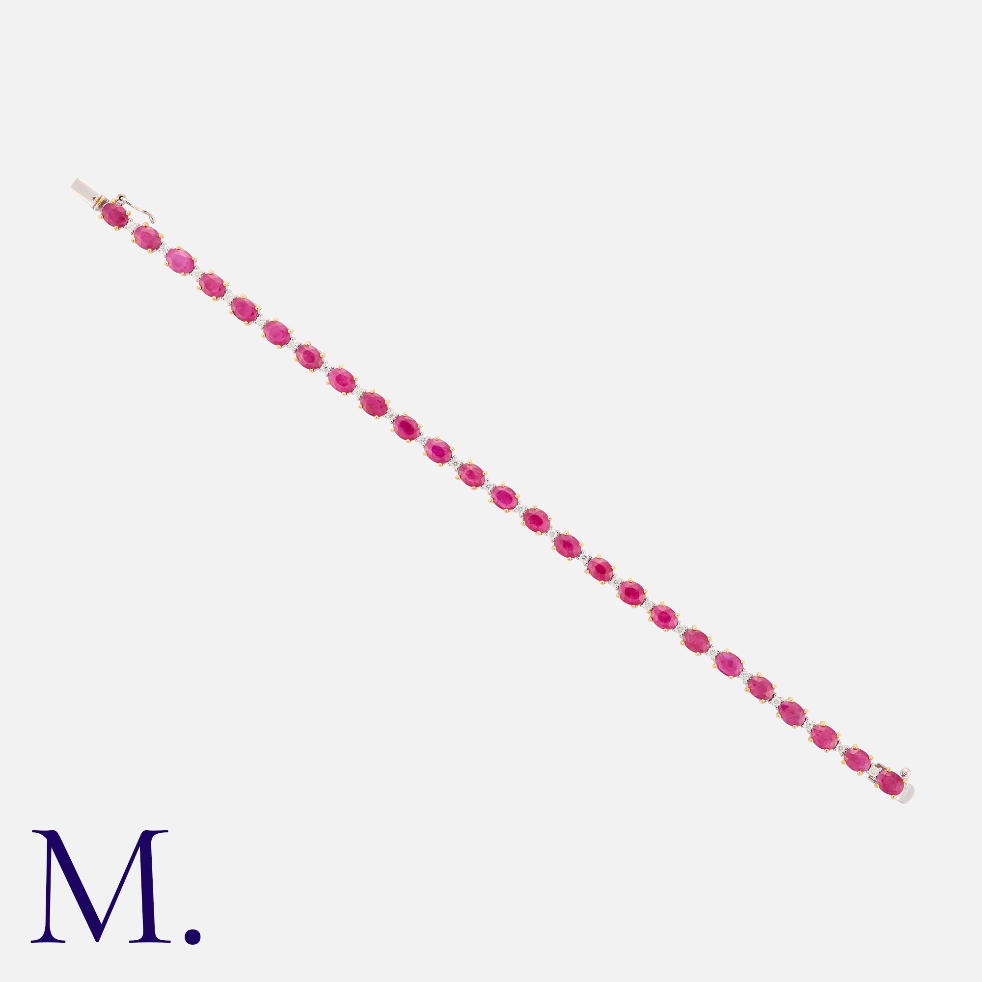 A Ruby And Diamond Line Bracelet in 18k yellow and white gold, set with a row of alternating oval cut rubies and round cut diamonds. Rubies totalling approximately 8.75cts, diamonds totalling approximately 0.48cts. Stamped 750 for 18 carat gold.