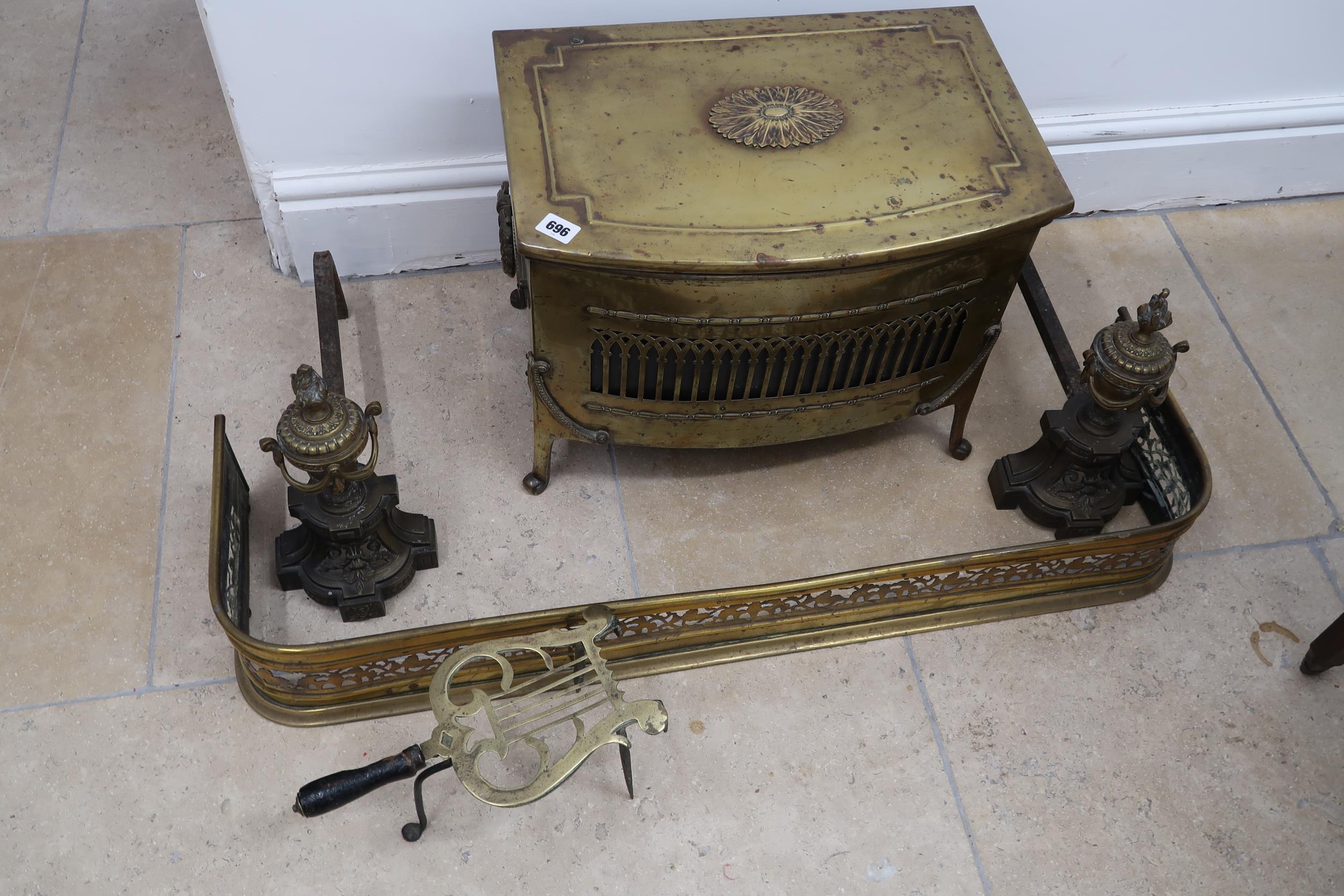 A brass coal box, a pair of fire dogs, a trivet and brass fender - Width 93cm