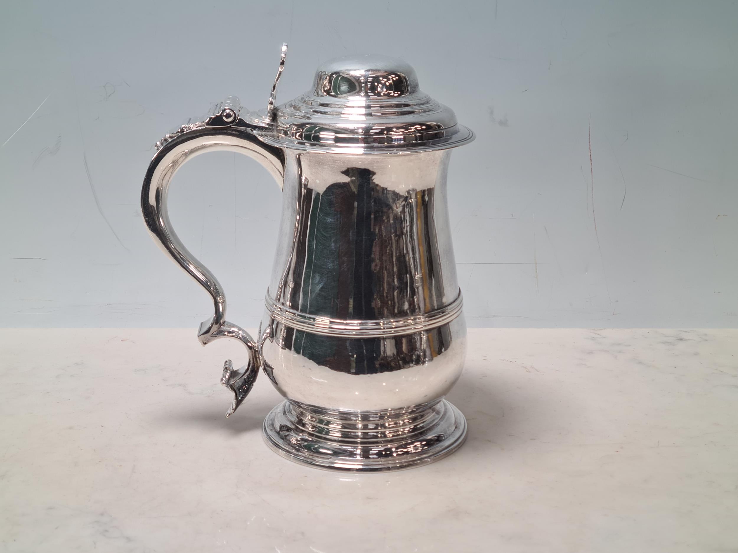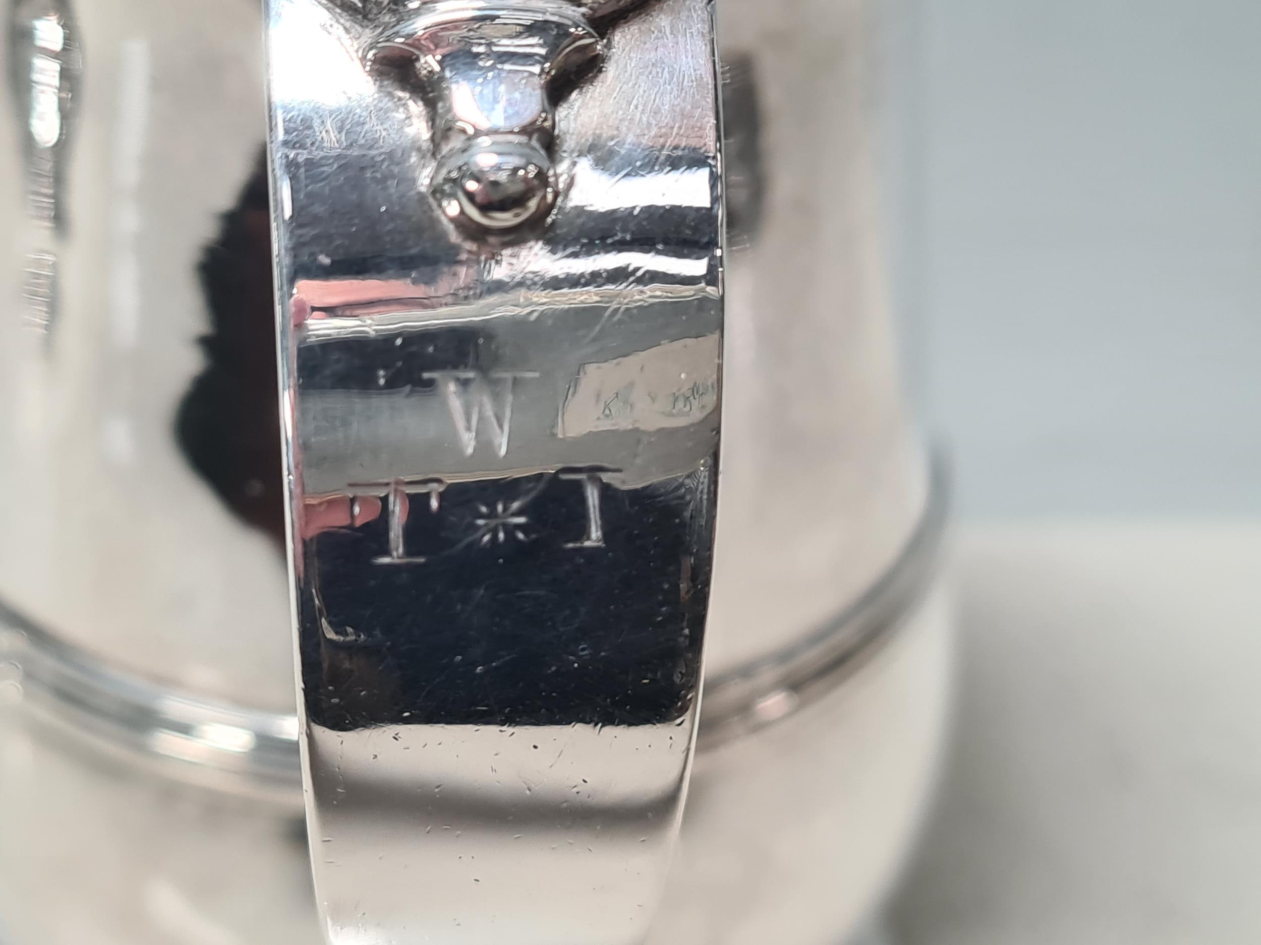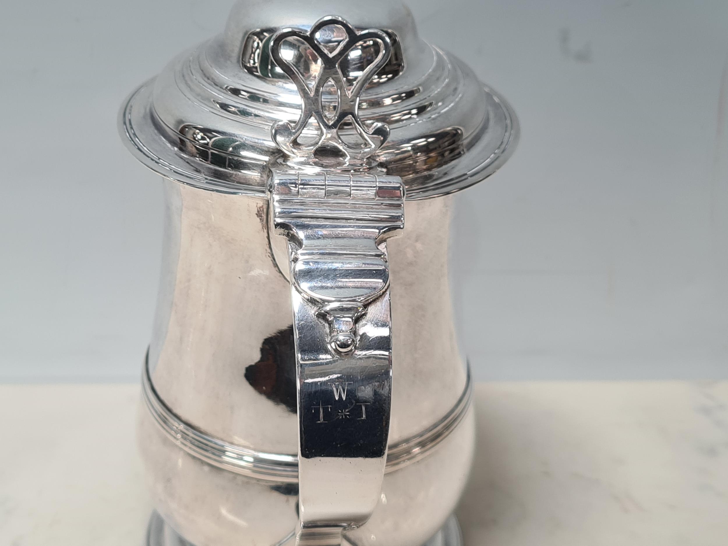 A George III silver lidded baluster Tankard with pierced thumb piece, domed lid scroll handle engraved initials W over T * T, London 1766, maker: gothic W.F, 8 1/4in, 868gms