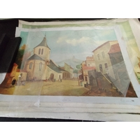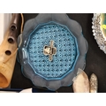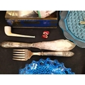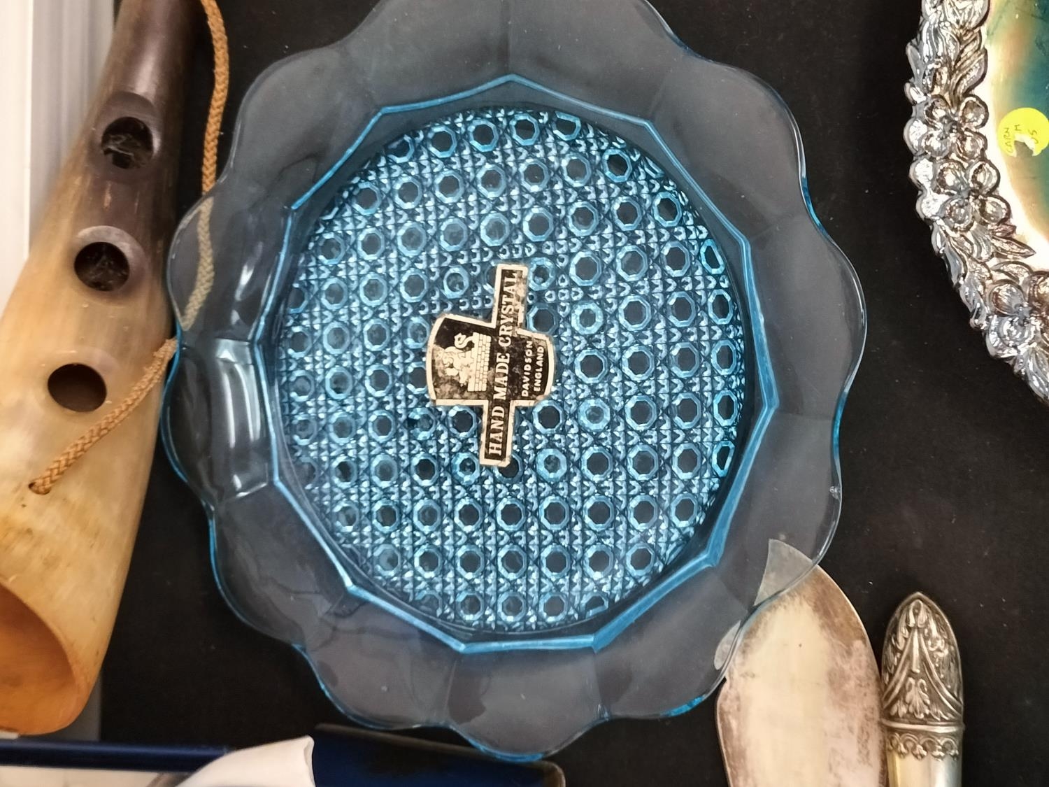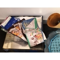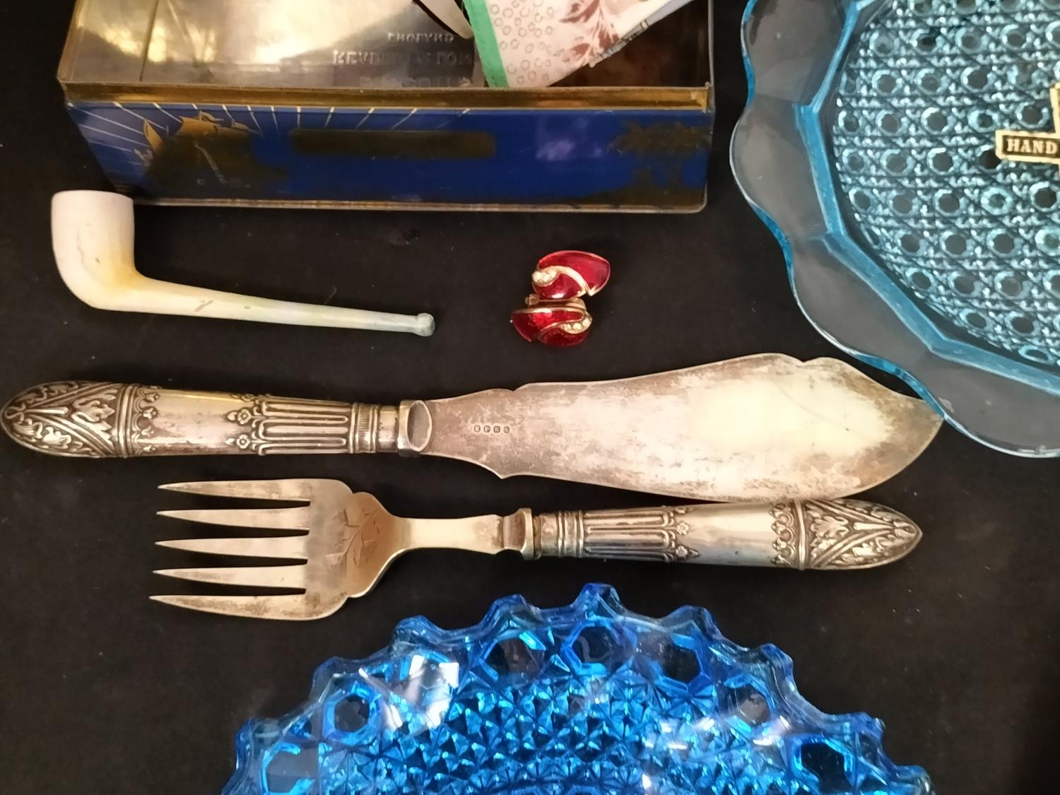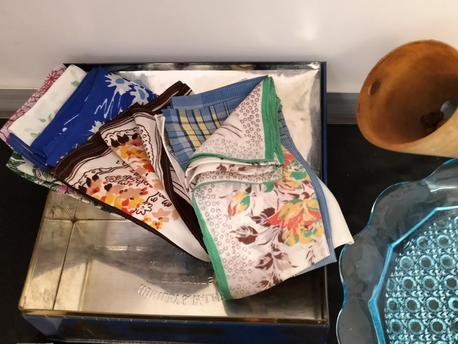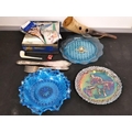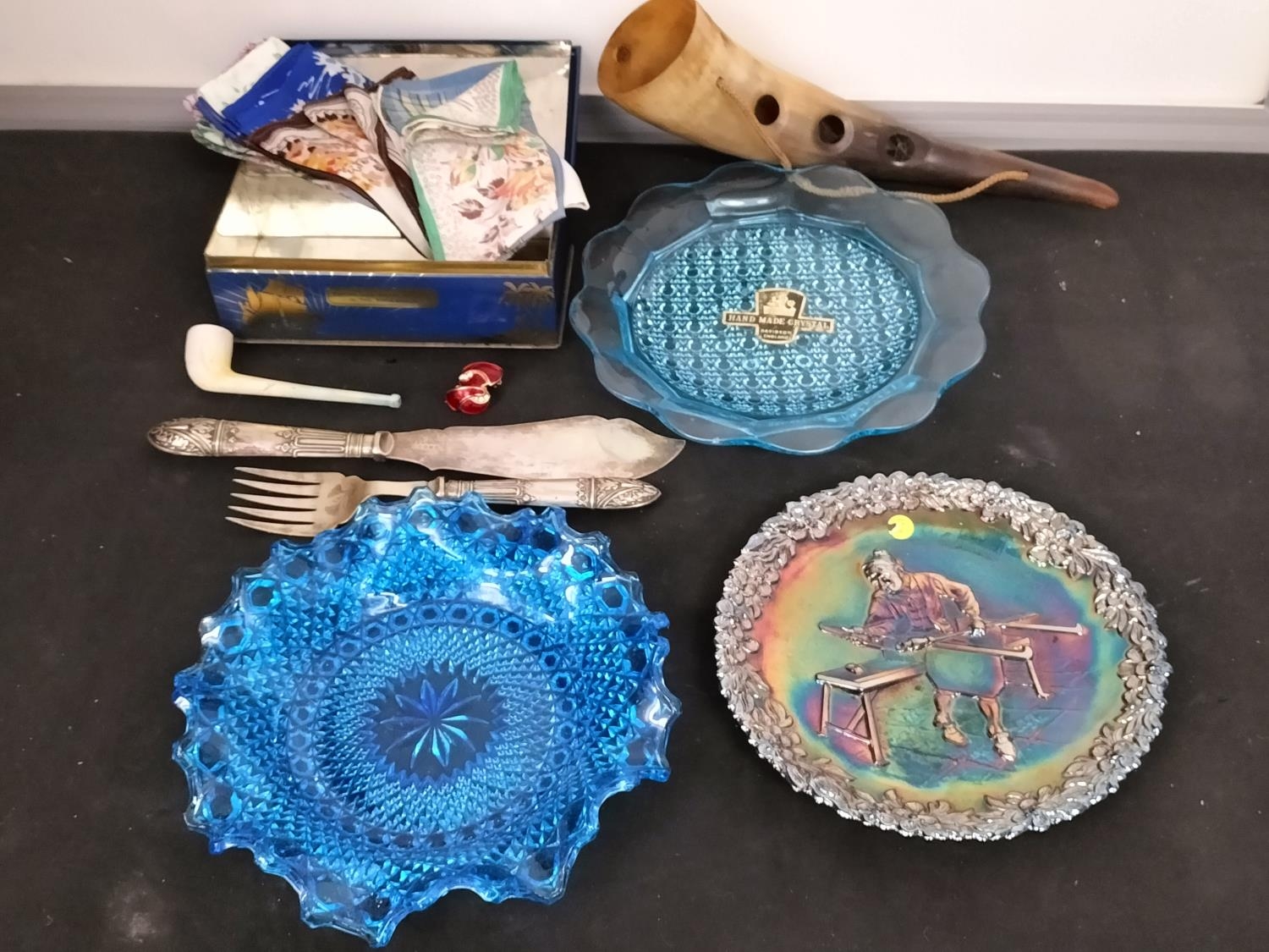 Coloured Glass Plates by Fenton and Davidson (3) plus Huntley and Palmer Biscuit Tin with Vintage Silk and Mixed Collectables.