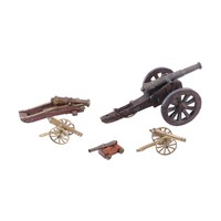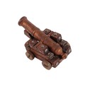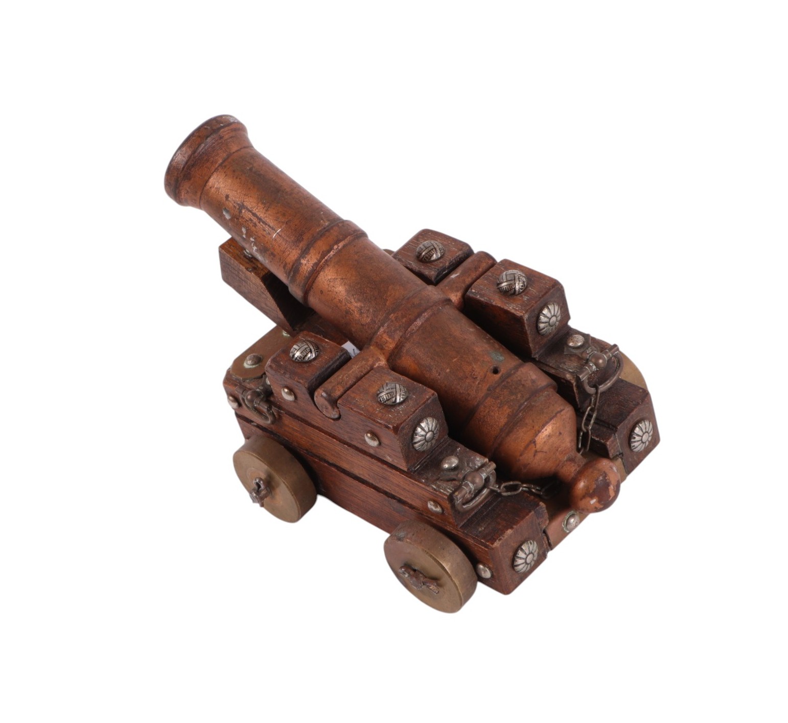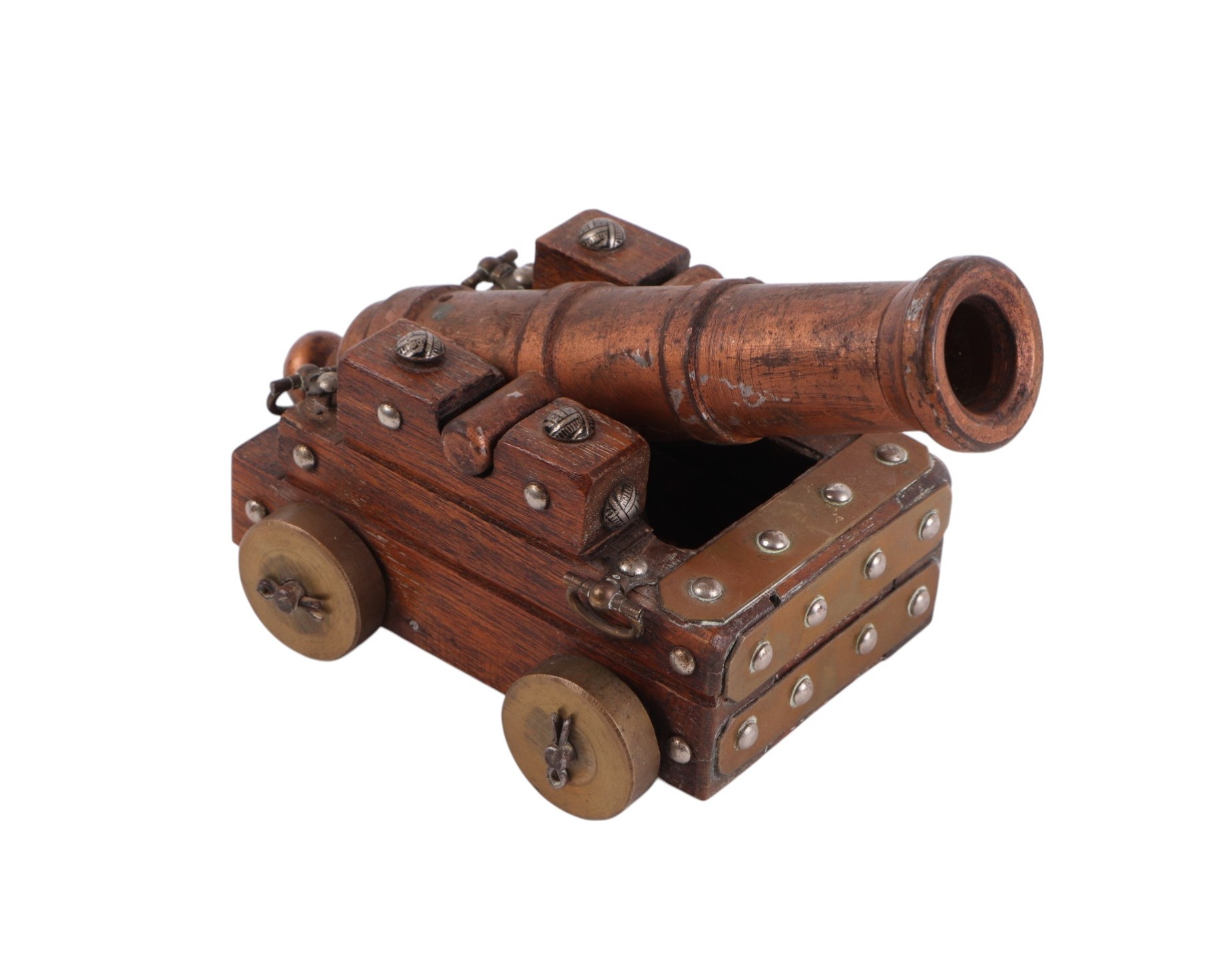 A table-top copper and brass mortar cannon, on a wooden carriage, barrel 20cms long.