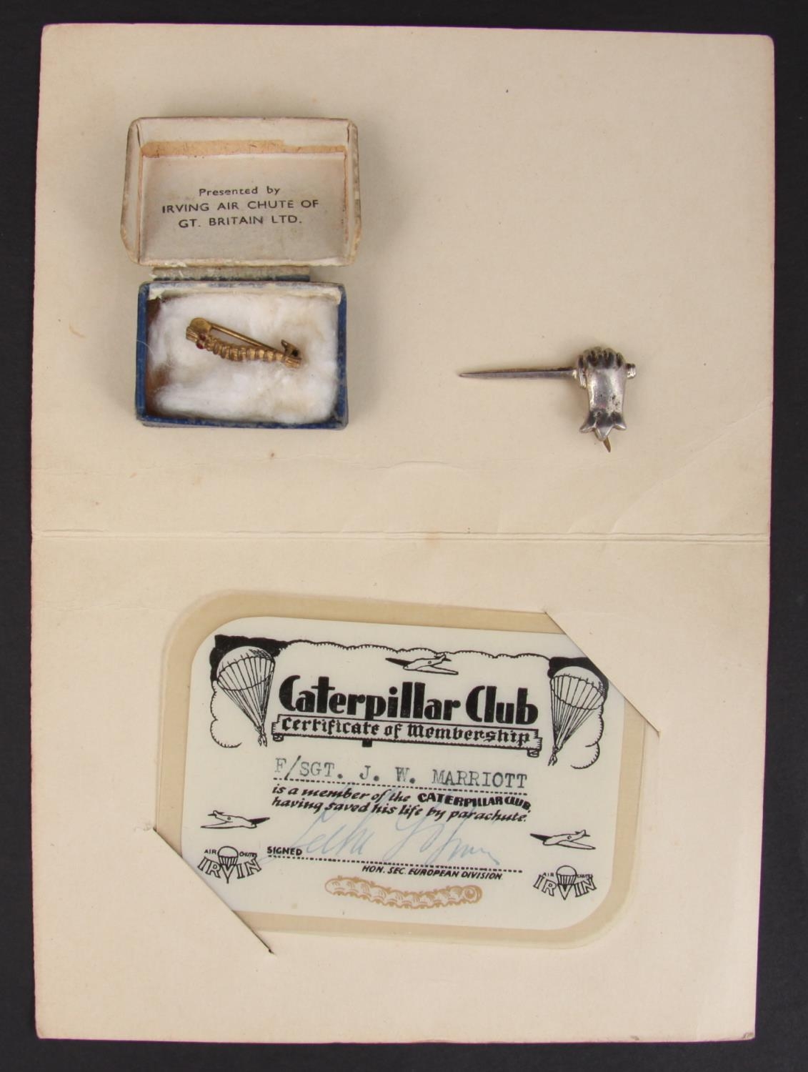 Militaria, Caterpillar Club badge, in box of issue by Irving Air Chute with membership card named to F/SGT J.W. MARRIOTT, extremely rare particularly attributed; with another small silver badge