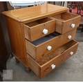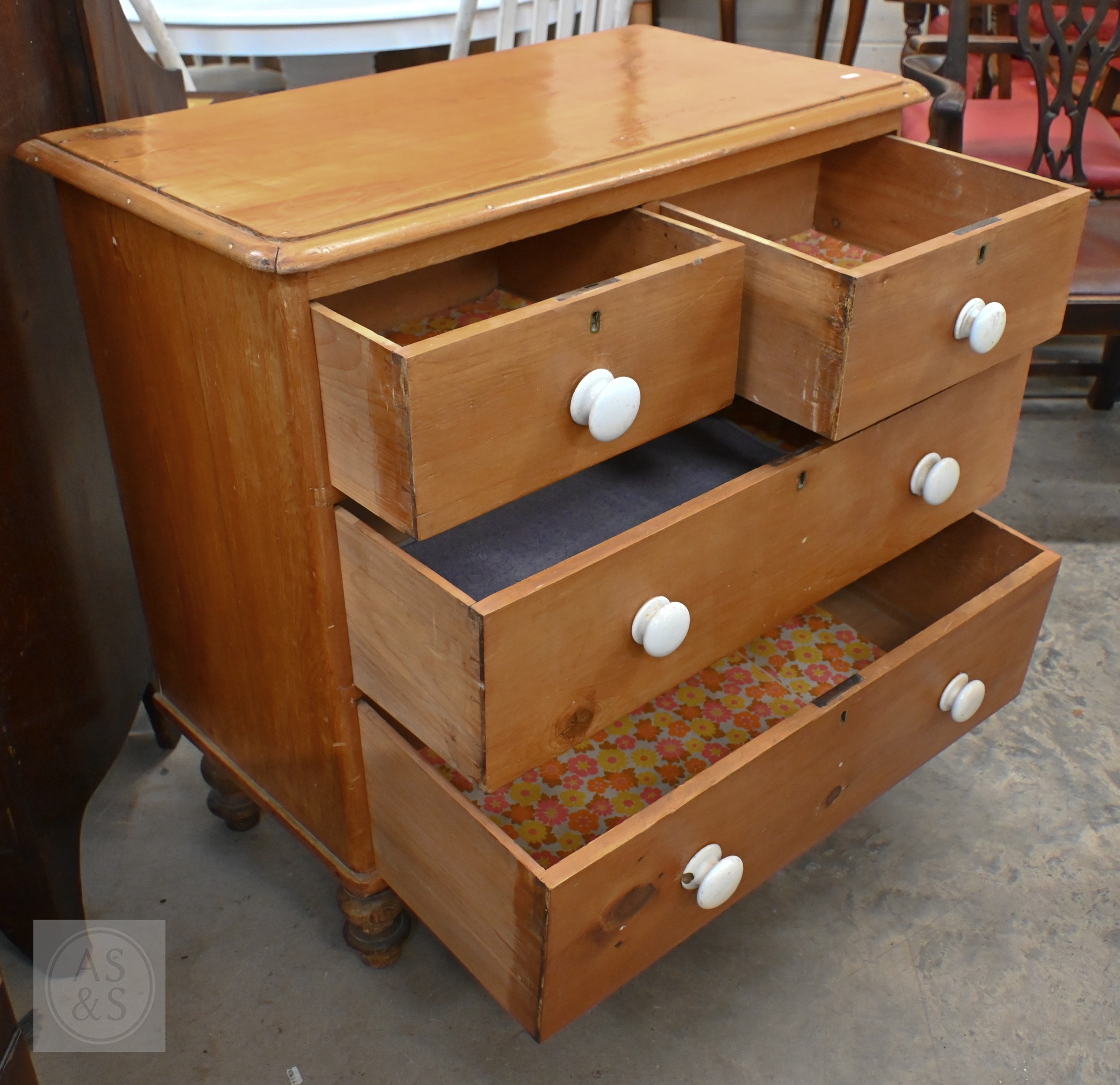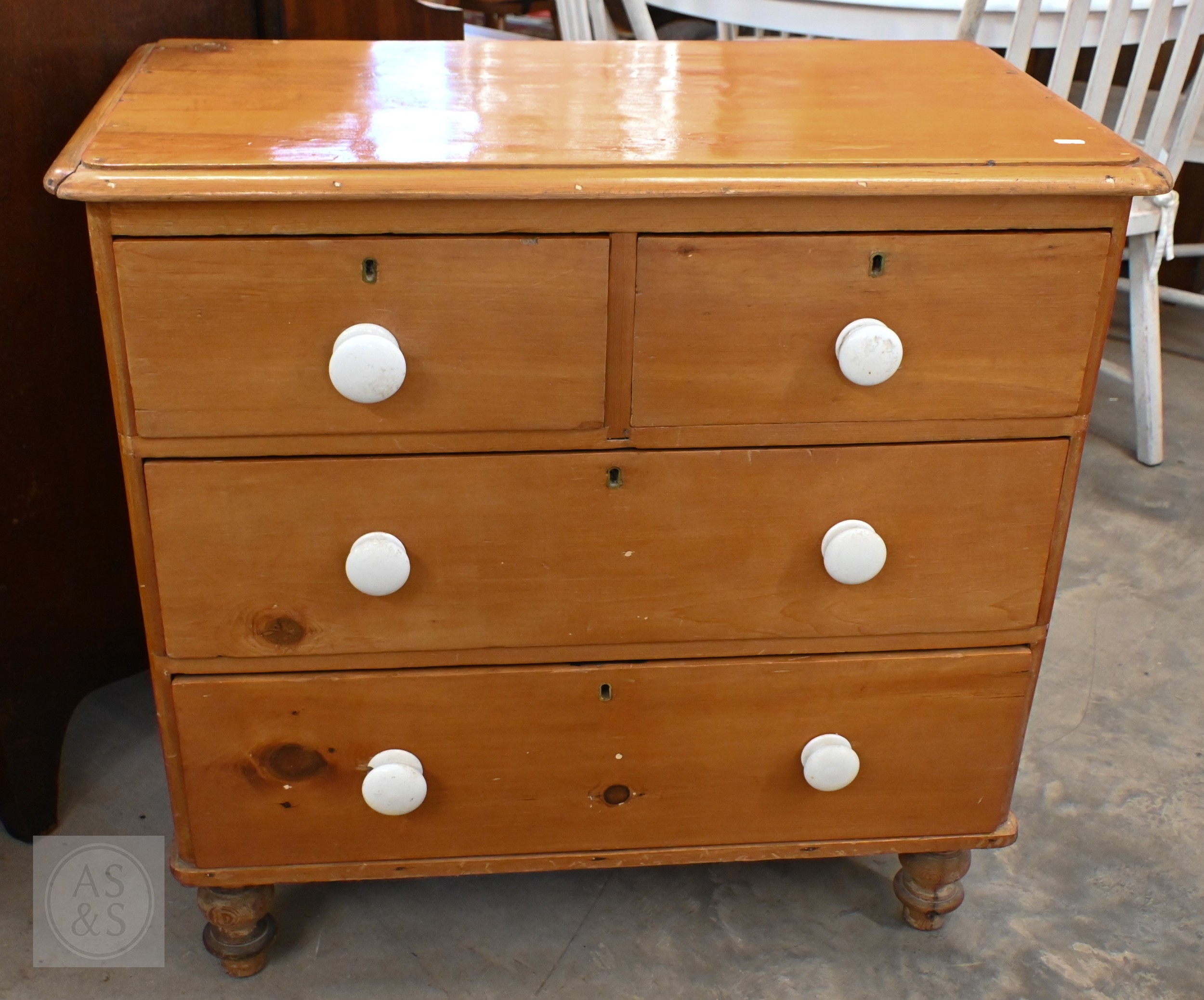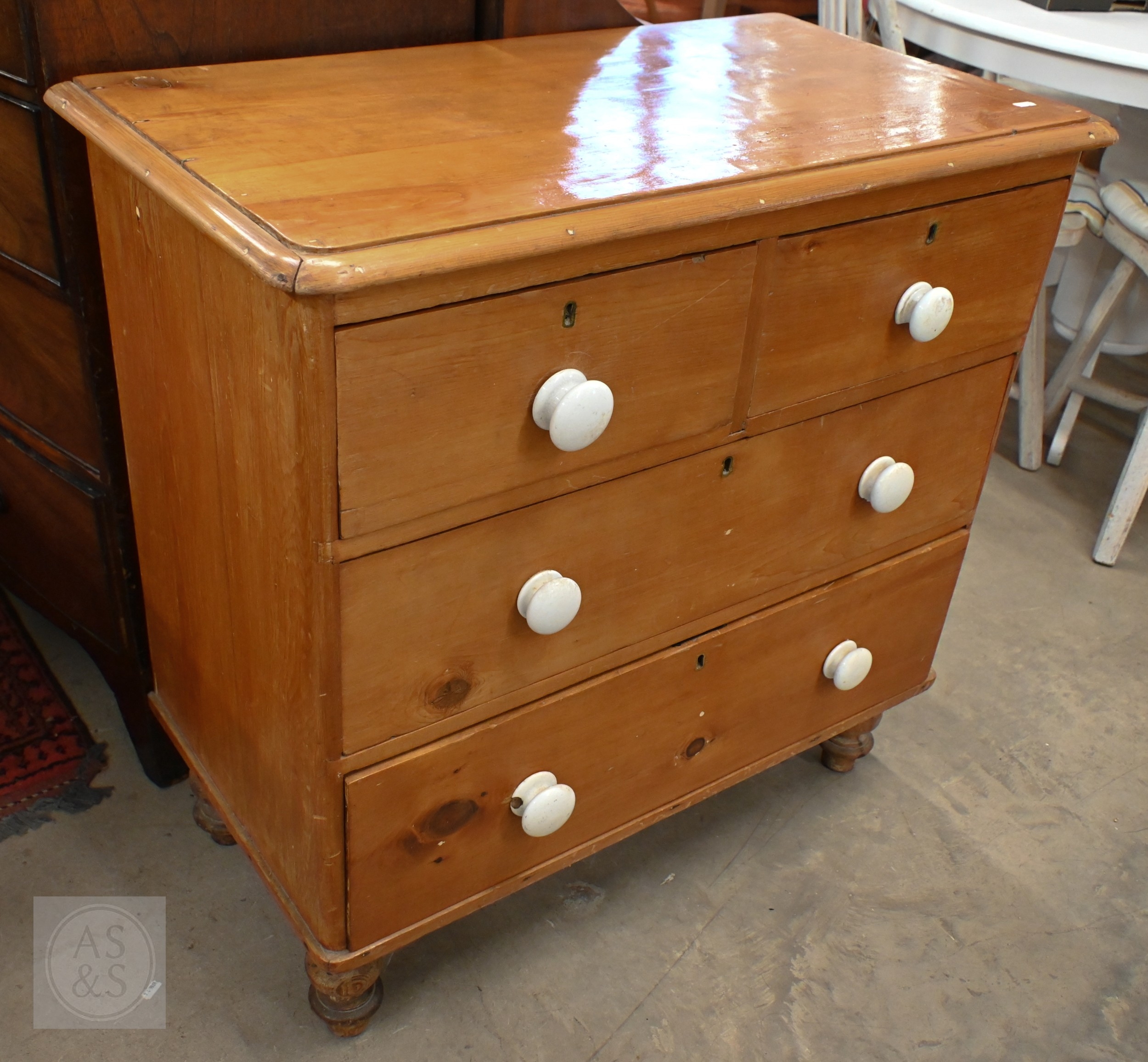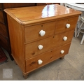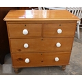A small Victorian pine chest of two short over two long drawers with ceramic handles and turned foot, 88 x 46 x 84 cm high