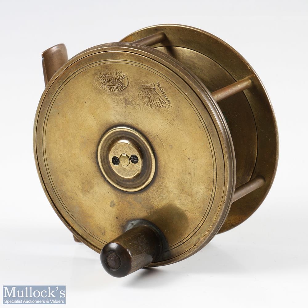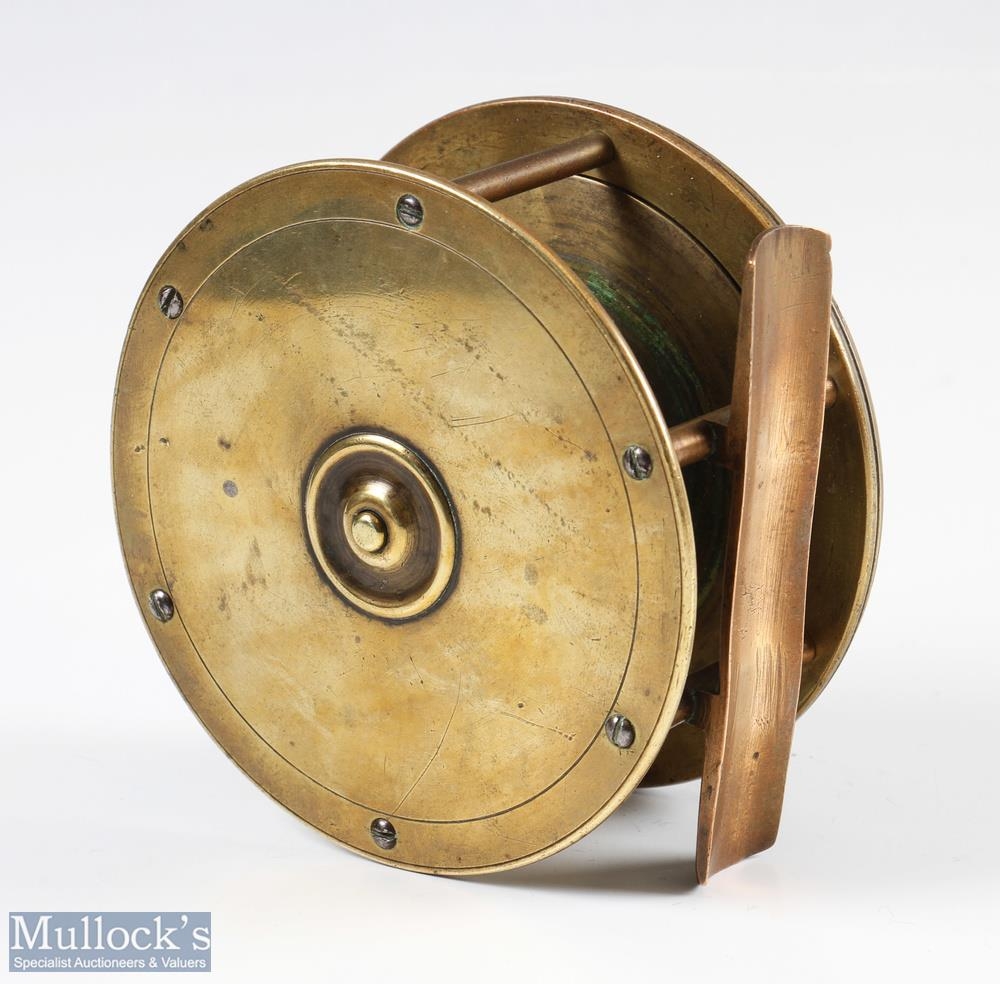 Hardy Bros 4" Birmingham all brass plate fly reel with large handle, good maker's Rod in Hand and Oval logo to plate wind, fixed check, appears in good condition overall