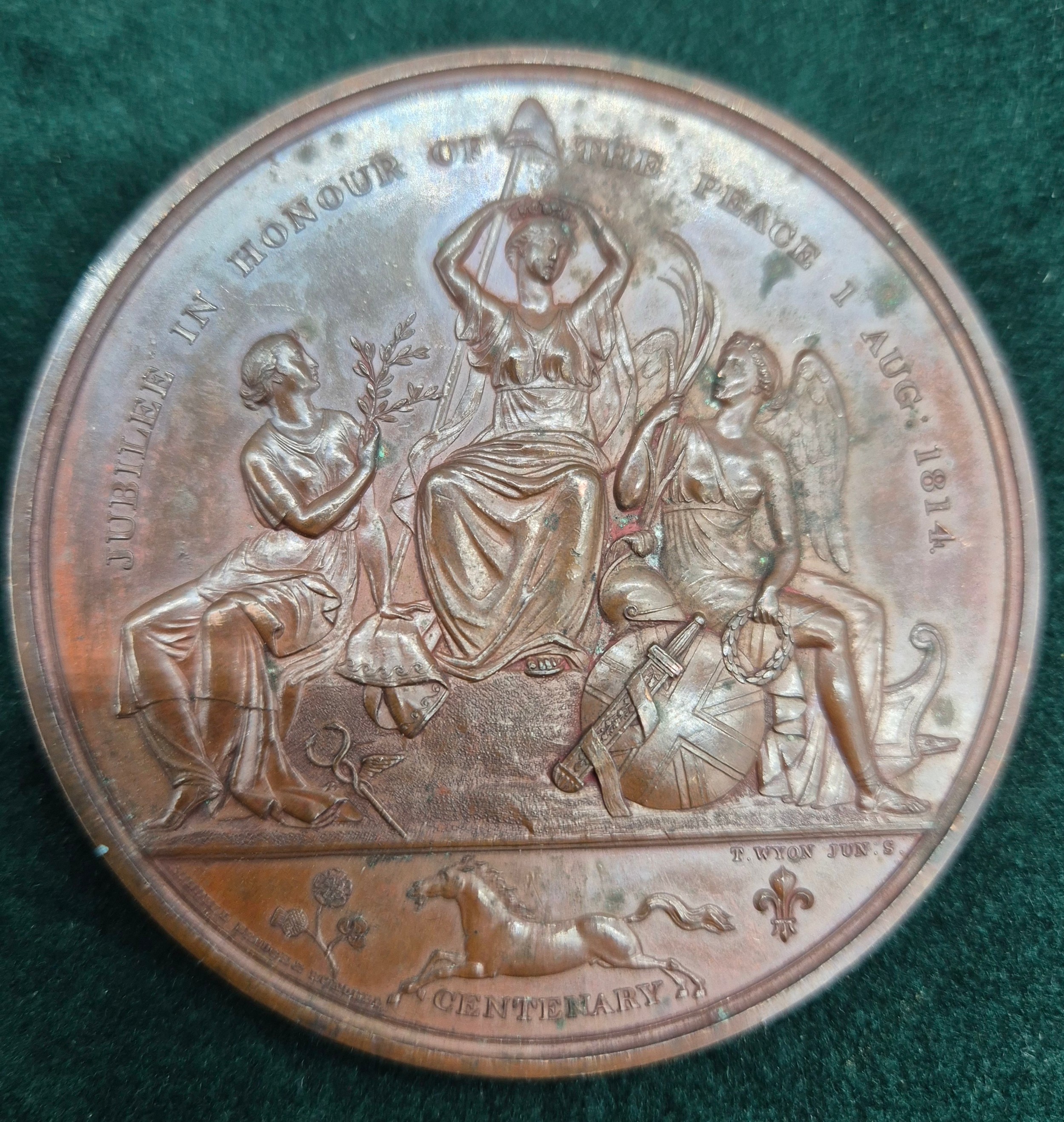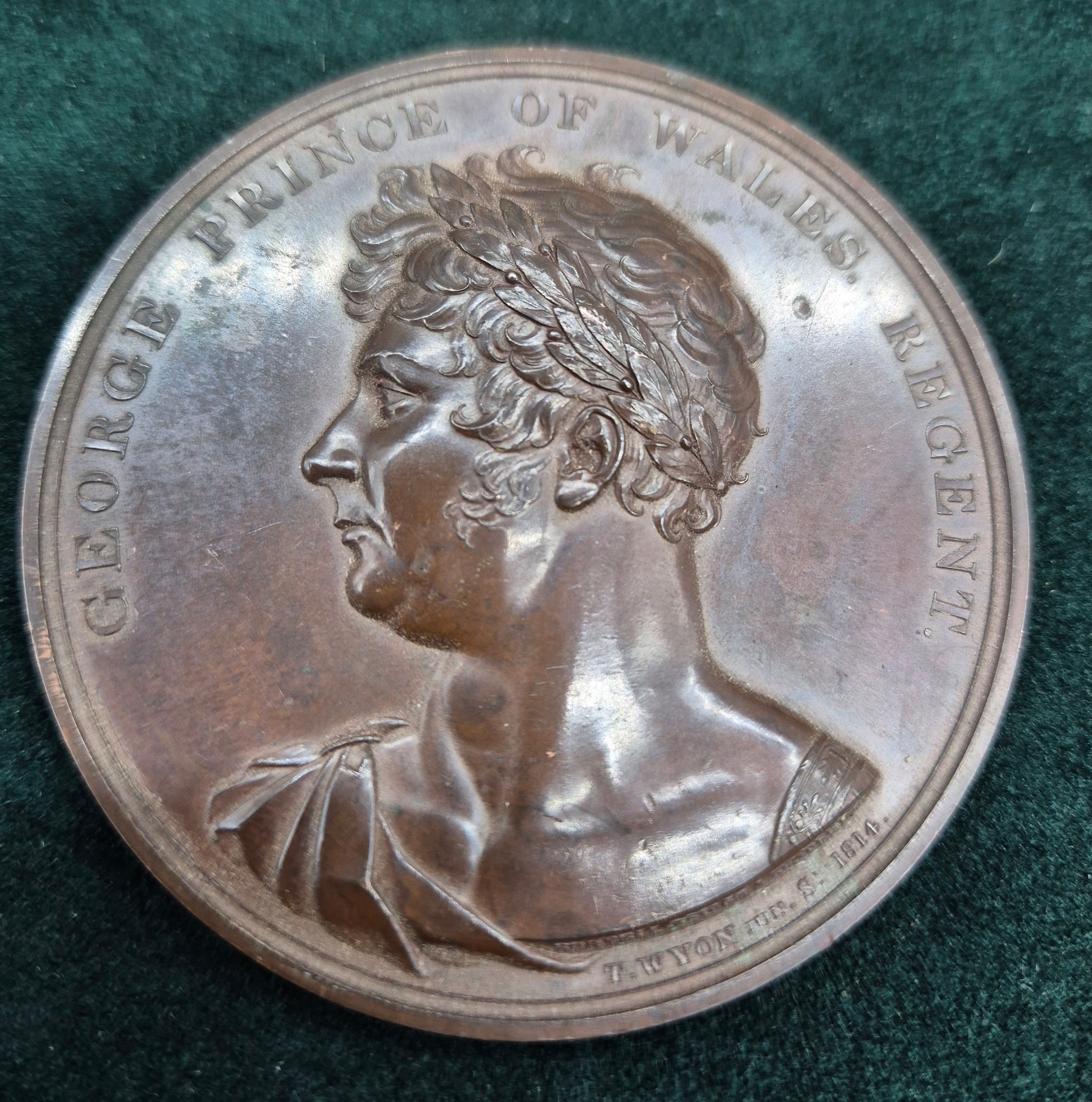 Antique bronze Medallion- George Prince of Wales Regent, Jubilee in Honour of the Peace 1st August 1814. Rundell Bridge & Rundell. T. WYON. Jun S: 1814. [6.9CM Diameter]