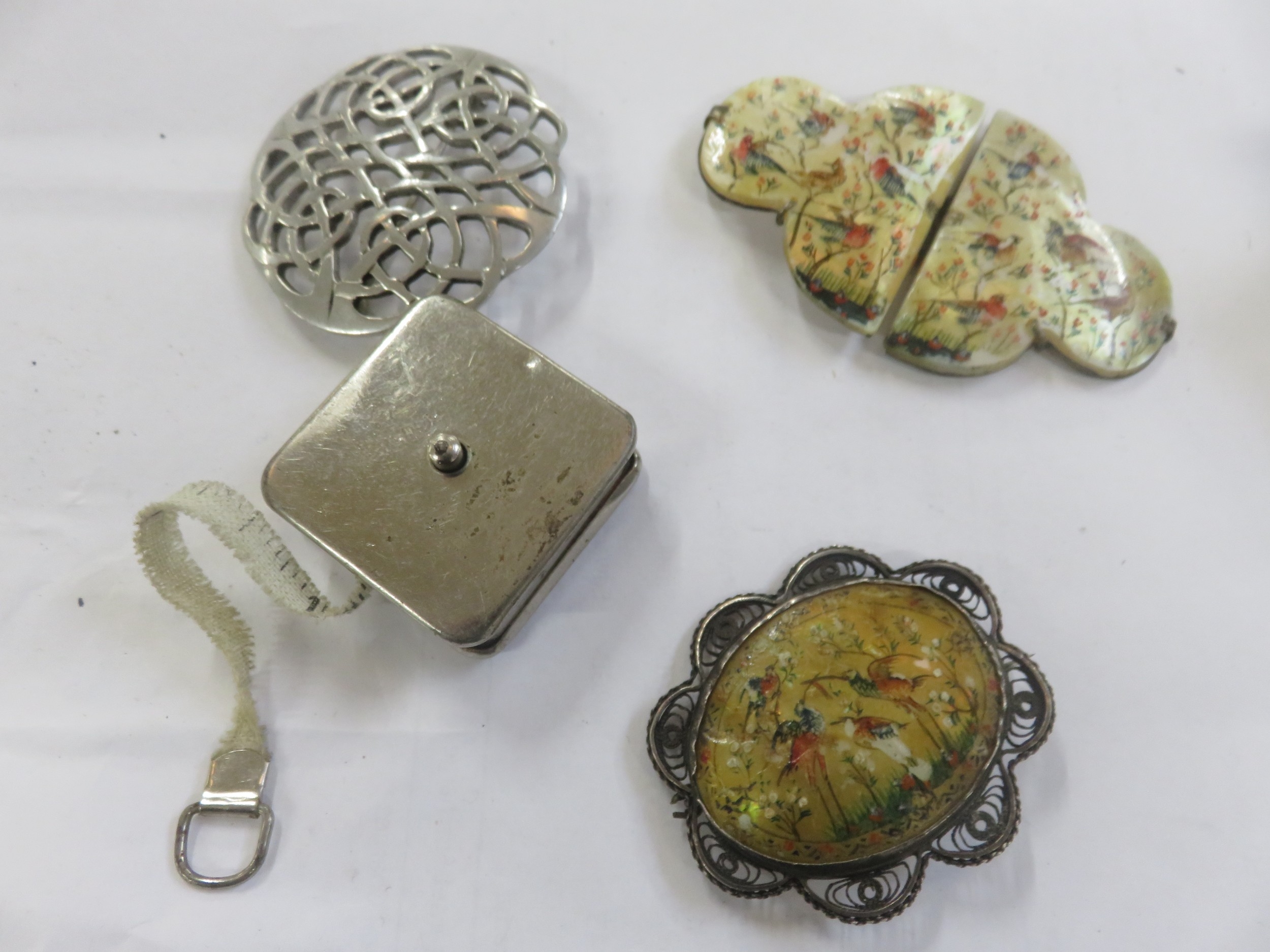 Mother of Pearl Eastern Buckle and Brooch, Celtic Brooch and a Tape Measure