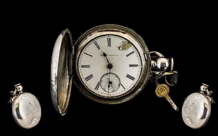 Large Silver Full Hunter Pocket Watch White Enamelled Dial, Roman Numerals With Subsidiary Seconds, Marked National Watch Co. 59mm Coin Silver Case Numbered 14874, Movement Marked National Watch Co New York 13535, Key Wind, Ticking Stop Starter, Balance Ok, Dial With Hairlines And Chip, Case With Dent And Engraved William Gray