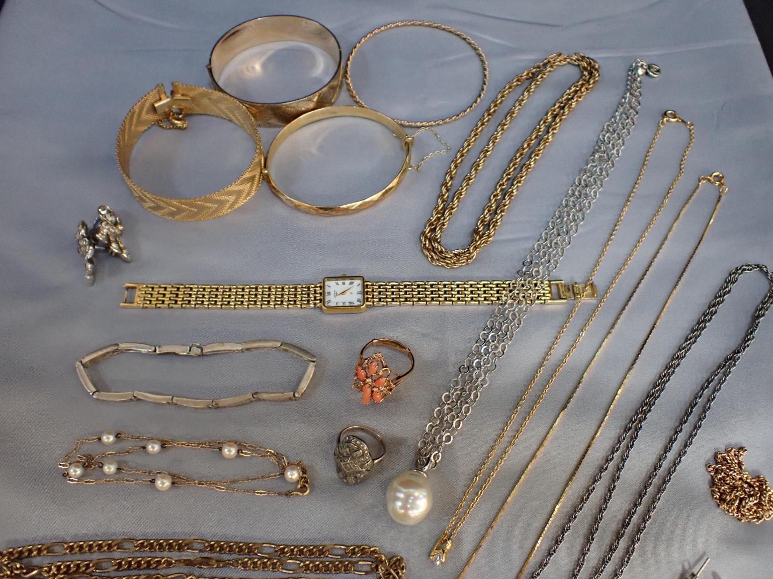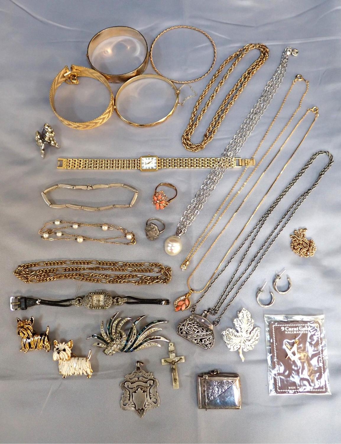 A COLLECTION OF COSTUME JEWELLERYincluding a silver vesta case, a silver fob and a 9ct gold Masonic pendant