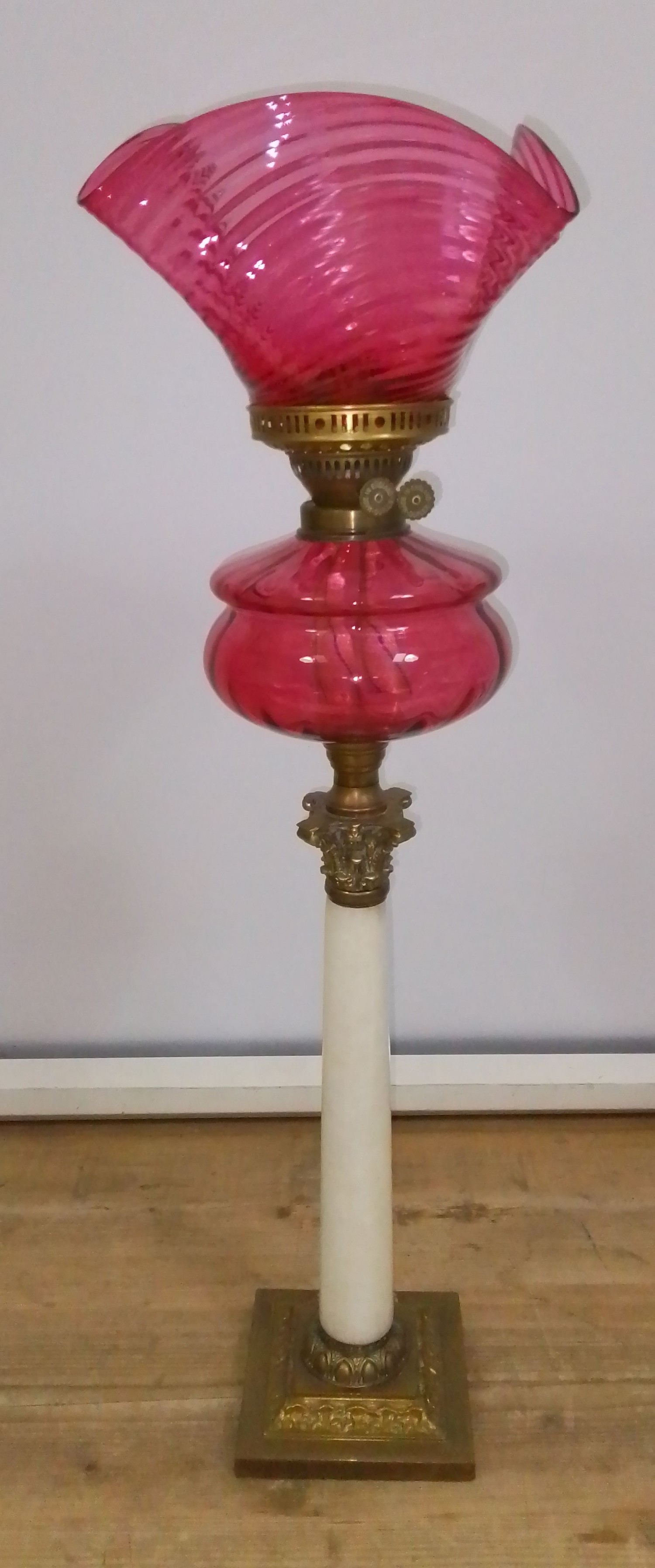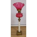 A Victorian cranberry glass oil lamp, ribbed shade, Duplex fitting, cranberry reservoir, Corinthian brass mounted and marbled glass column, height 77cm.