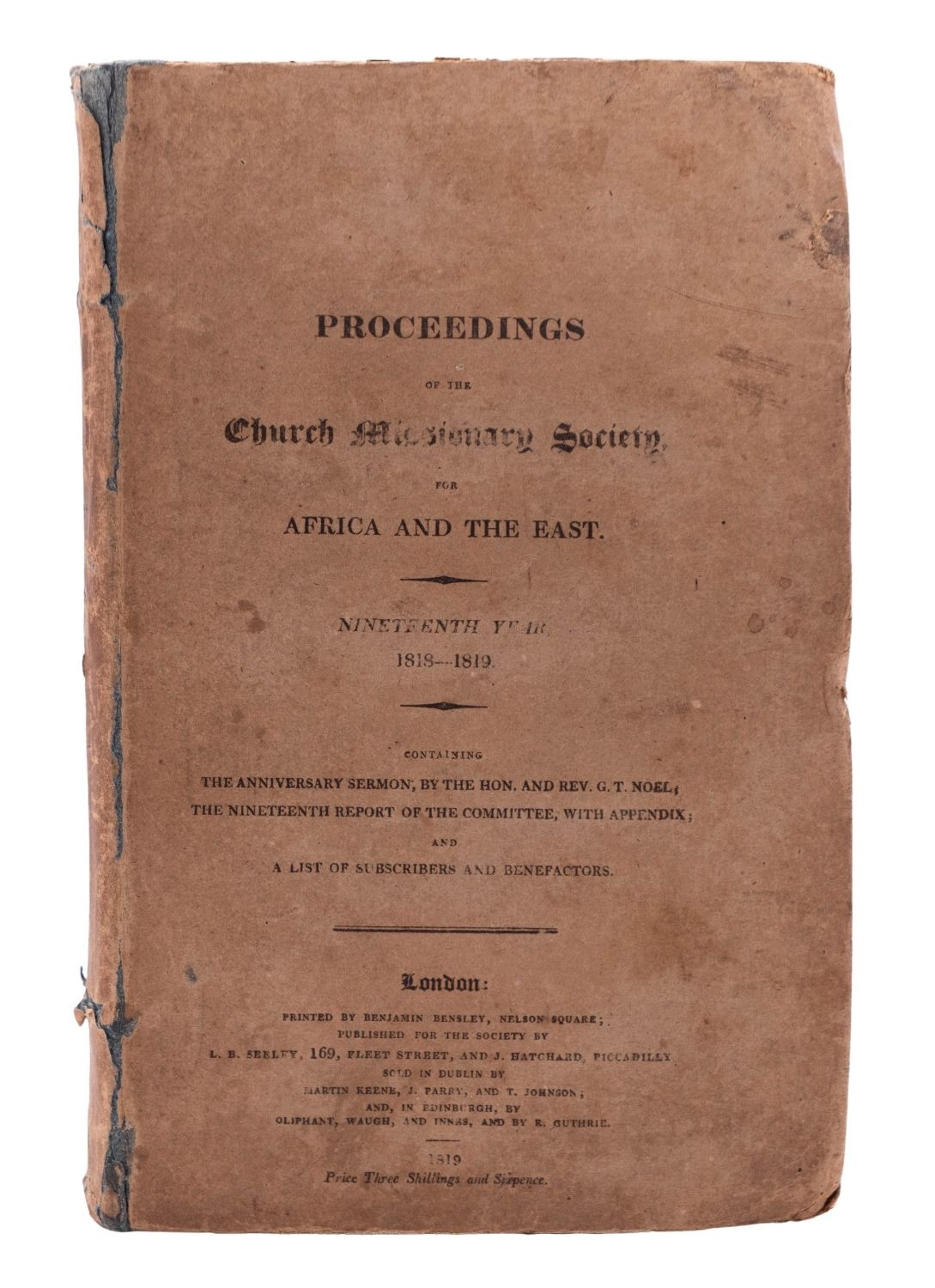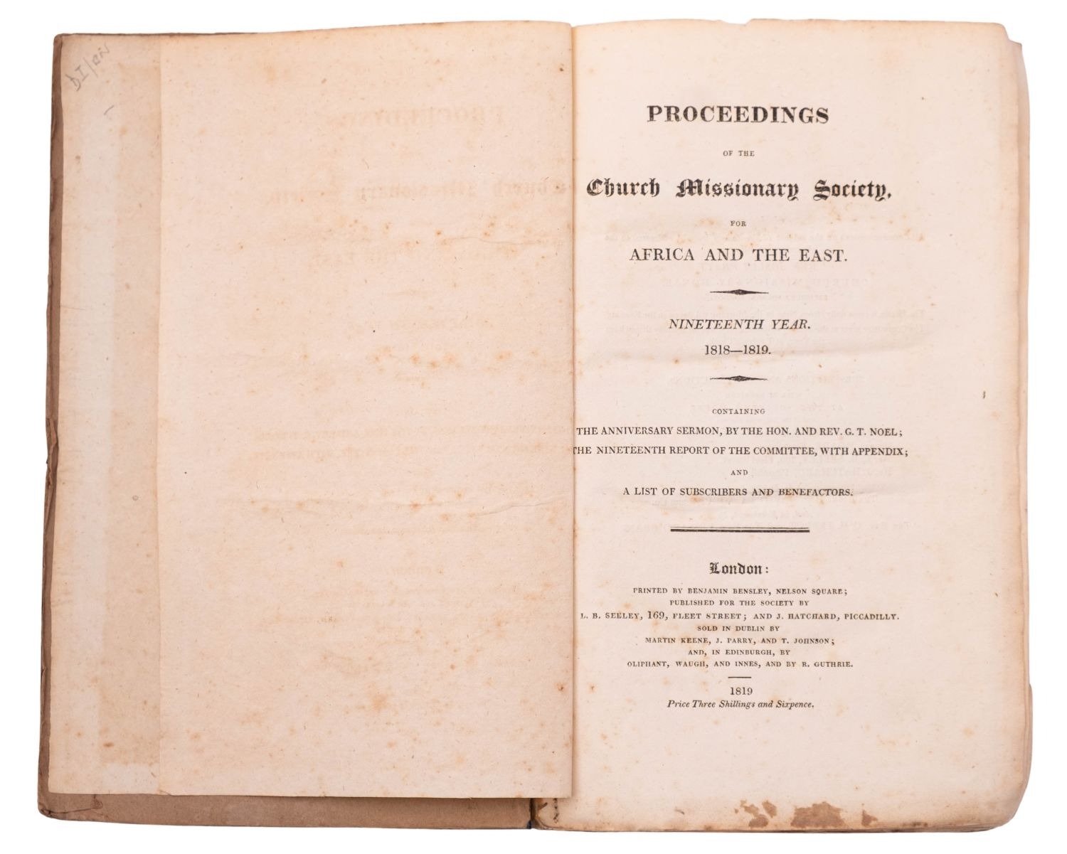CHURCH MISSIONARY SOCIETY. Proceedings of the Church Missionary Society for Africa and The East... 1818-1819, London: For The Society by L.B. Seeley and J. Hatchard, 1819, some spotting, orig boards scuffed, lg. 8vo; together with... JACKSON, W. Stories and Lessons On the Catechism, Vol. II (only), London: J. and C. Mozley, 1855, contemp. half-calf scuffed, 12mo. (2)