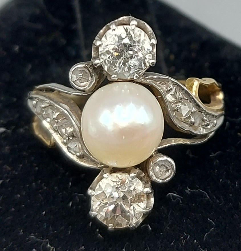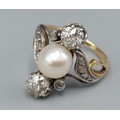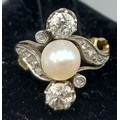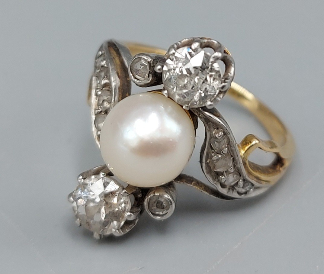 A gold ring set with a central Pearl flanked by two Diamonds within a Diamond mounted scroll setting, 4.5gms, ring size, the Diamonds approx. 0.30ct each, ring size J