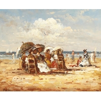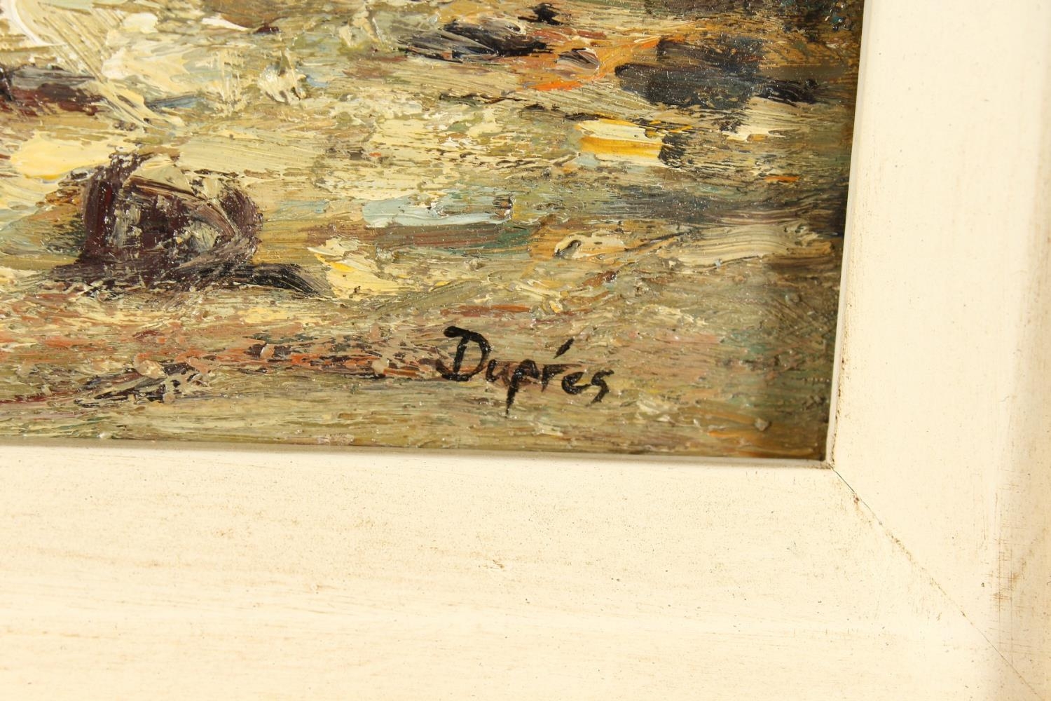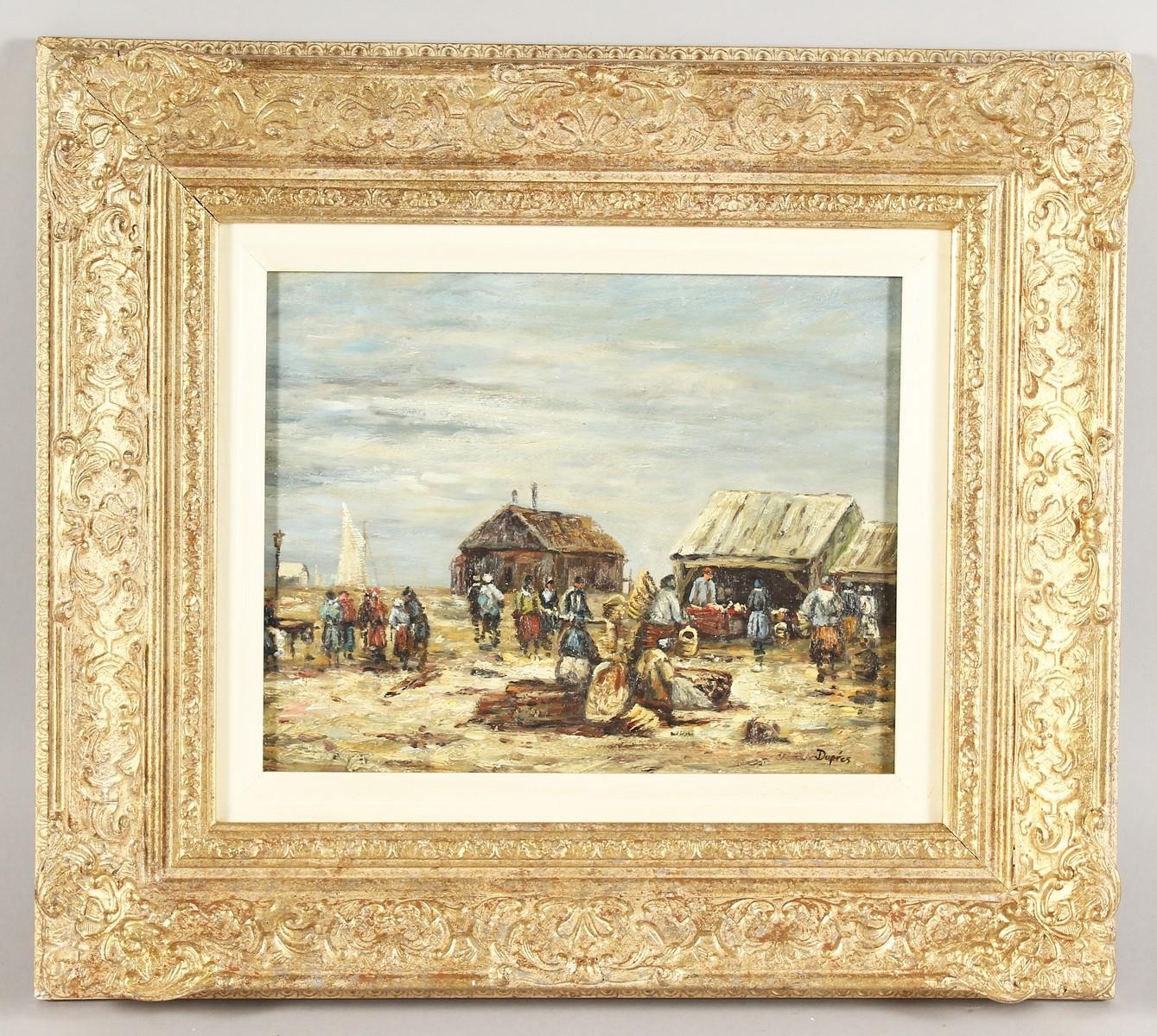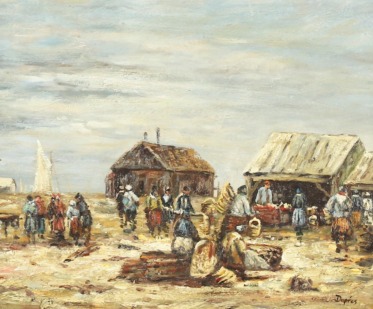 20th century continental school, A beach scene with figures at a Fish market, oil on board, signed 'Dupres', 8" x 10".