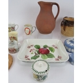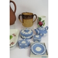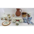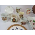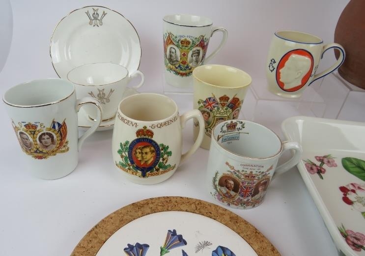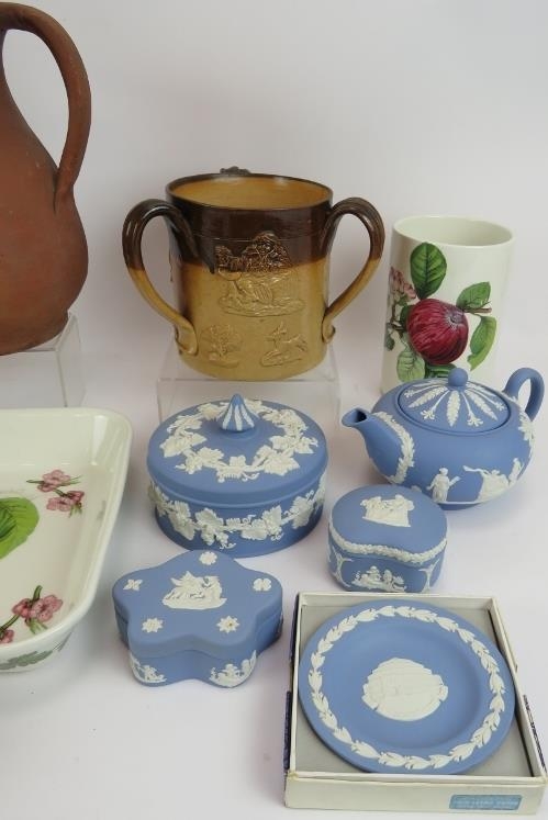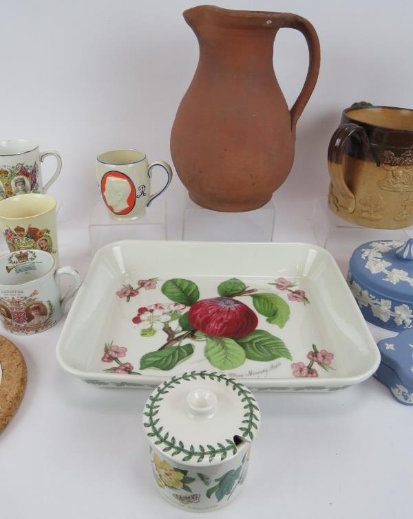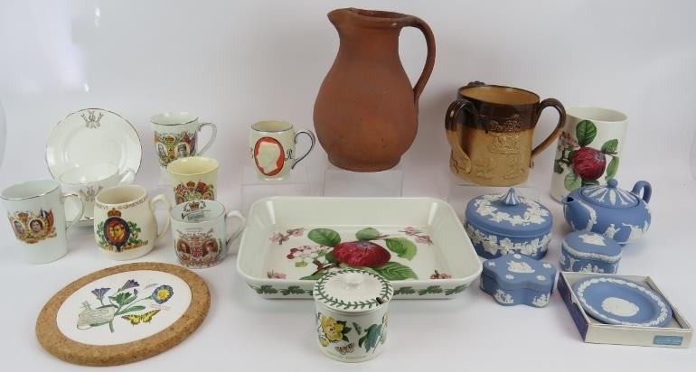 A mixed lot of collectable ceramics including Royal commemorative mugs, Wedgwood Jasperware, Harvest jug and Portmeirion ware. (19).