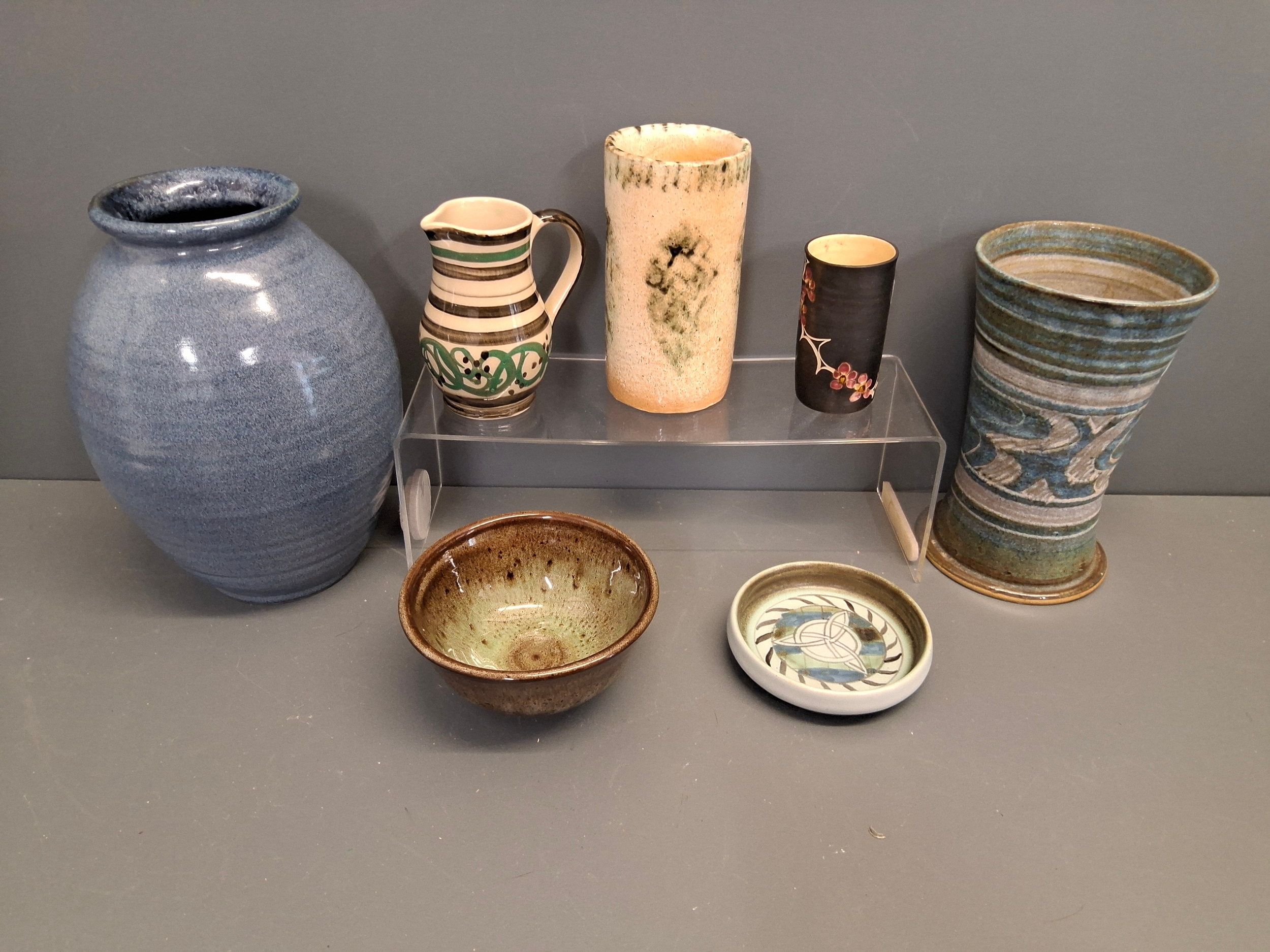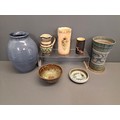 A collection of Studio Pottery items. To include a Marazion vase, Buckfast Abbey bowl, buchan pin dish & jug plus 3 other vases. Tallest one 23cm