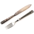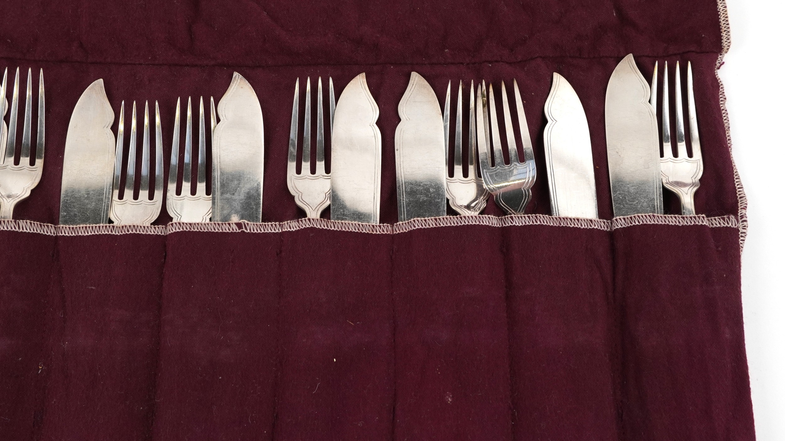 A set of twelve King's pattern silver plated knives and forks with cloth bag.