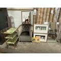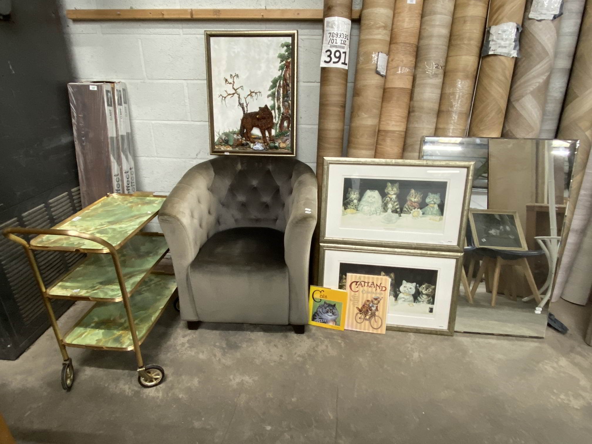 Grey velvet button back tub chair 80H 73W & a vintage tea trolley 80H 69W 36D etc