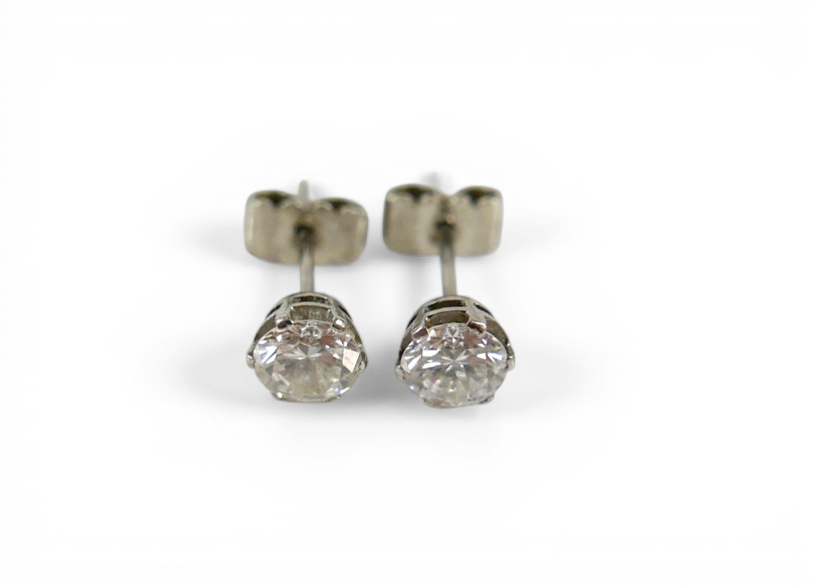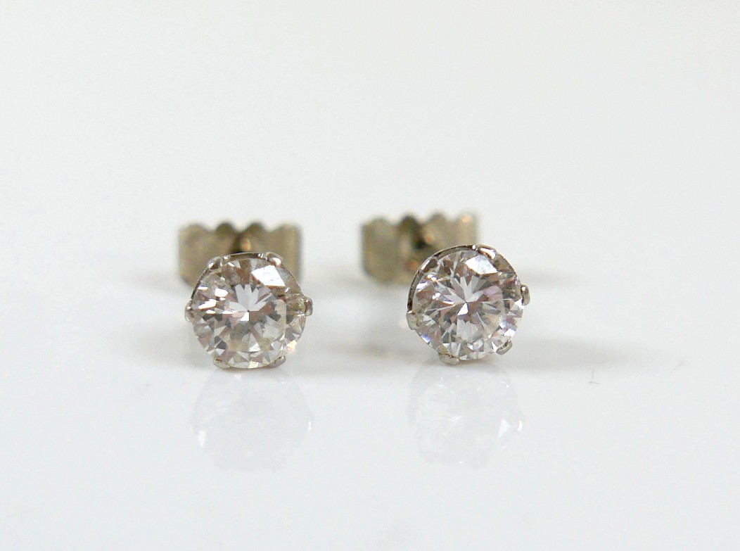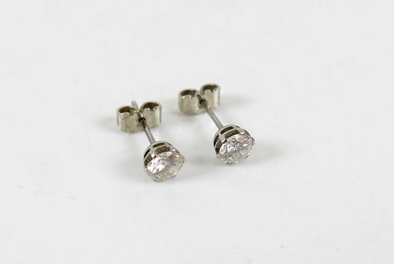 A pair of diamond set single stone earrings, each consisting of a round brilliant cut diamond, measuring 5.2mm in diameter, claw set to a white basket style setting, post and scroll fittings for pierced ears, testing as platinum and valued accordingly, estimated total diamond weight approximately 1.00 metric carat (H/I/VVS), gross item weight 1.7g, last insurance valuation was in 2002. (1)