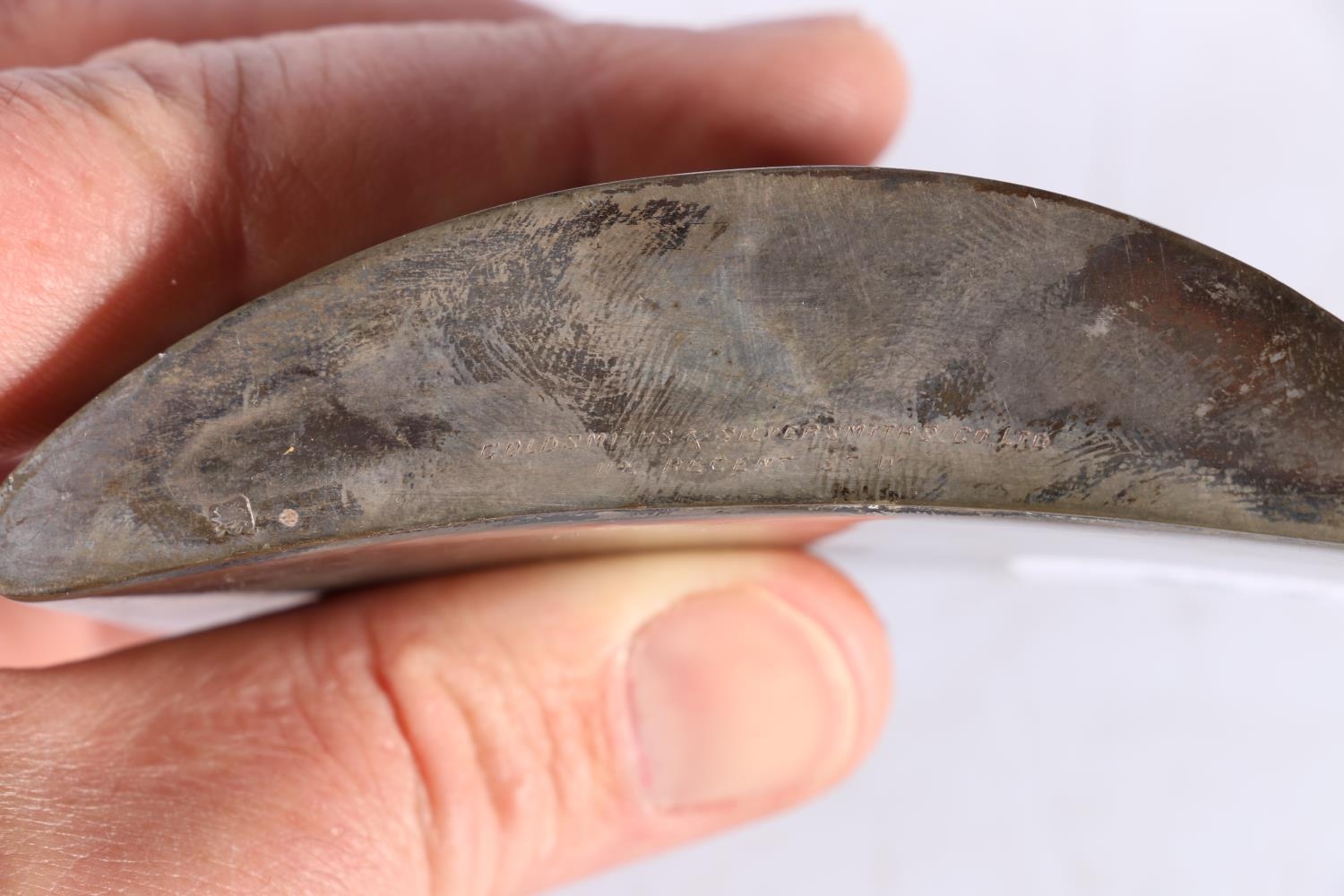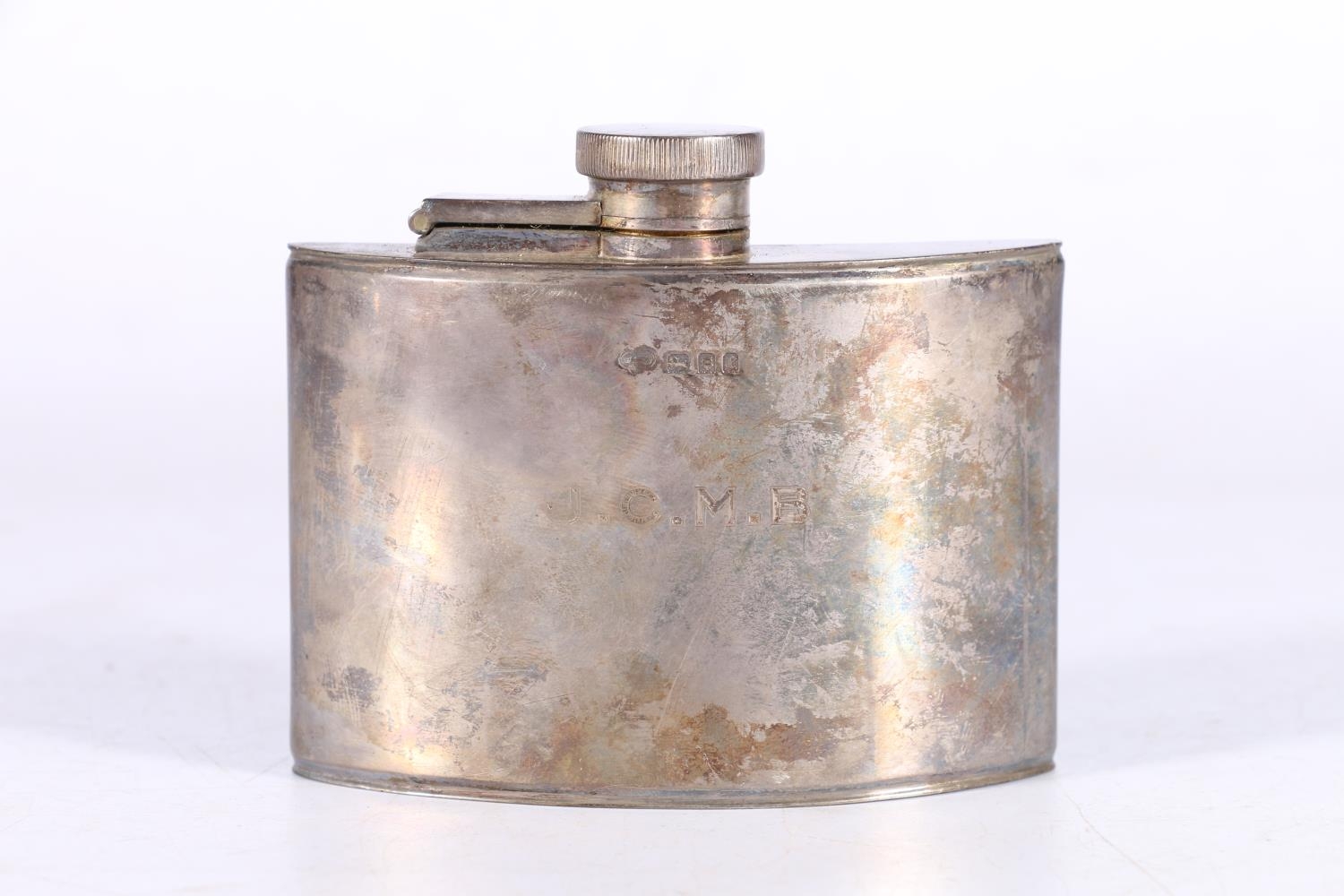 An Art Deco period silver hip spirit flask of crescent moon shape by Goldsmiths and Silversmiths Company Ltd, London 1920, 121g