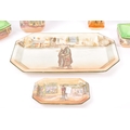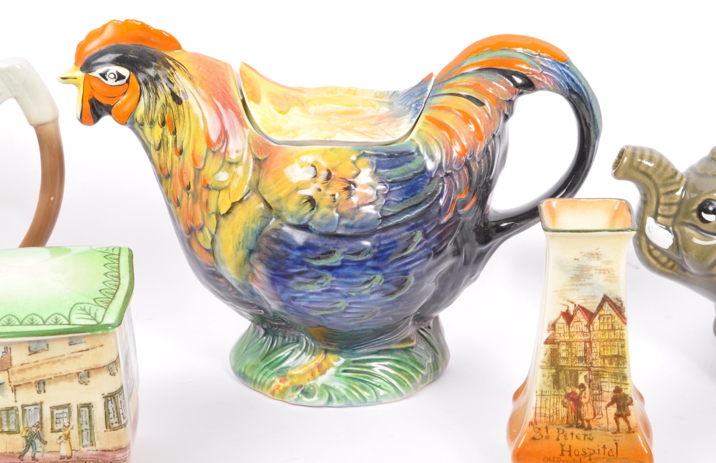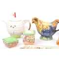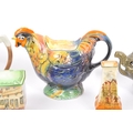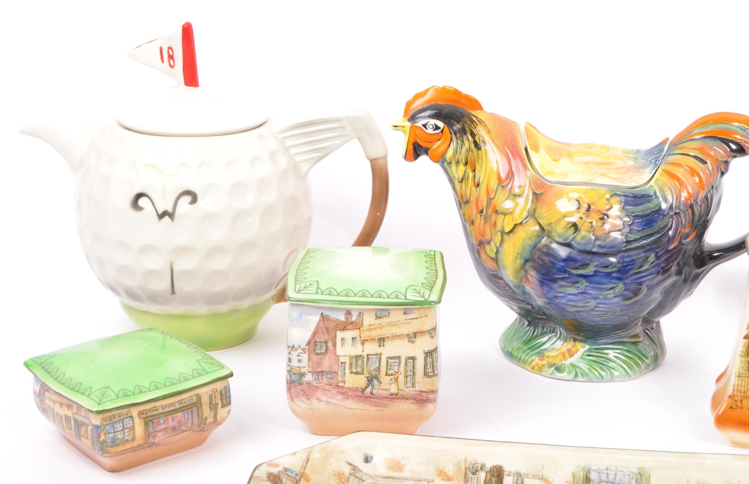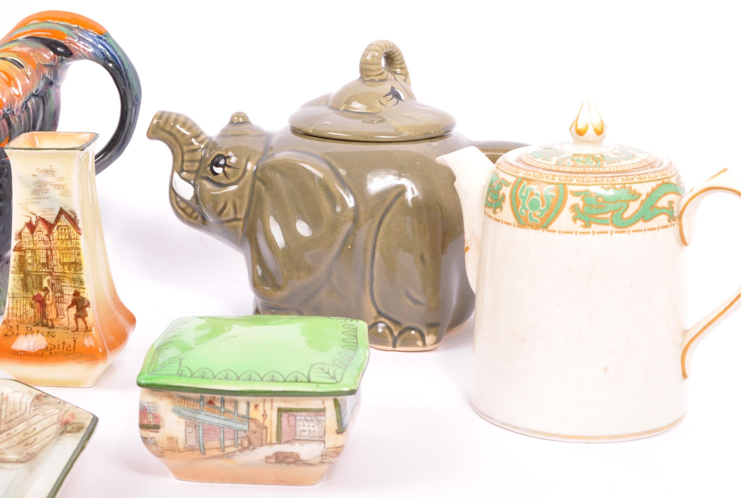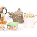 A collection of vintage 20th century ceramic pottery teapots. Comprising of English Rooster teapot, Sylvac style elephant teapot, Tony Wood studio pottery golf ball teapot. Together with Royal Doulton lidded pots, steam vase, display platter and dish. Booths china coffee or teapot. Tallest measures approx. 16cm