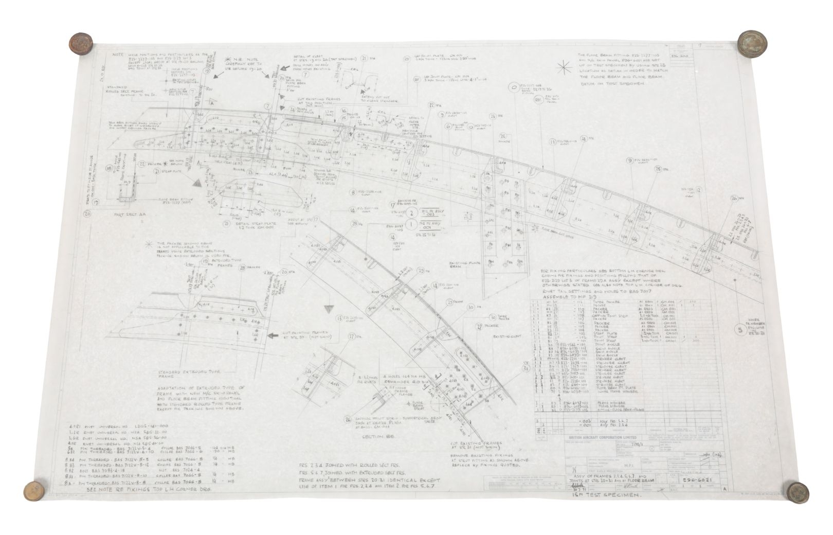 AN ORIGINAL BRITISH AIRCRAFT CORPORATION CONCORDE GRAPHITE TECHNICAL DRAWING E-96 6021 81cm x 119cm, with certificate of authenticity dated 16/10/2000 and with Brian Trubshaw facsimile signature, and two other Concorde prints, all contained in cardboard tube