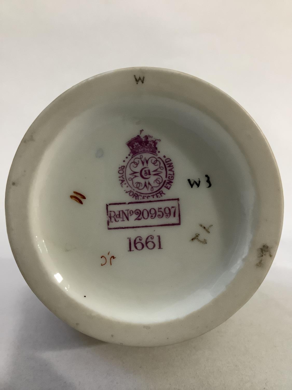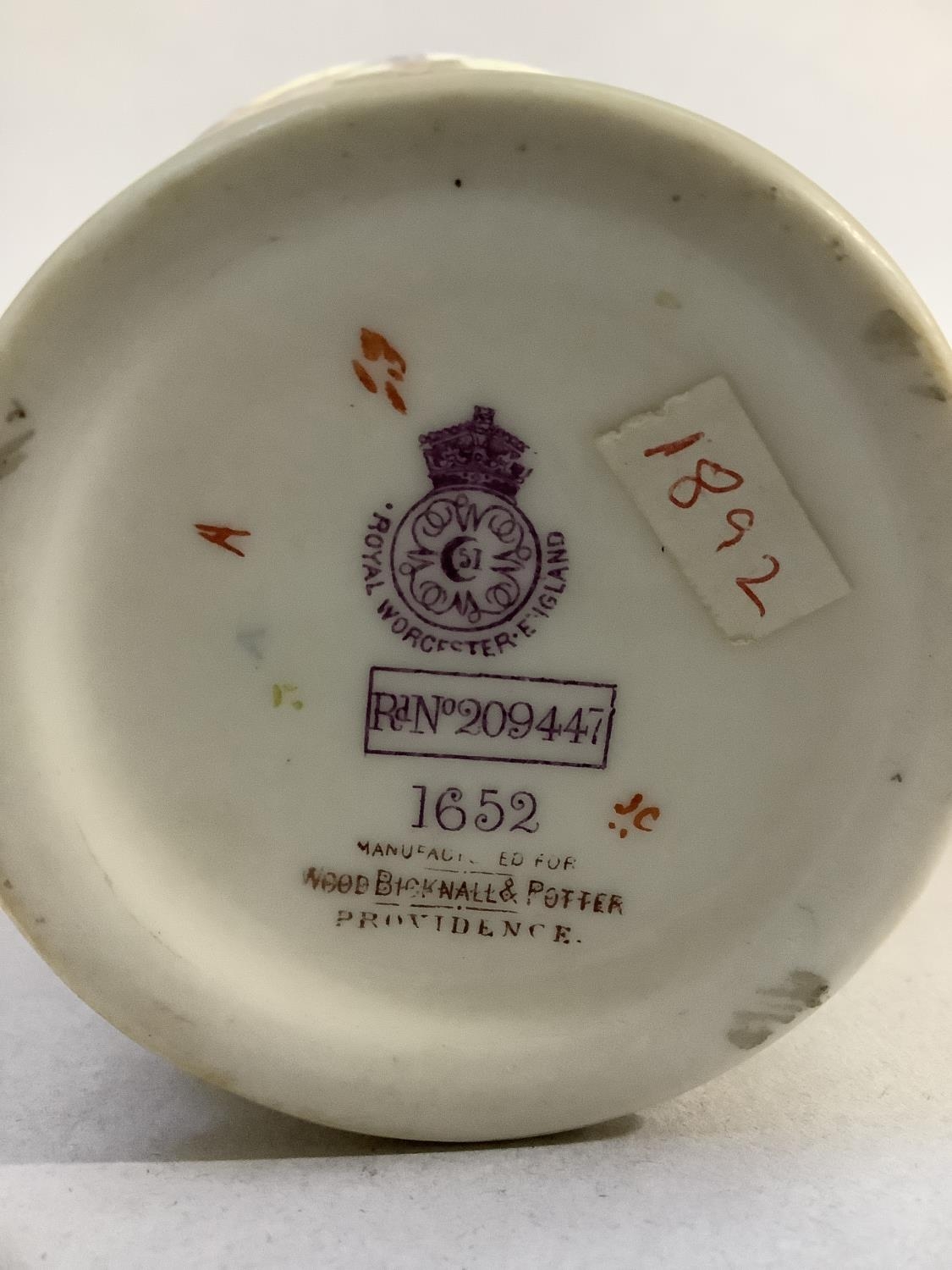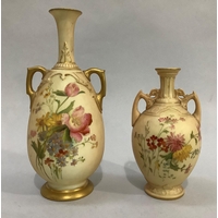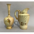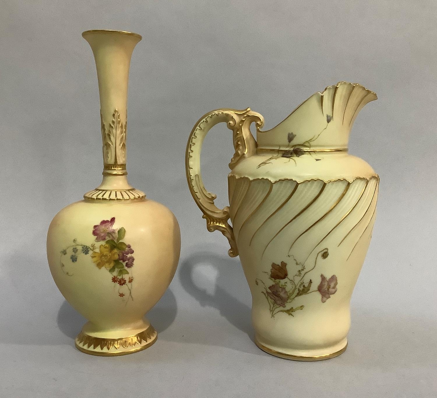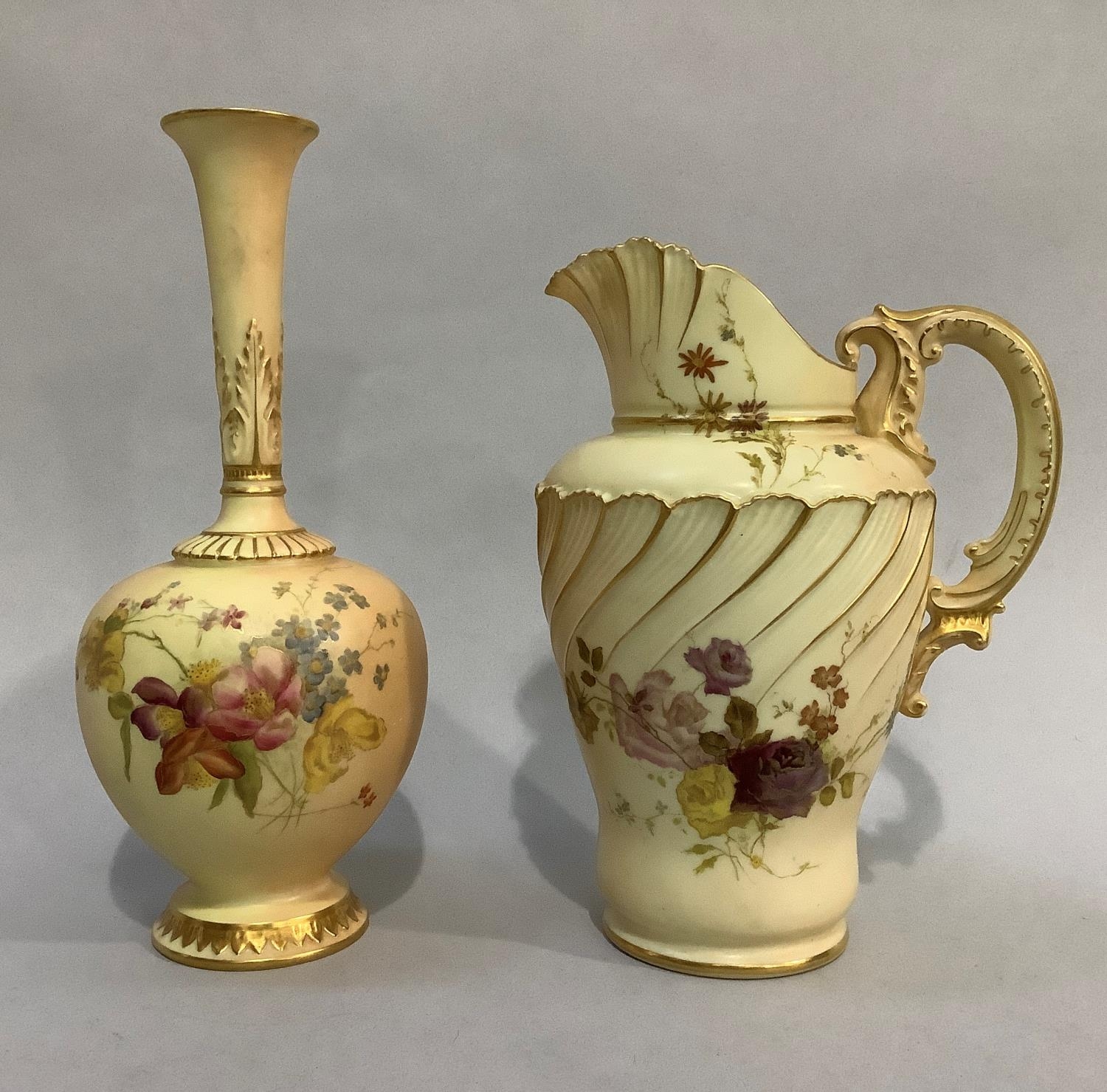 A ROYAL WORCESTER BLUSH IVORY AND FLORAL JUG of wrythen fluted form, shape no. 1652, printed mark for 1892, 20cm high and a vase with drawn neck, leaf moulded collar, painted with flowers, circular foot, shape no. 1661, 23.5cm printed mark 1896 (2)
