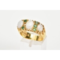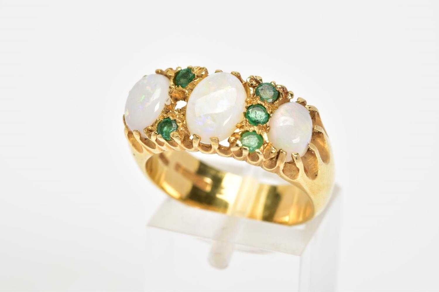 AN 18CT GOLD OPAL AND EMERALD RING, designed as three graduated oval opals, the central opal flanked by a vertical row of three circular emeralds, with 18ct hallmark for Birmingham 1975, ring size P, approximate weight 9.8 grams (one emerald missing)
