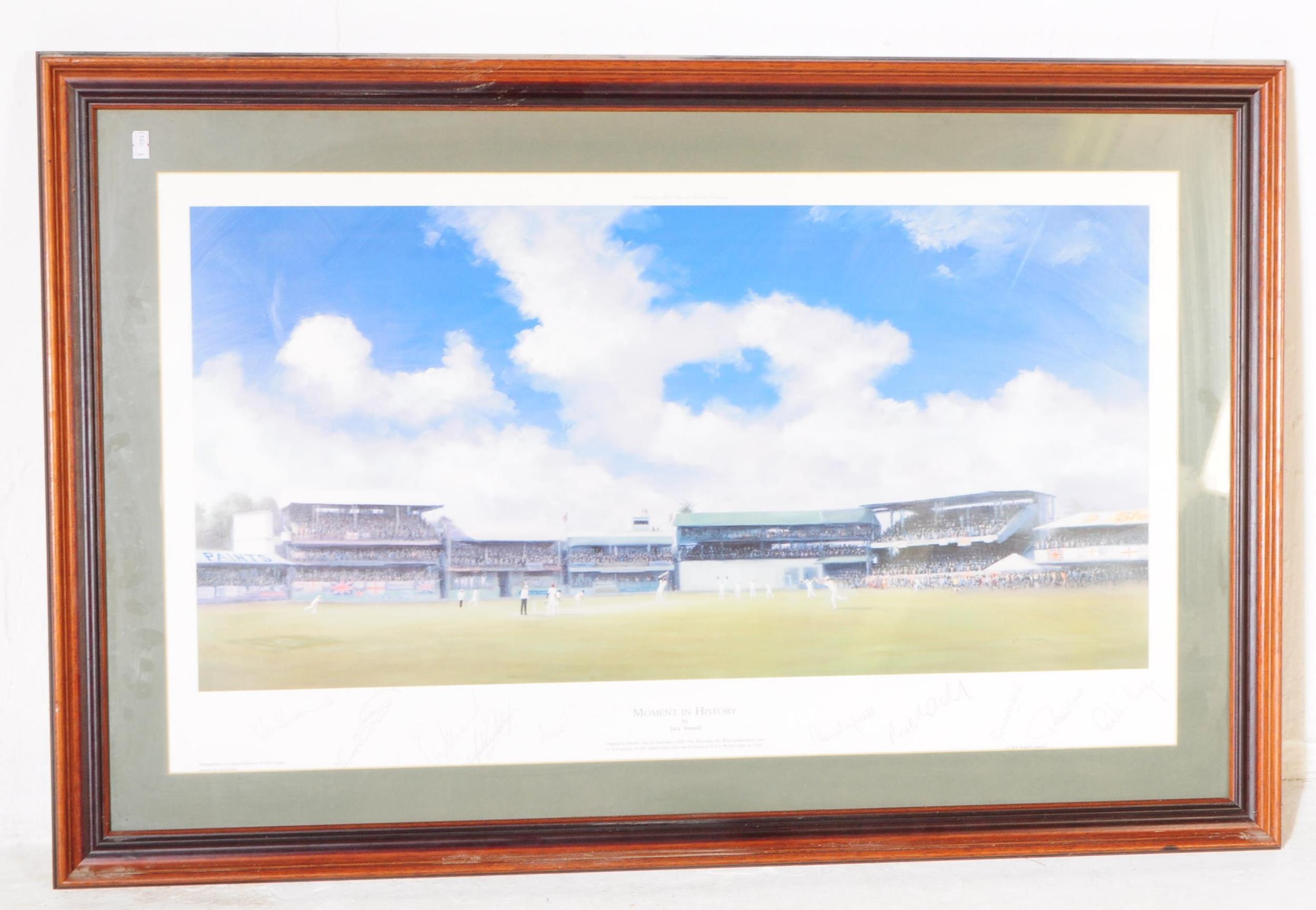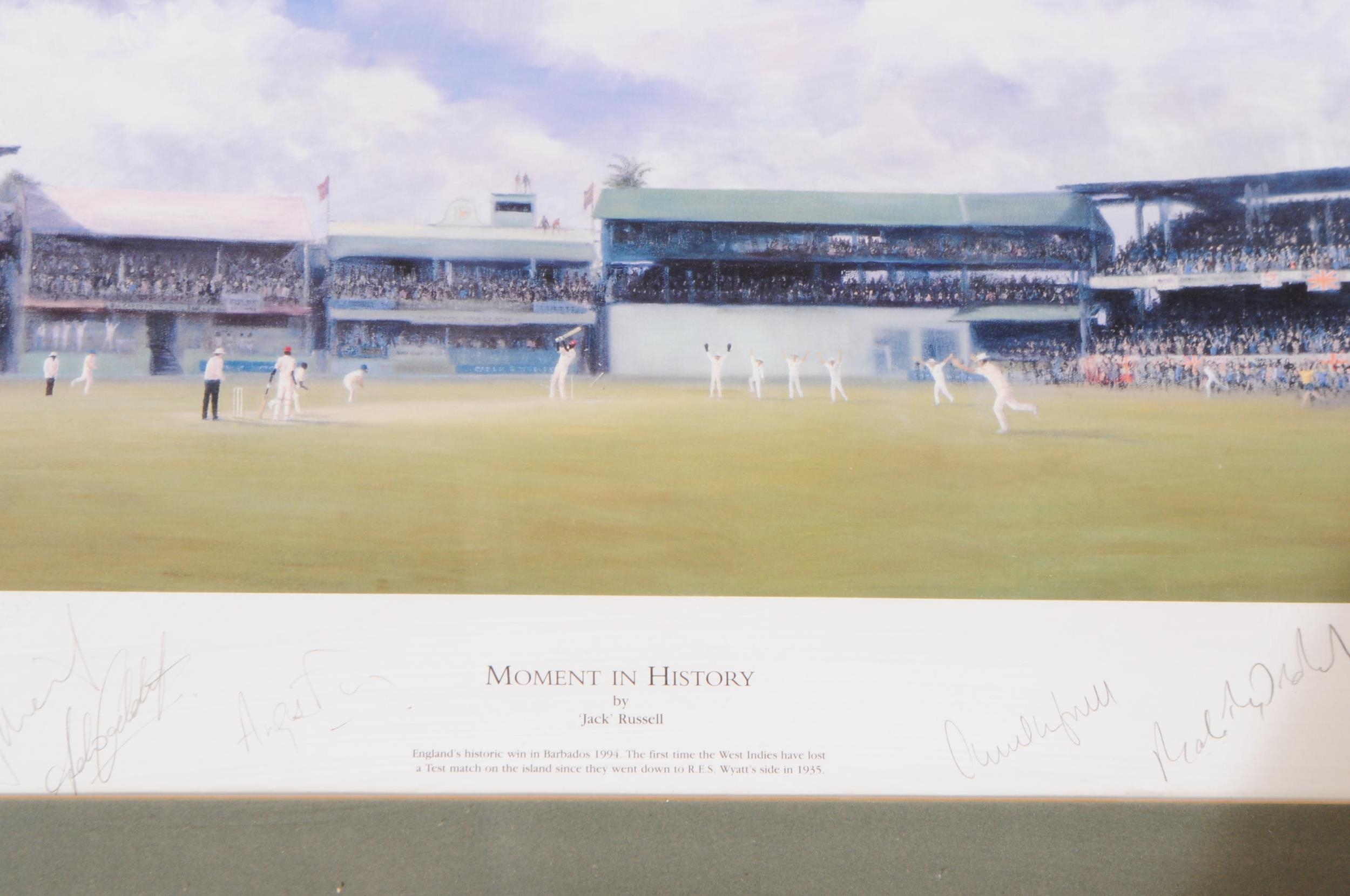 After Jack Russell - Moment in History - A 20th century limited edition century cricket print depicting England's historic win in Barbados, 1994. Signed by Jack Russell and the England Team. Framed and glazed.