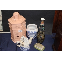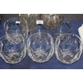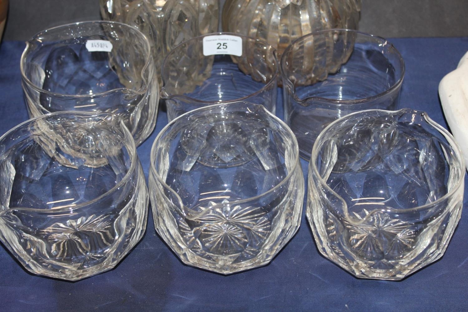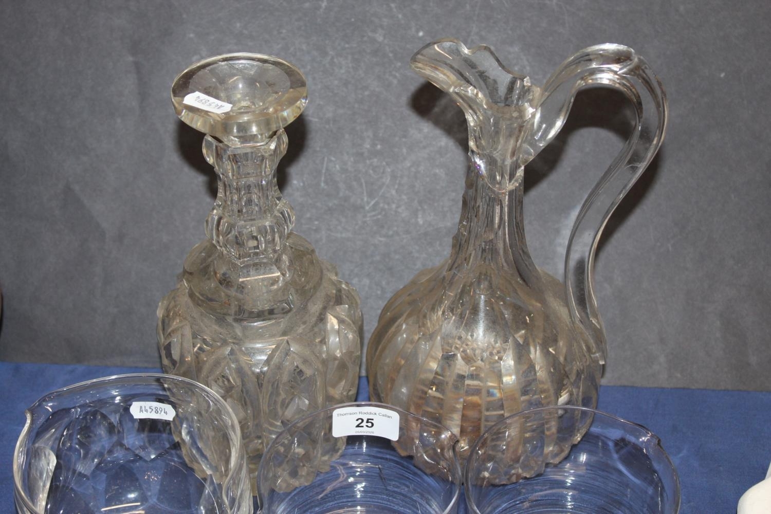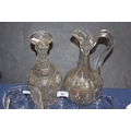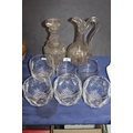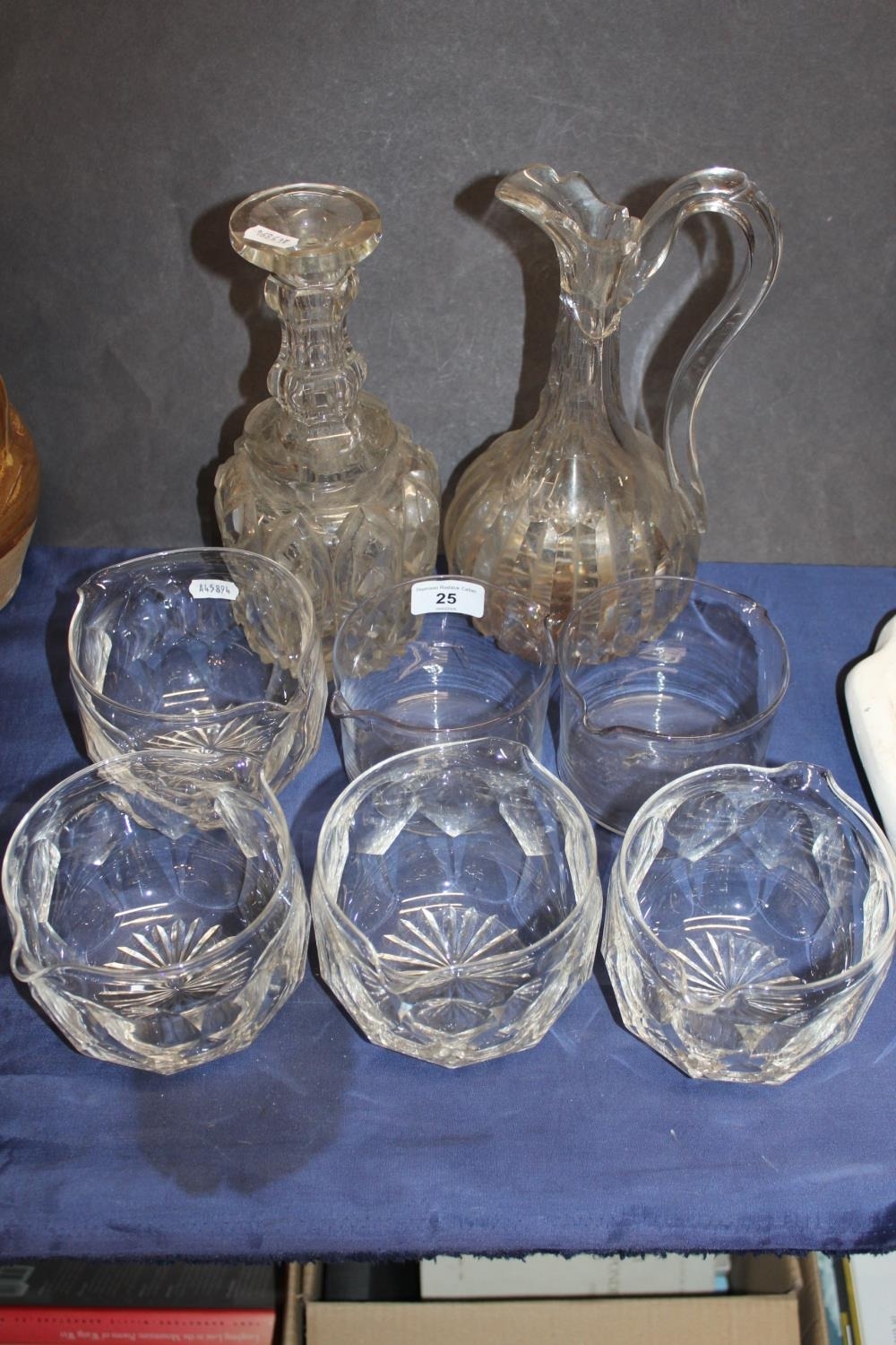 Six antique glass finger bowls, a glass decanter, and a ewer.