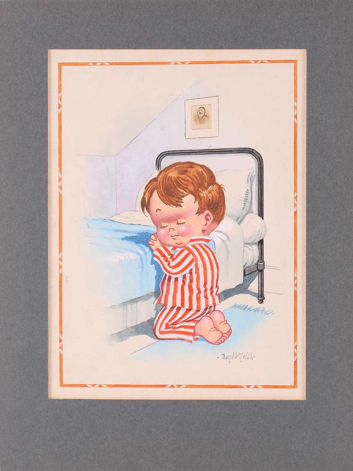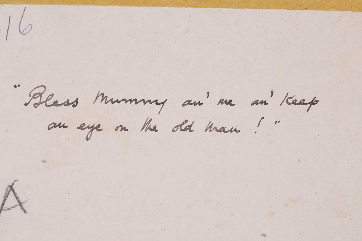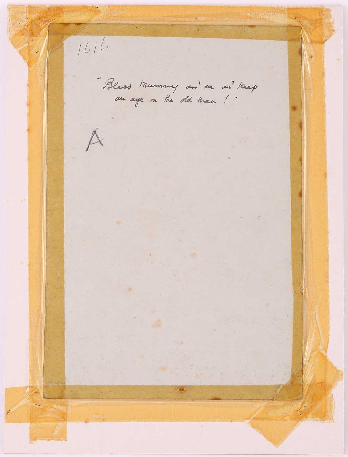 Donald McGill (1875-1962), an unframed signed watercolour, the handwritten text verso reading 'Bless mummy an' me an' keep an eye on the old man!', 22.5 cm x 16.5 cm in a card mount.