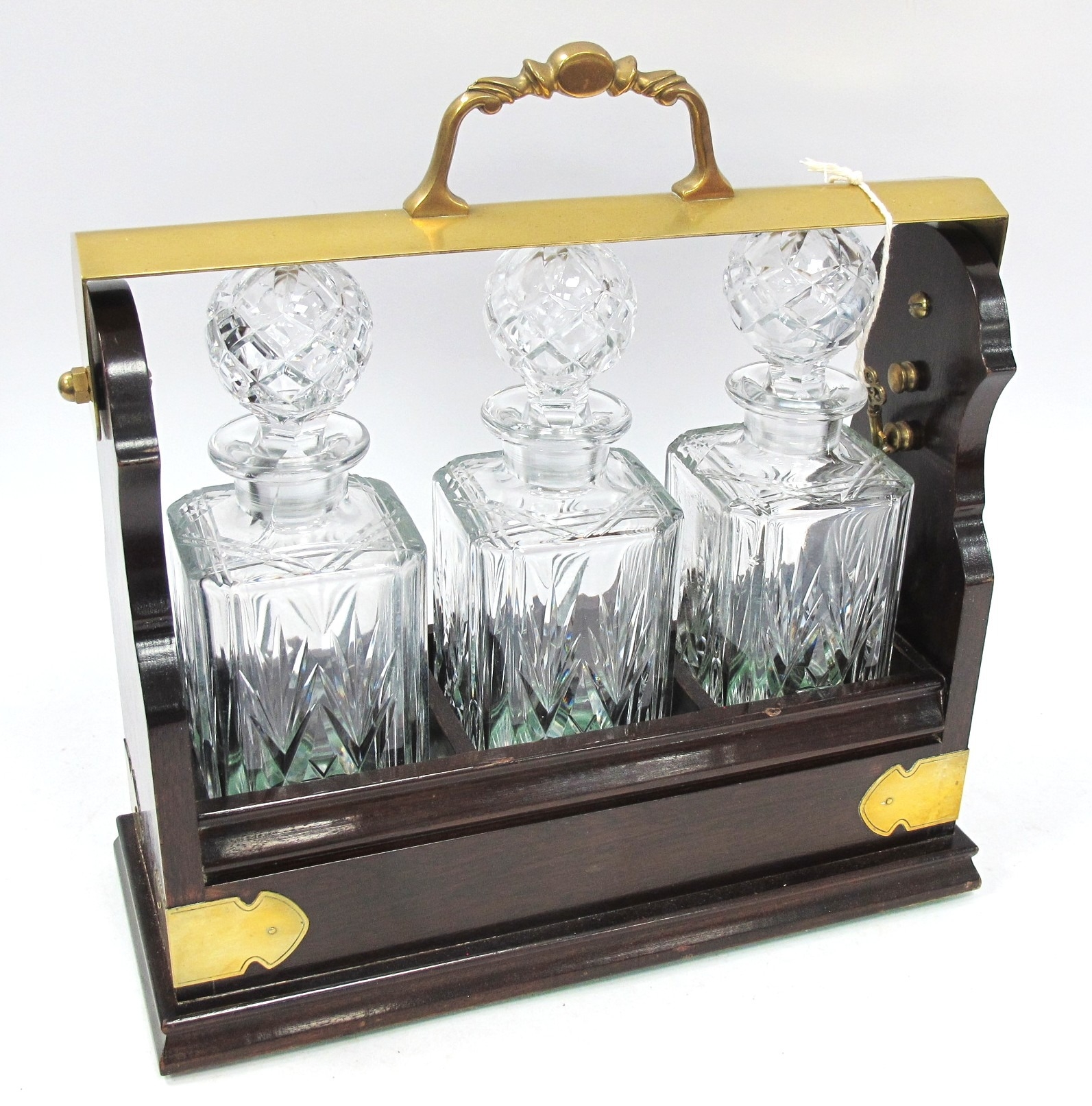Mahogany Tantalus with brass mount and fall handle locking mechanism, housing three glass decanters, approx 35cm long, with key.