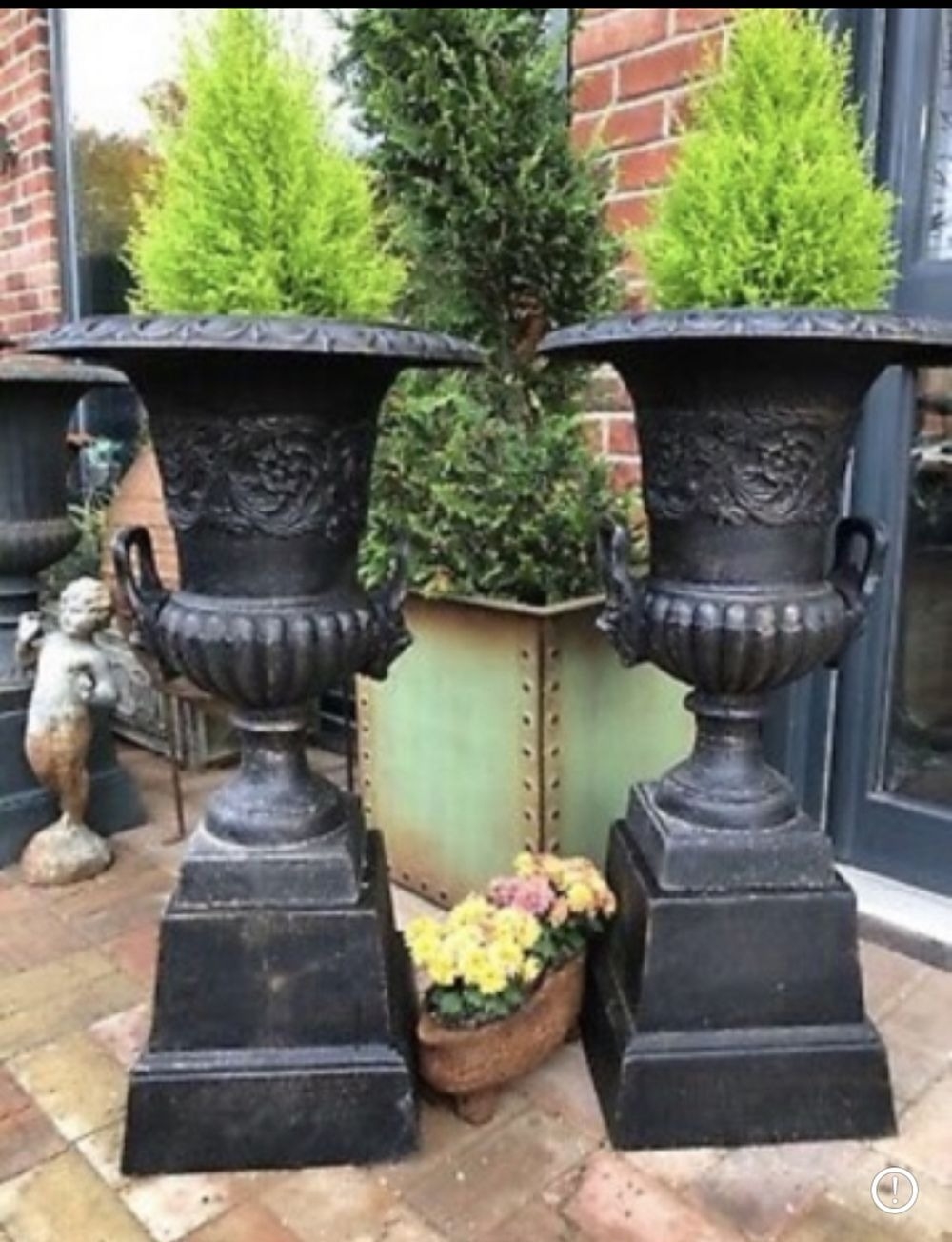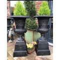 A PAIR OF CAST IRON GARDEN URN PLANTERS, resting on a graduated base. The urn with roll over lip with gadrooned detail. A handle on each side and a square base. Dimensions: 36 inches tall approximately.